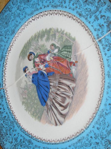 Painted scene: 2 woman & child in 19th century dress standing outside; surrounded by white field ringed with scalloped 23 karat gold trim, with outer perimeter blue field trimed with gold.