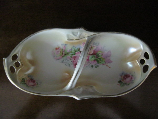 This piece was from my father-in-law's estate. Sat on my mother-in-law's dresser for at least 40 yrs maybe longer. May be a relish dish? The background is cream with light orange brushes of color on sides, pink roses on a cream background and trimed in gold. The markings on the bottom are not ledgable. The ink marking is worn and there is also a gold marking. Any imformation and worth of the piece would be appreciated.