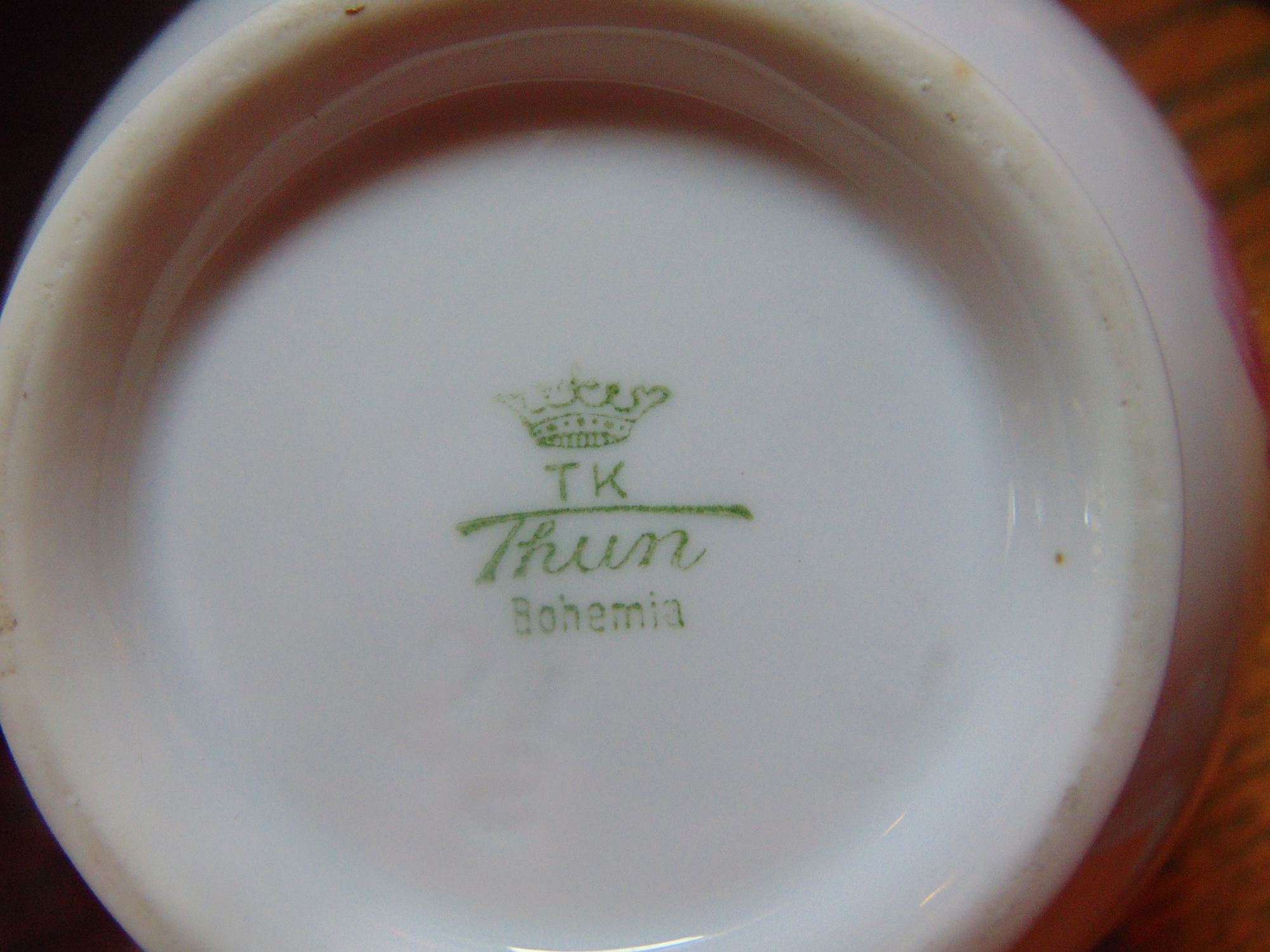 I was handed down a complete 8 piece china set and 1 odd piece from my Grandmother, but can not find any information on it. There is a name stamped on the bottom but no date or numbers, the china was wrapped in news paper frome the early 1960's, The name on the bottom is TK Thun Bohemia. Could someone let me know if these are worth anything, so I can get insurance on them if they are