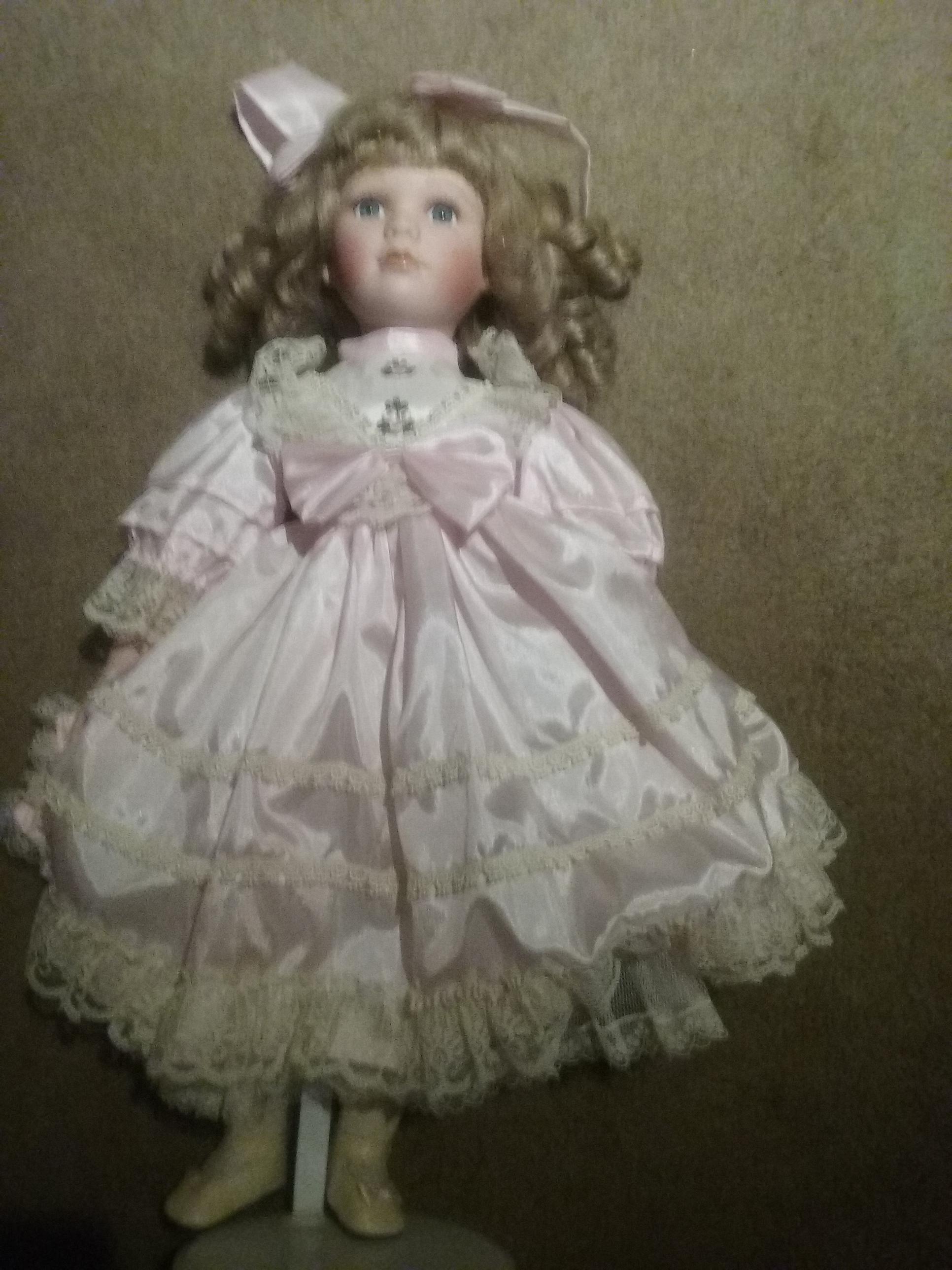 china head hands and feet. rest fabric. no markings anywhere. light pink dress with a pink boe carrying a heart shaoed purse.
