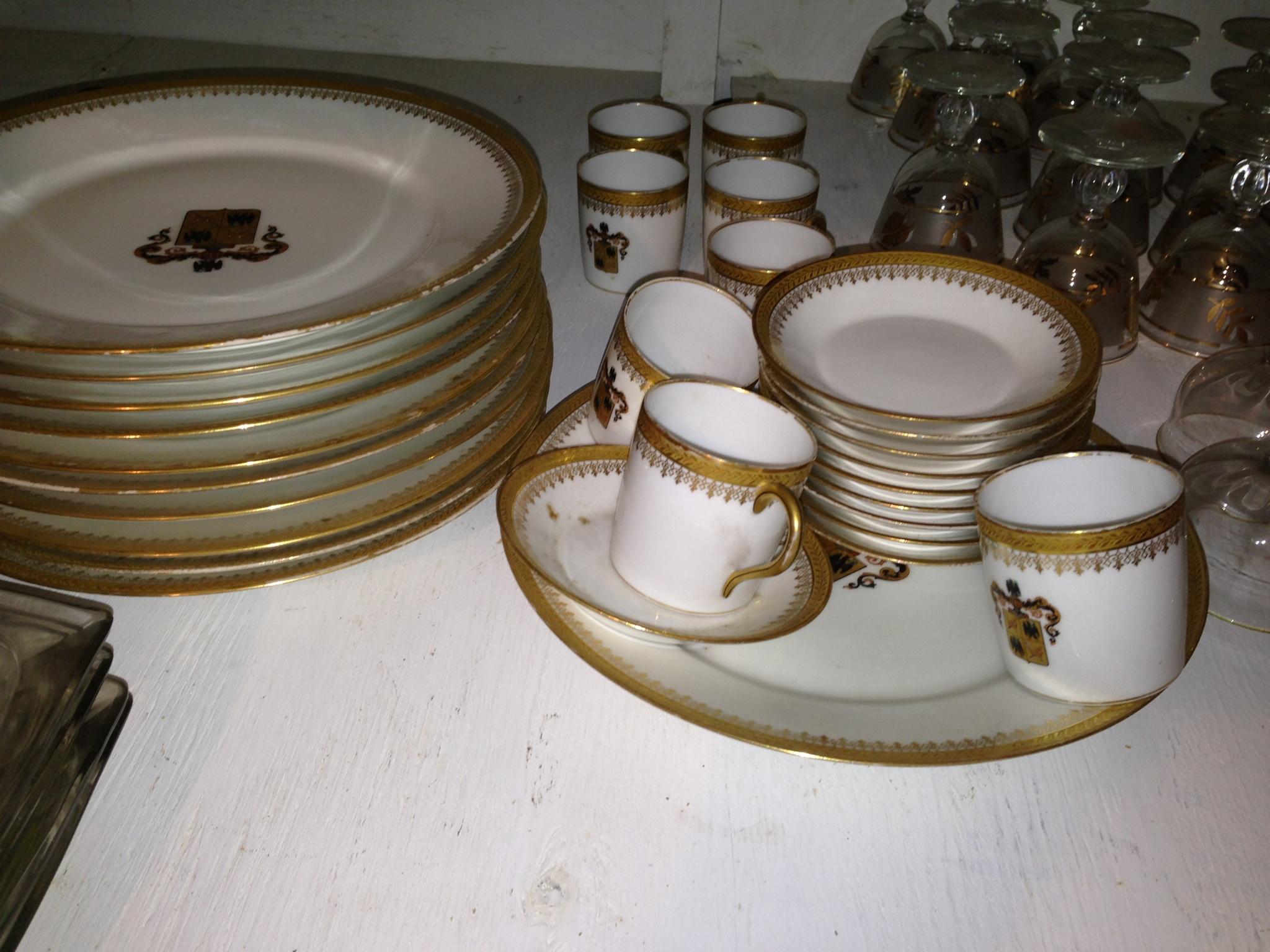 There is a crest or coat of arms on the plates and cups, with a lot of gold trim and inlays. The crest has large black birds holding something like a wreath, and a crown, sword and arrow. The plates and saucers have very intracate gold edging an inlays.