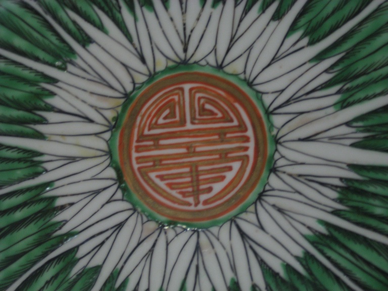 Distinguishing marks "Made in china" stamped on base; pattern is handpainted butterflies and leaves; plates have a handpainted red-lined symbol on them