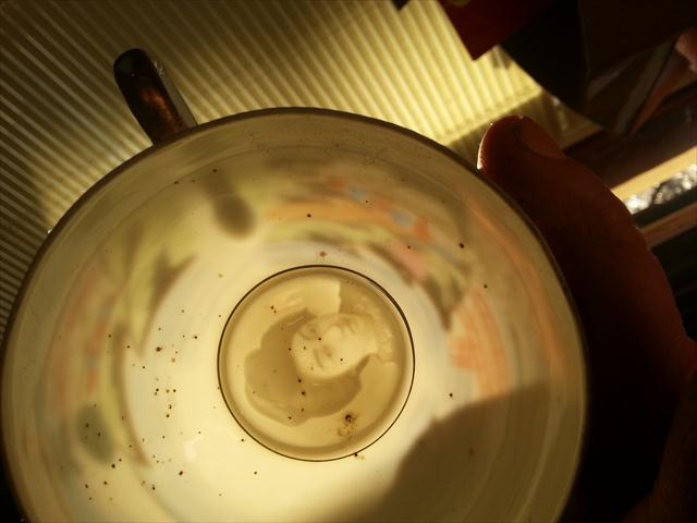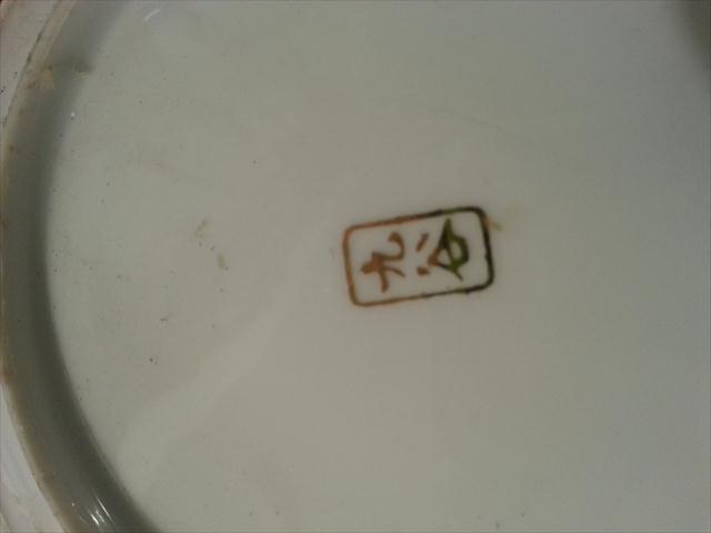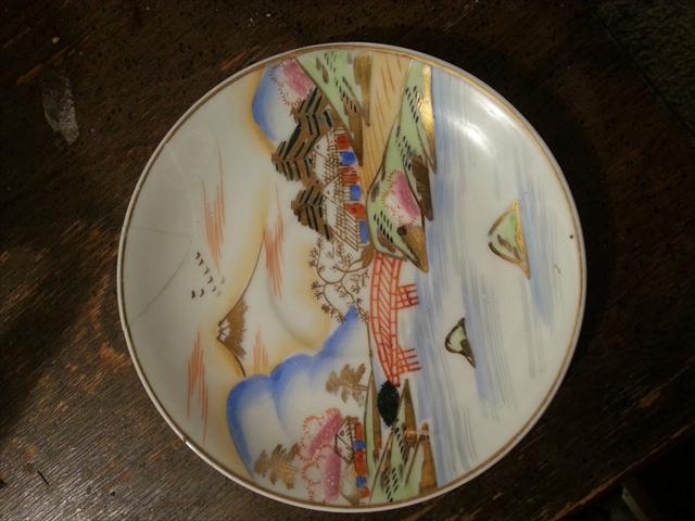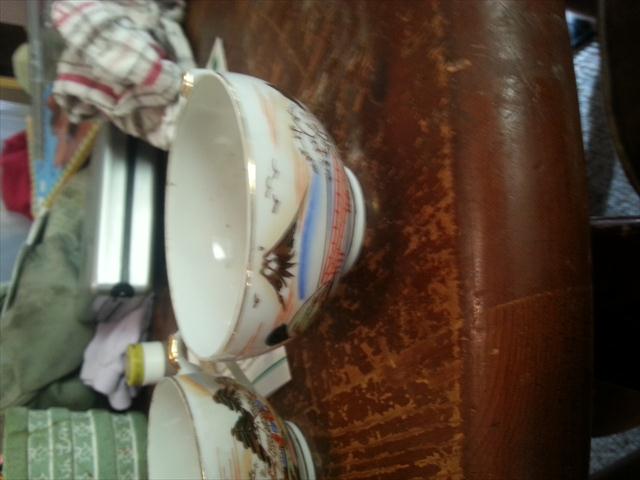 We picked up a china set that has the geisha girl lithophane in the bottom of the teacups, and a landscape scene similar to hayasi Kutani. The mark in the bottom is in japanese or chinese letters. There is a lot of what appears to be gold painted on the picture. Village with lake and a dock, I think, and trees with mountain in background.