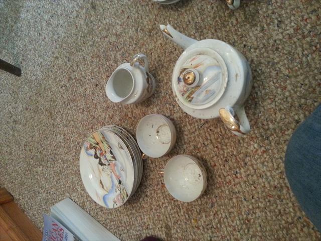 The set has 6 small saucers, 6 larger saucers, 6 tea cups, large teapot with lid, creamer, and a sugar bowl. The set is not perfect - we see a few chips, a small saucer has two pieces glued back onto it, etc.