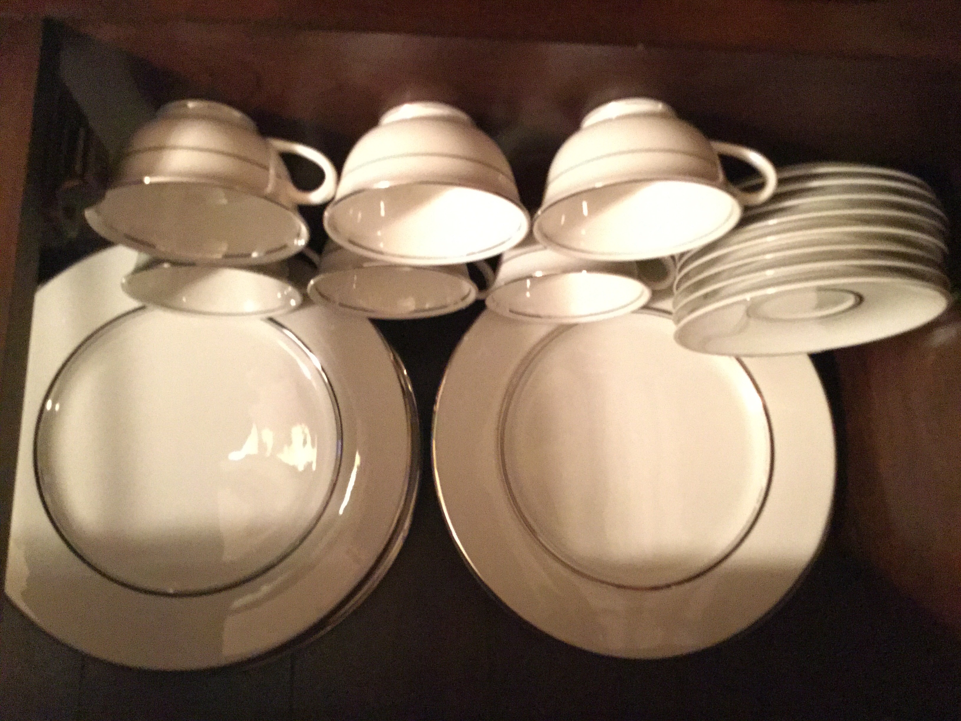 This is a set of 8 dinner plates, 8 cups & saucers and 1 serving dish! They are absolutely flawless! Nancy prentiss fine china, made in usa, new Kensington PA. Silver sonnet
