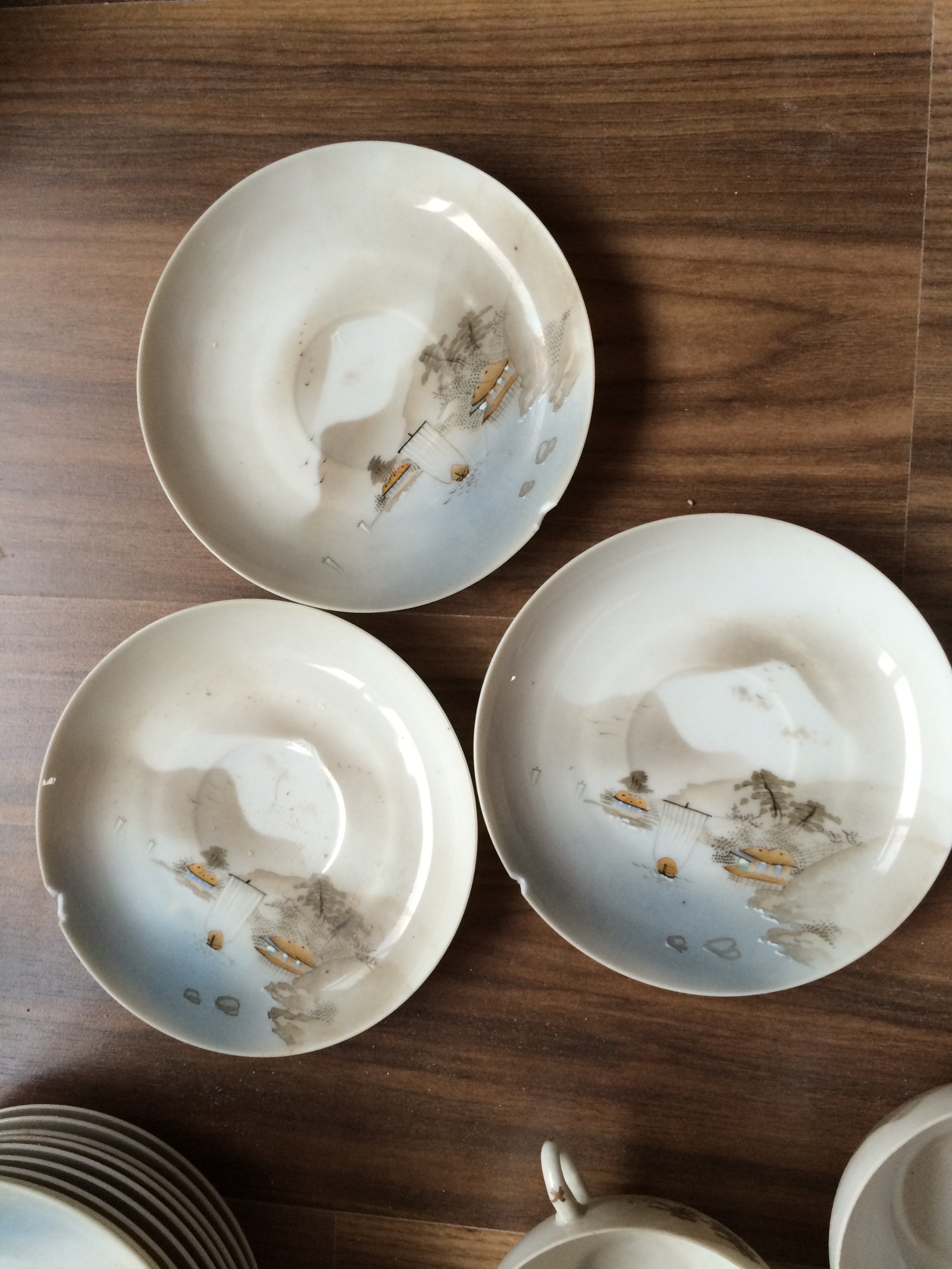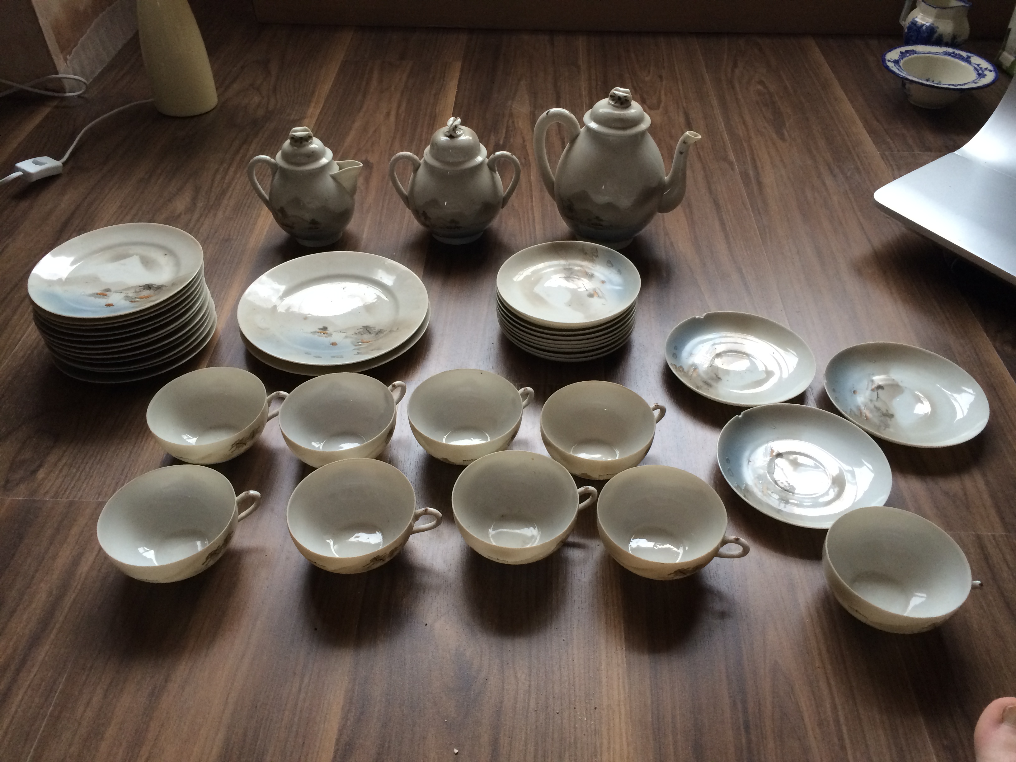 Unfortunately some items are damaged, but the set includes, a tea pot, milk pot, cups, saucers and small plates.