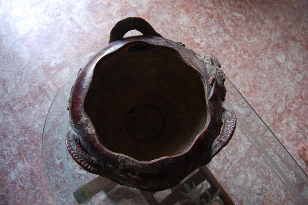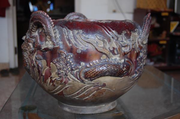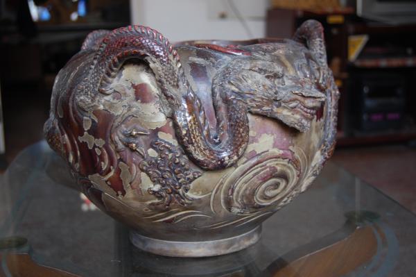 A vase with the Chinese dragon engraved on it. The body of the dragon form the two handles to hold the vase.