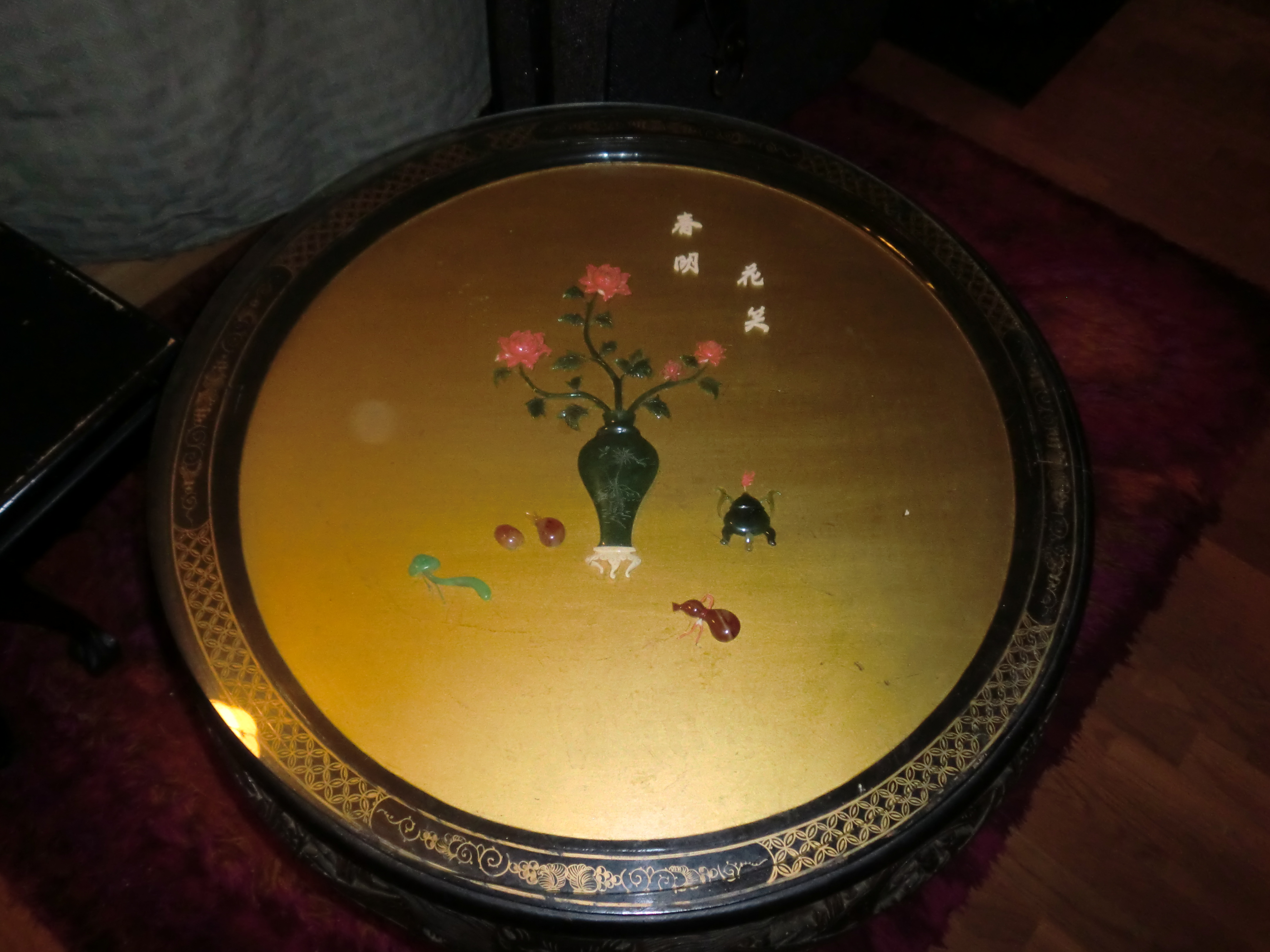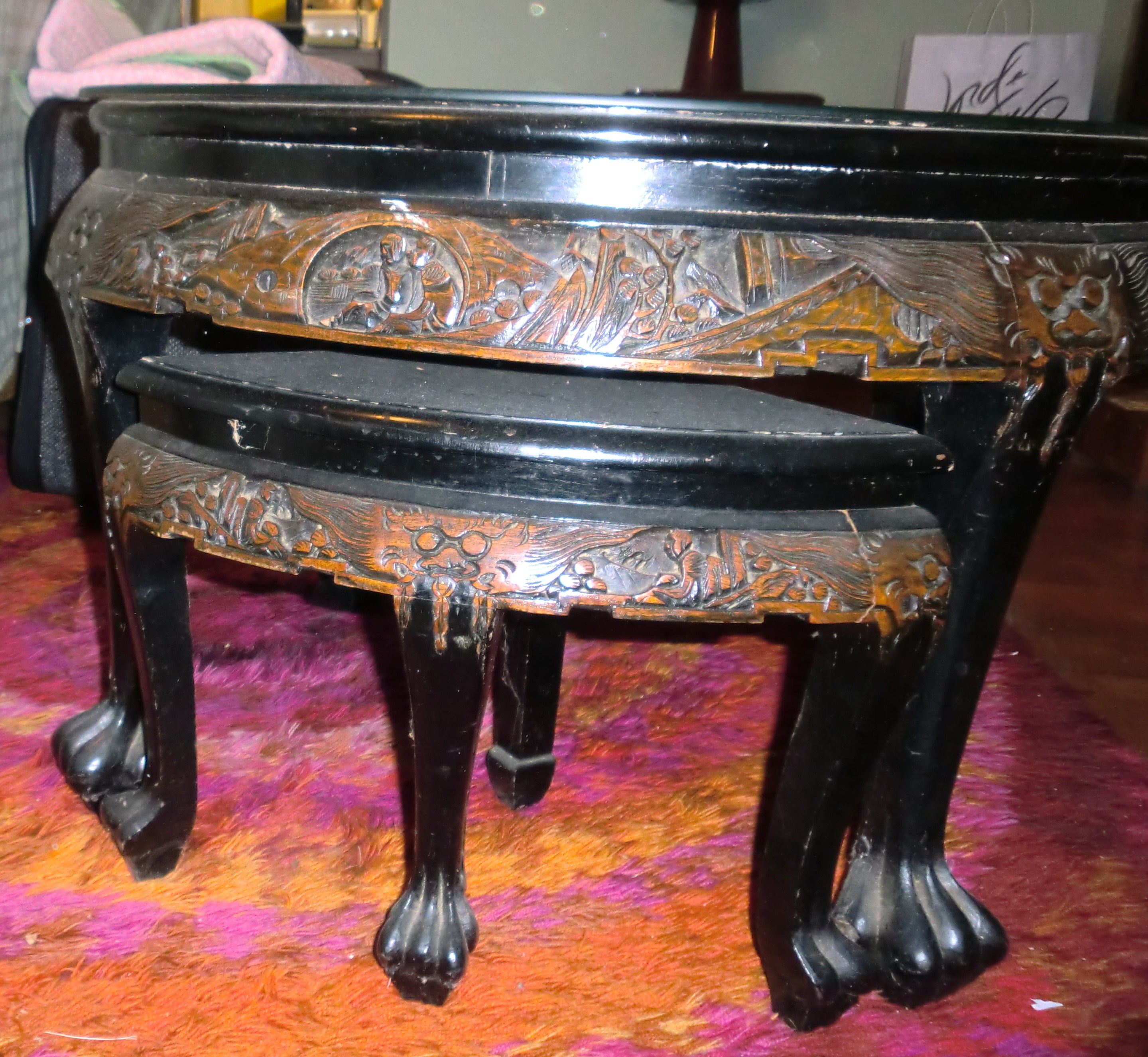 Distinguishing marks carved wood with glass top and carved gem/stone designs on the top