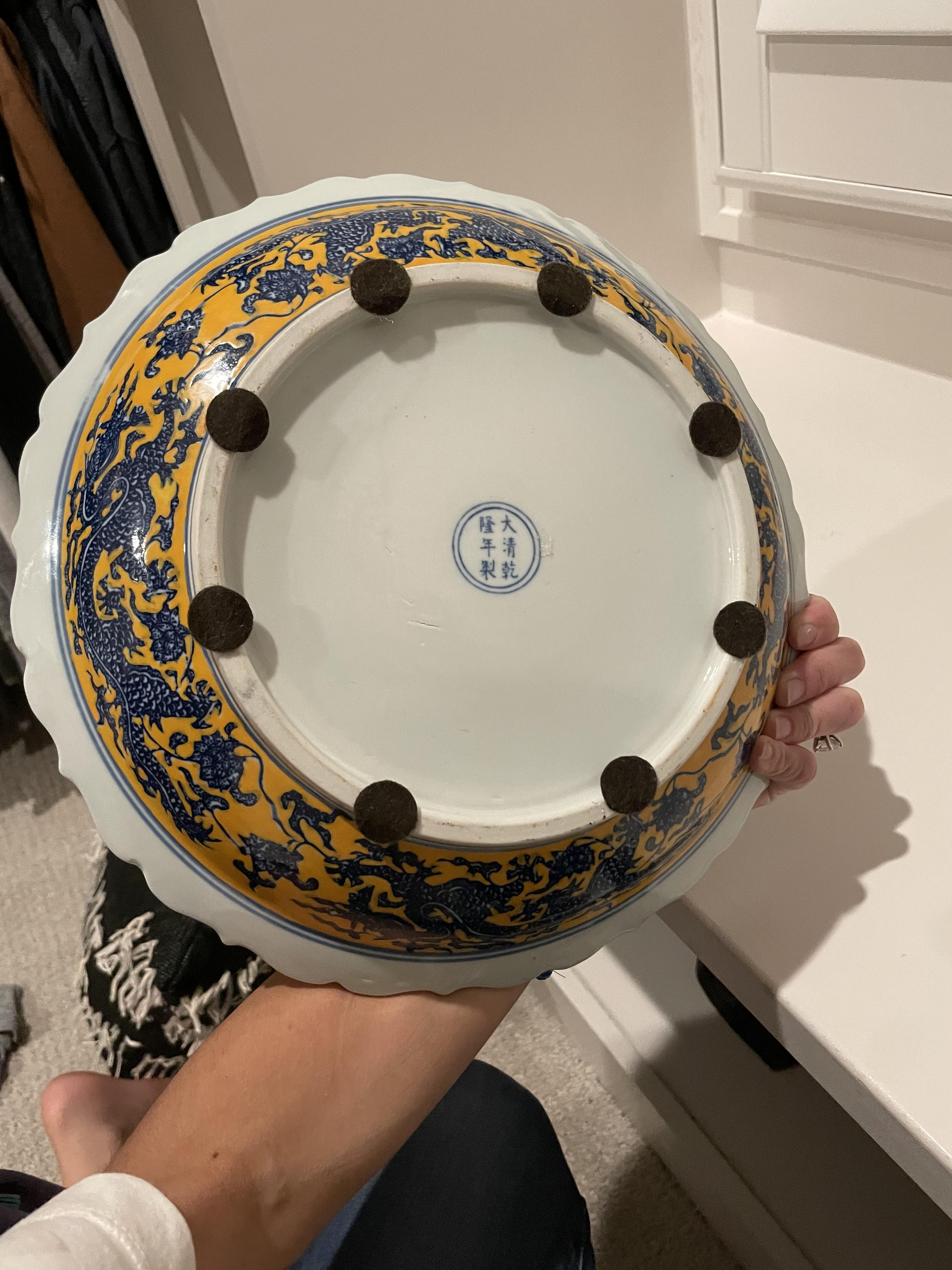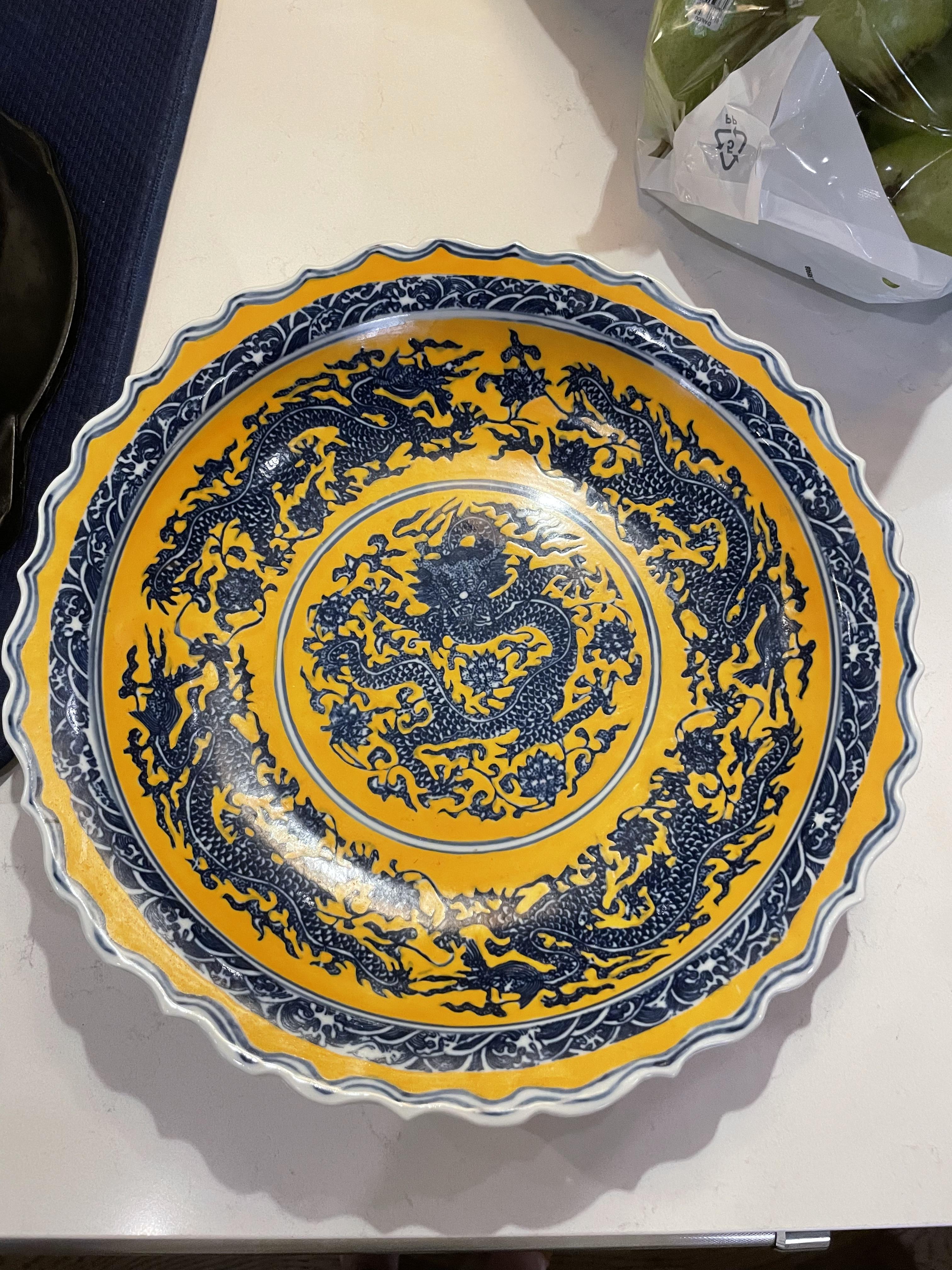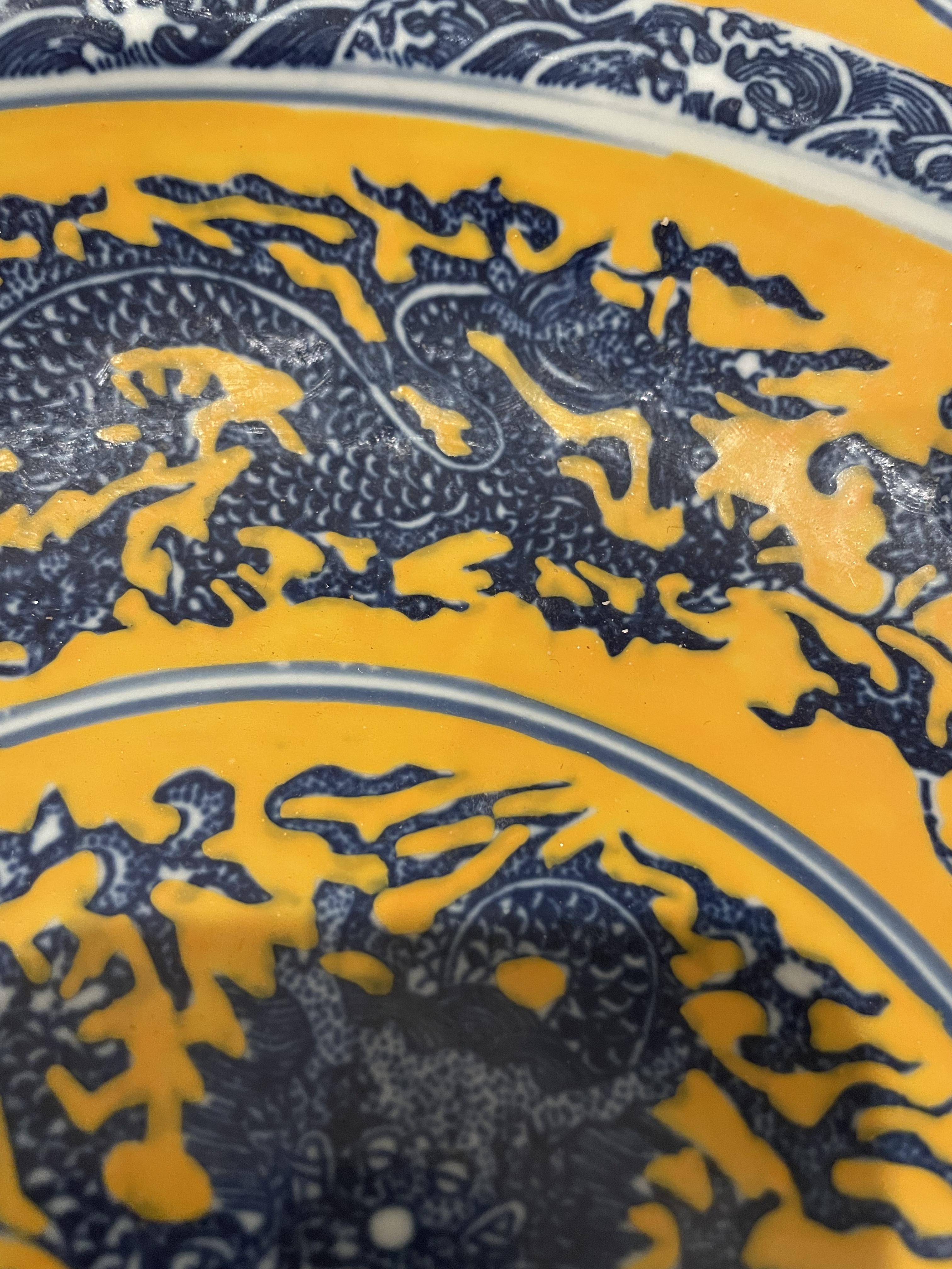 Blue and white porcelain bowl with yellow opaque glazing. Dragon imagery in blue and white. Chinese markings in circle on back. Scalloped edge