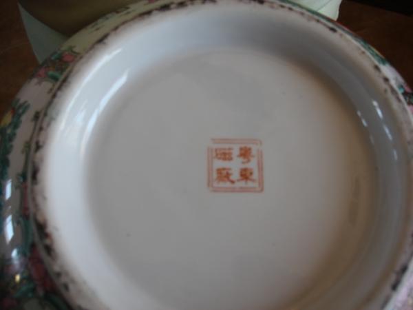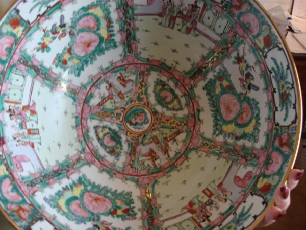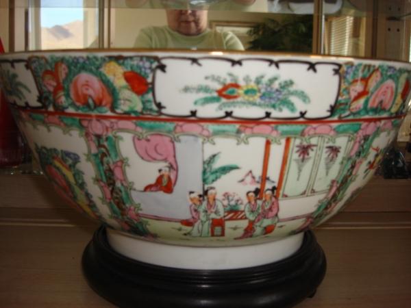 This is an excellent condition Chinese Bowl, it is handpainted with gold trim and accents in the pictures.  It is artist signed on the bottom and is 14 inches in diameter.  It has a black stand.