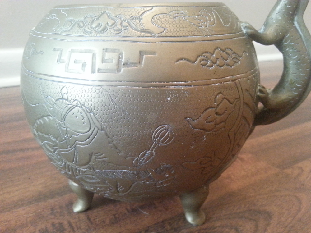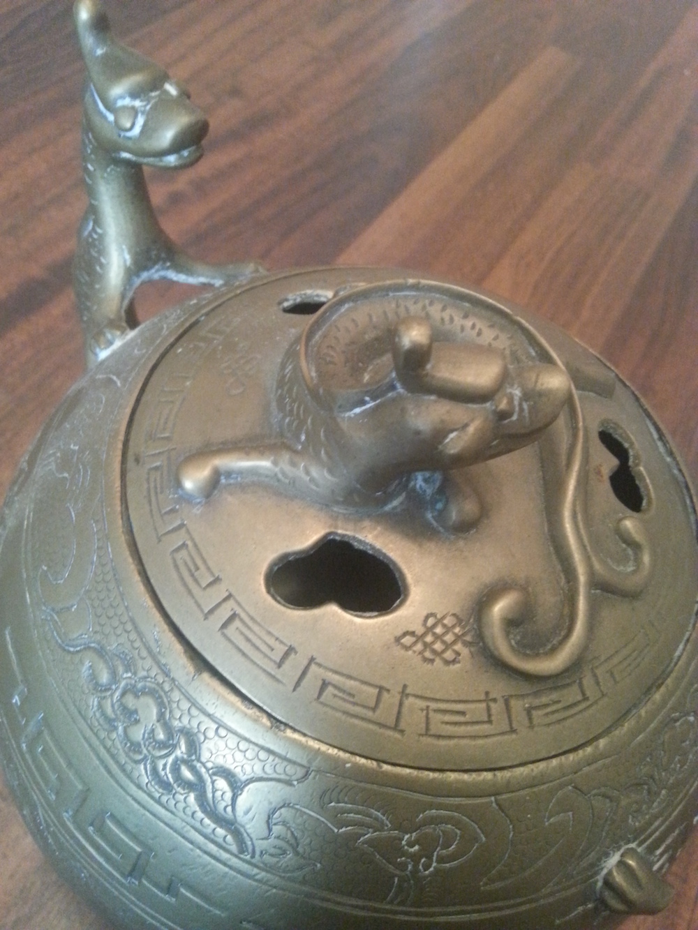 Chinese/Japanese 19th/20th century bronze incense burner, with dragon cover with with 3 infinity openings on top, body decorated with warrior on horseback, clouds, and other, round base with short tripod footthe cover and handle are dragons, one of the dragon handles is missing.