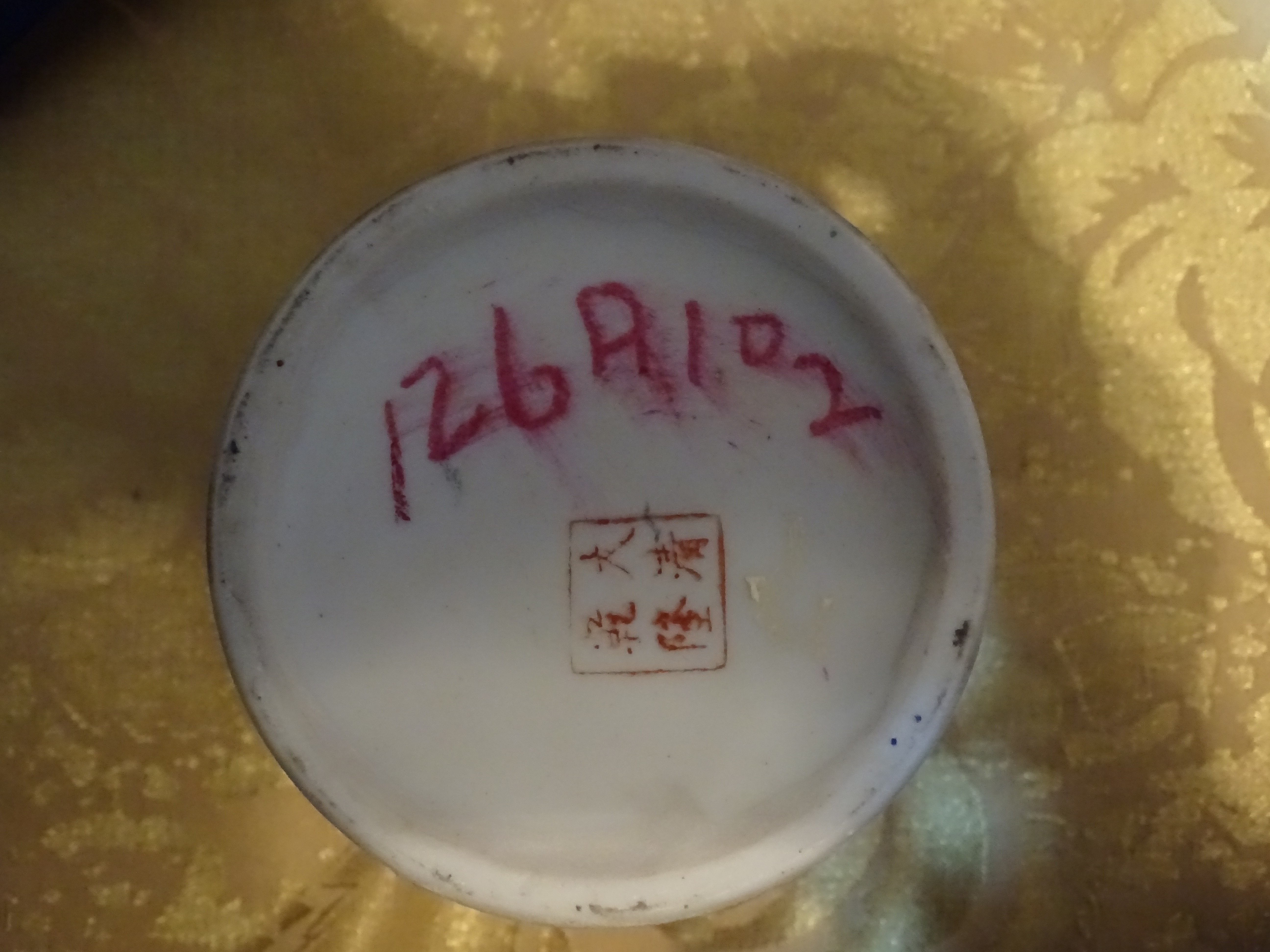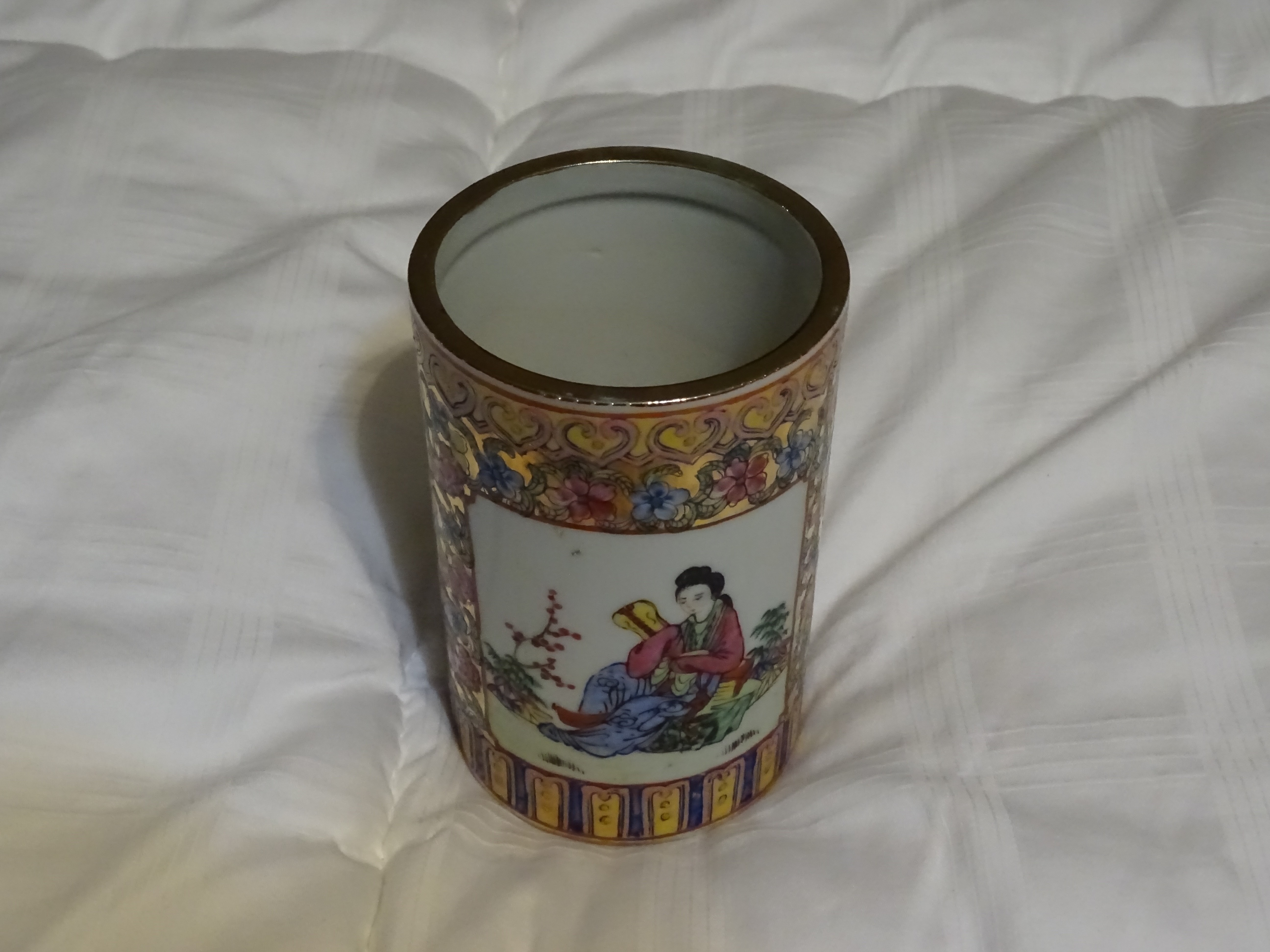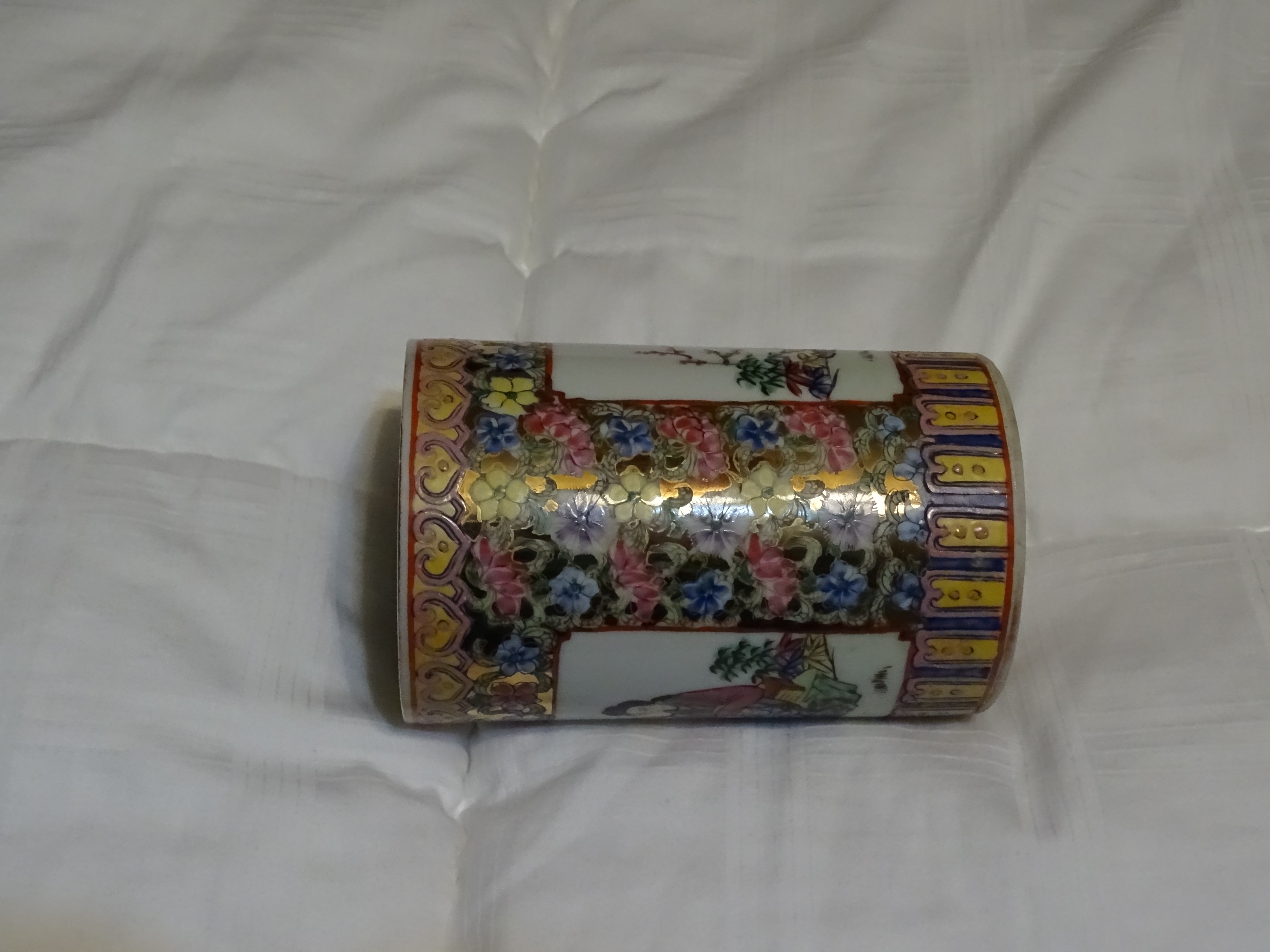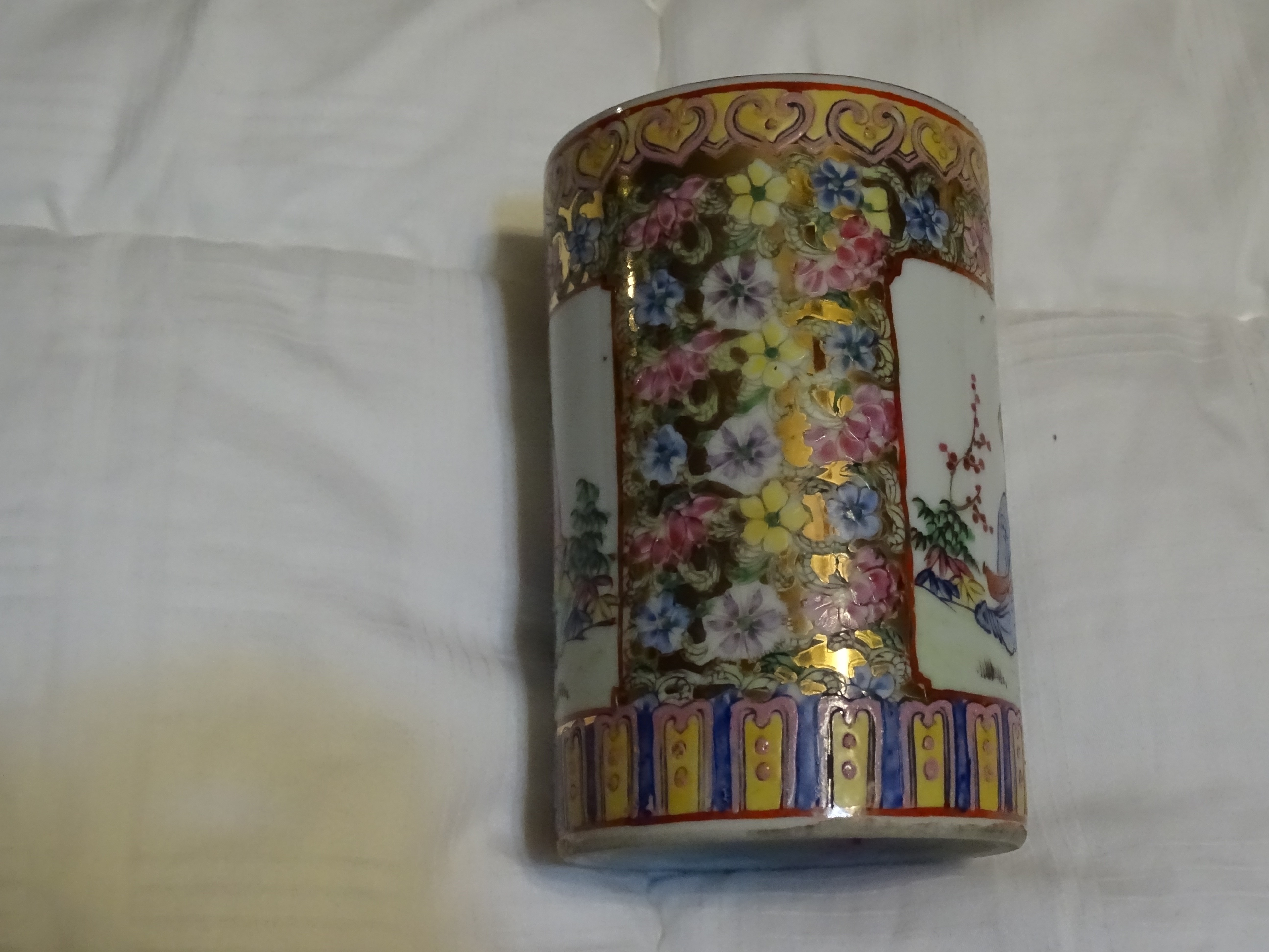 Chinese container, not sure if vase or some type of container. Stamped on bottom with origin information. Many flowers hand painted as well as a picture of a woman sitting in a garden. Rim with goldleaf and backround in goldleaf. 12.5cm tall 8cm wide. 11.6oz.