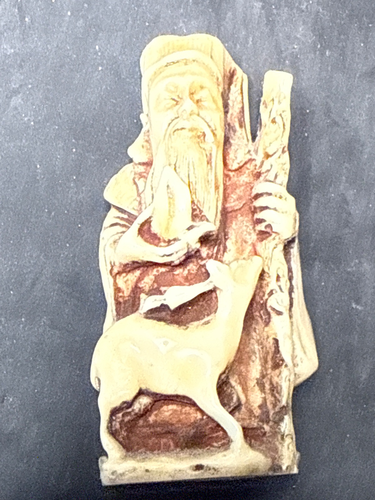 Physical Description: This intricately carved soapstone figure depicts an elderly man, likely a sage or philosopher, holding a staff in one hand and a small object in the other. A deer is positioned at his feet, symbolizing peace and harmony. The figure measures approximately 6 inches tall and 3 inches wide, with a weight of around 1.5 pounds. The soapstone exhibits a creamy beige color with reddish-brown veining, enhancing the details of the carving.