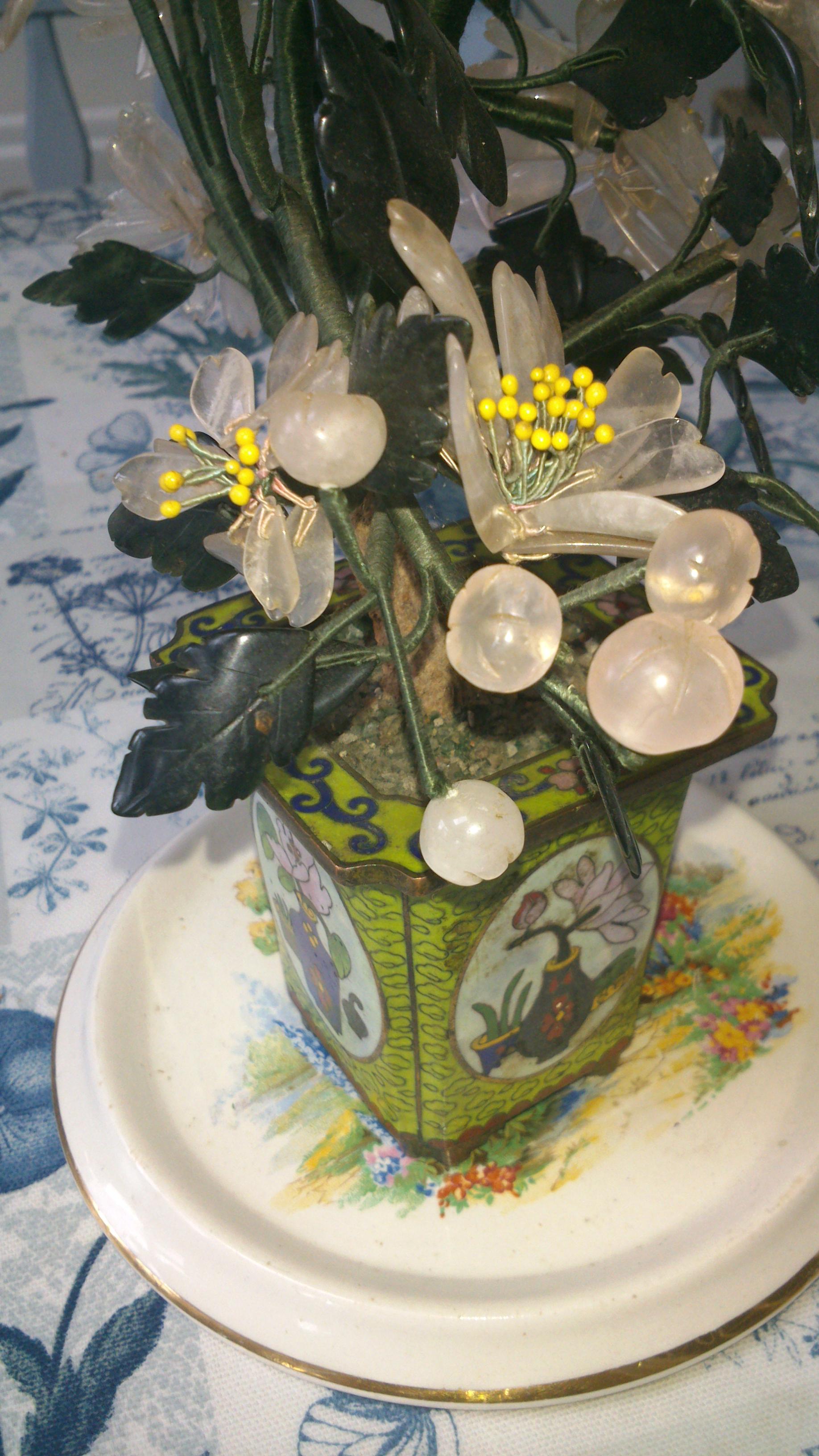 Chinese Cloisonne Planter with a flowering Bonsai like tree. The petals are pale pink and Quartz like , the leaves are dark green Jade like material. I came across it at an auction in Ireland and was looking for any information I can get on it.