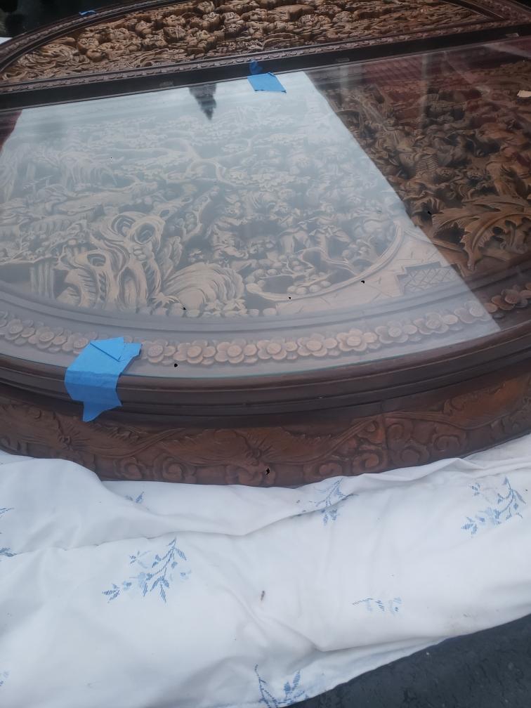 Purchased it at an estate sale it has two leaves and 8 chairs in near perfect condition