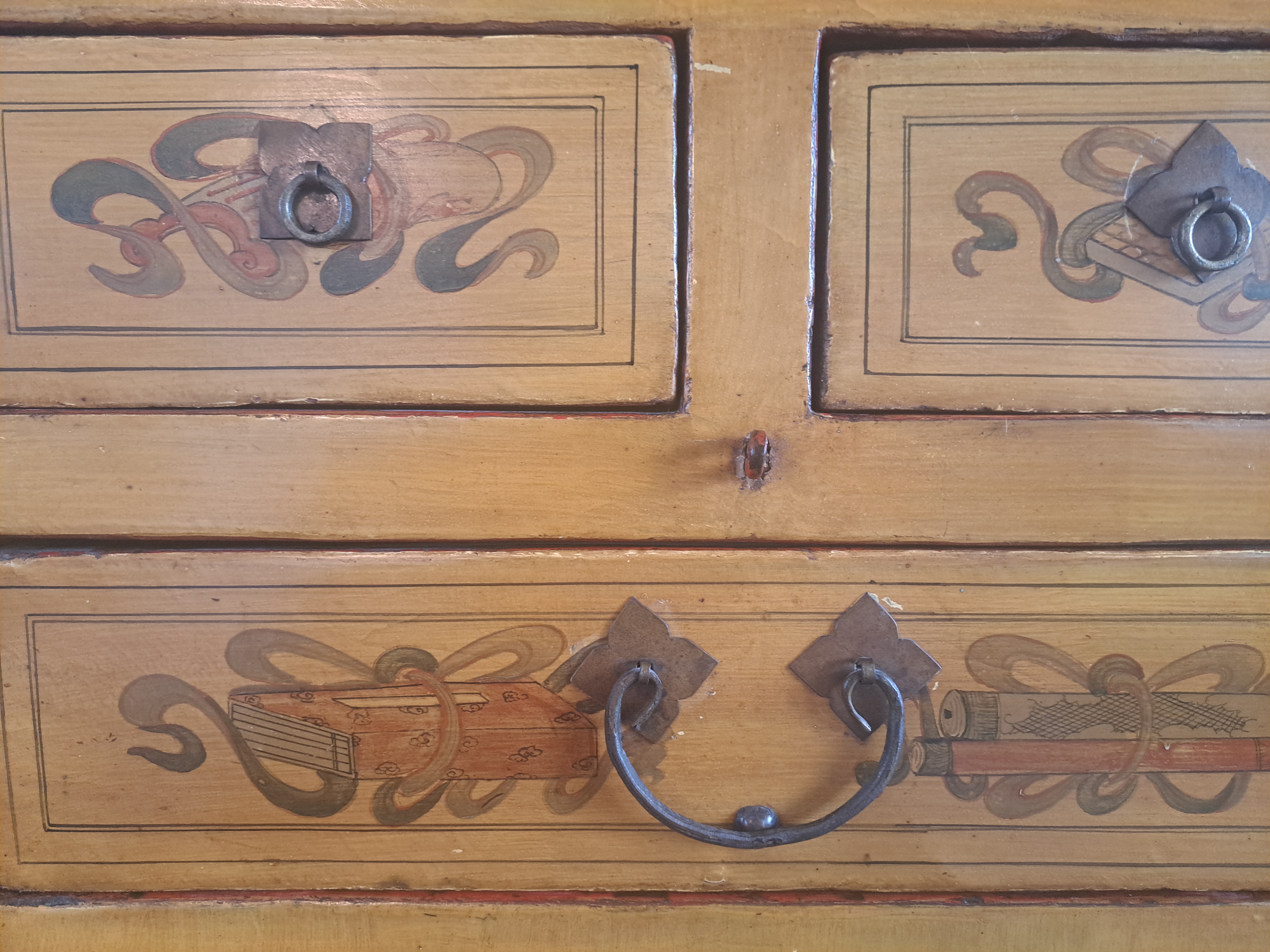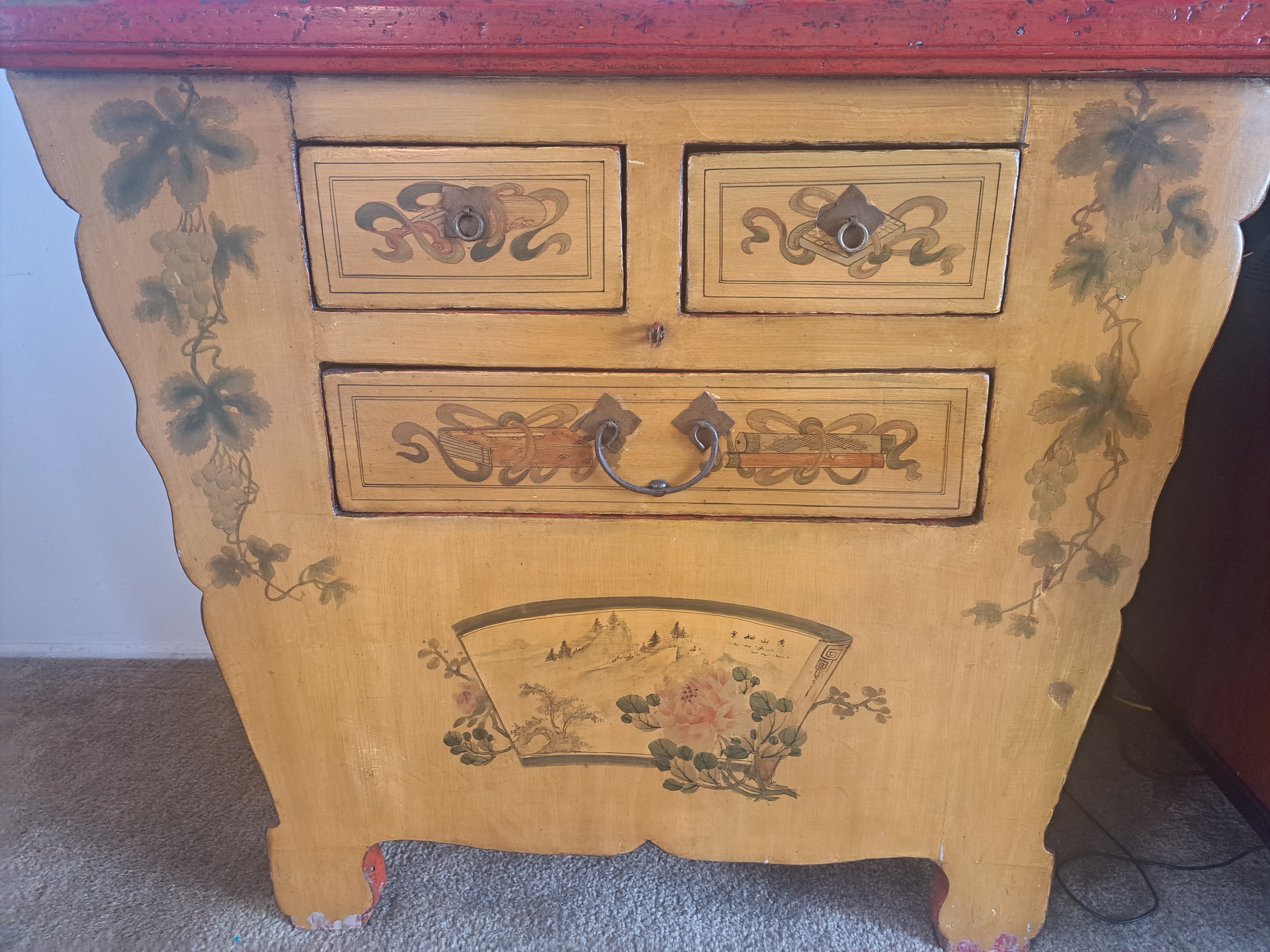 This dresser looks to be Chinese or European. There is Chinese art painted on the front which leads me to think it is Chinese in origin but it could just be a style used by the original artist. The dresser was purchased from a Laguna Beach antique store over 10 years ago. It is made of wood but I can't tell what type. It almost seems to be cherry.