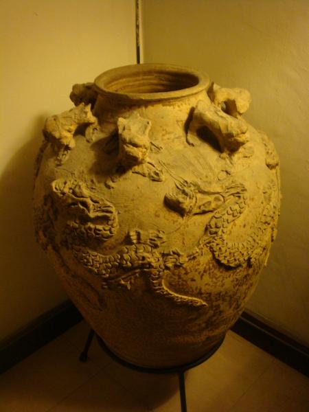 Embossed designs of scaled dragons and lions or fu dogs guarding the top opening of the jar.