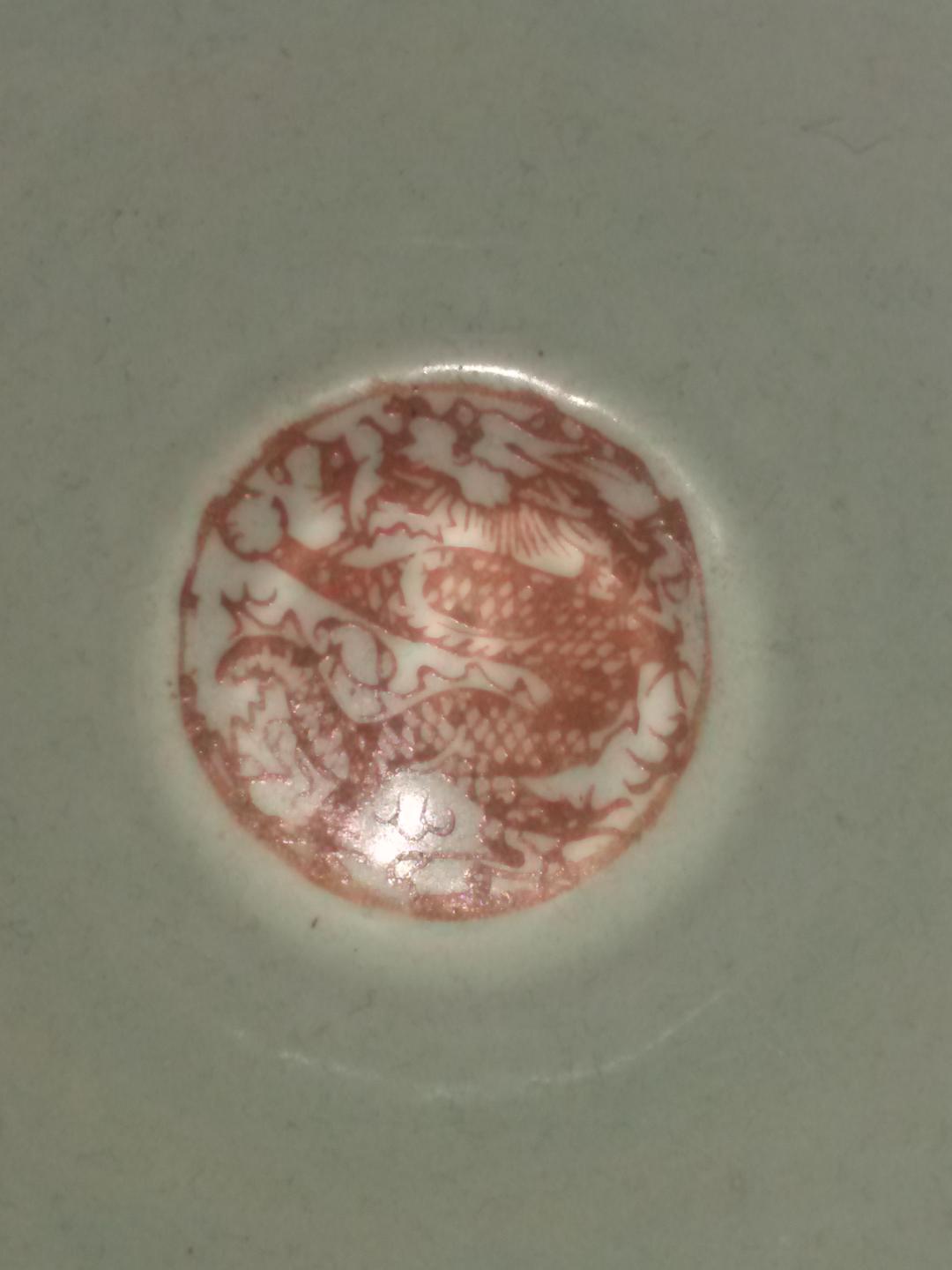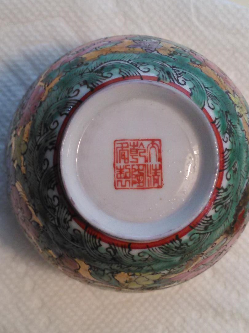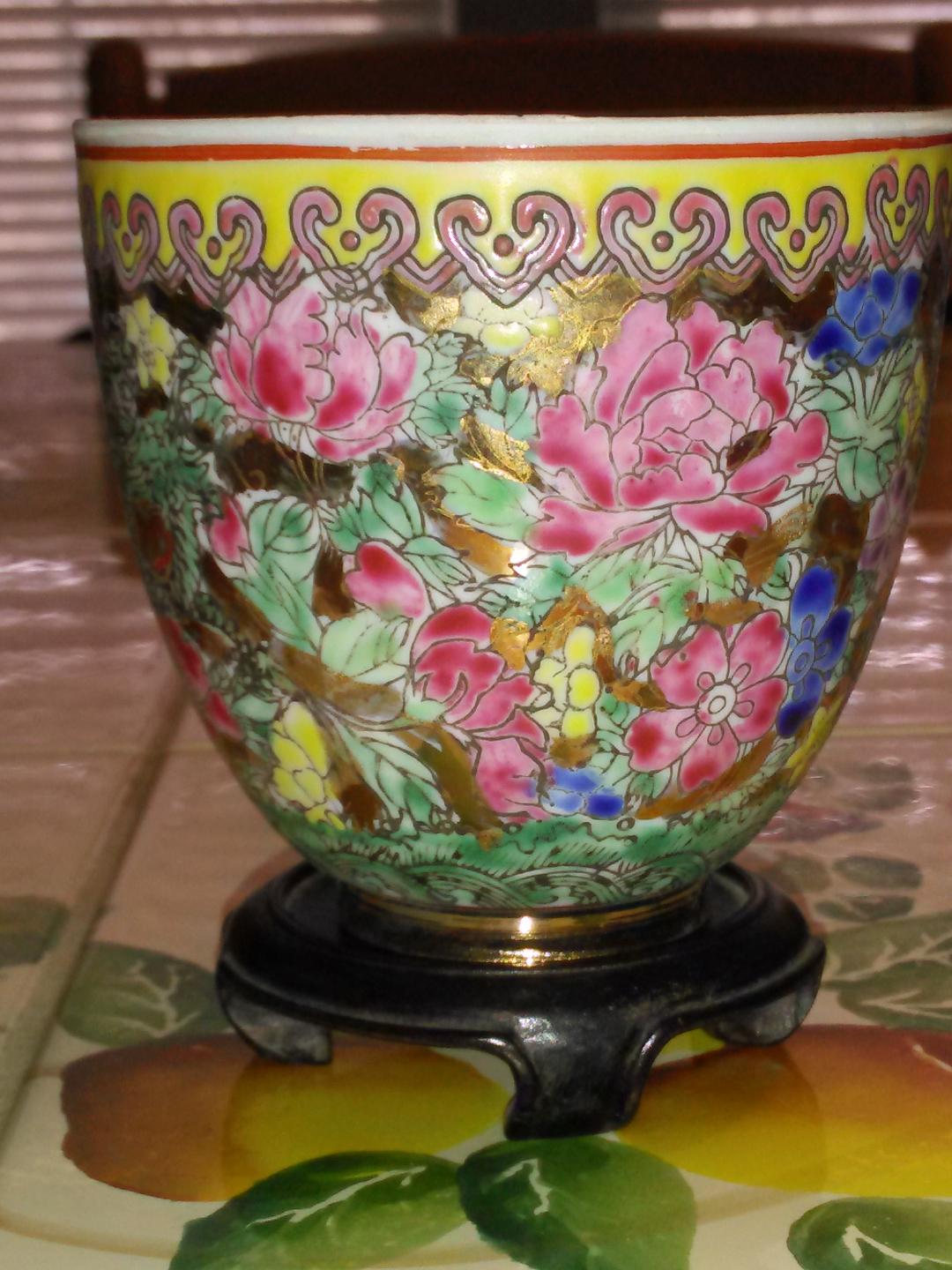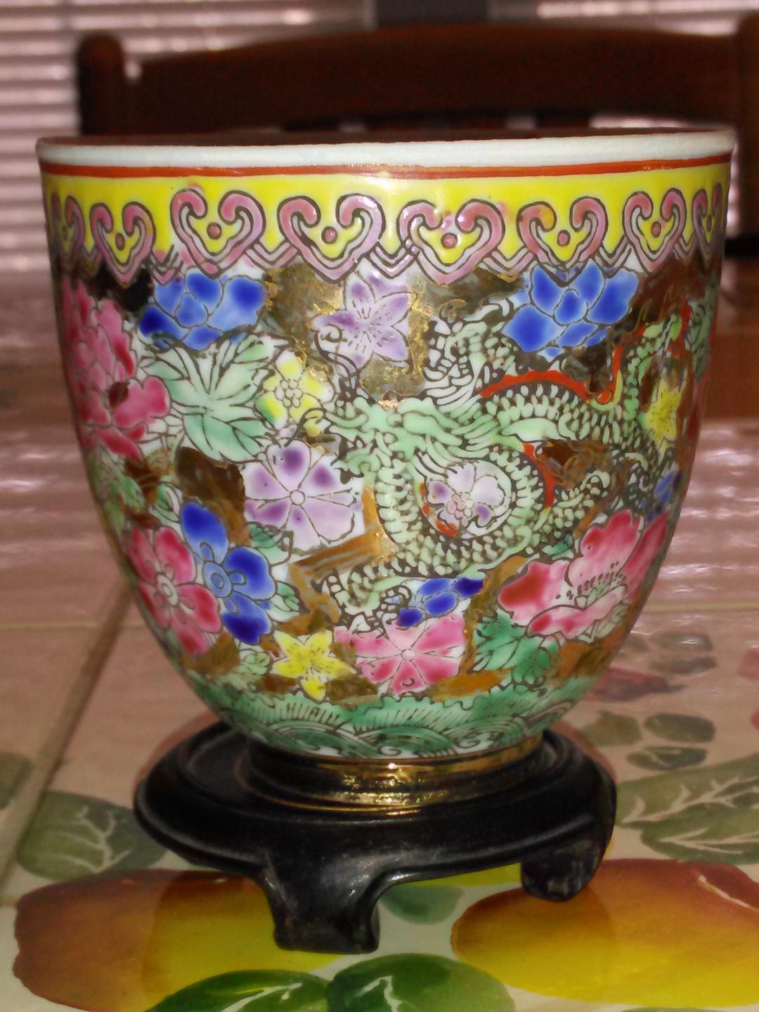 Chinese Porcelain wine cup from the Qing period early 1800's to 1870's under one of 3 Emperors (and son's) Jaiqing to Tongzhi ... VERY delicate, paper thin and light shines through  ... a finely painted green dragon graces the outside with green, yellow, purple and blue flowers of some type with yellow and what appeares to be real gold accents as well as green leaves. A red dragon in red enamel(?) is in the inside bottom of cup. Rim 8cm, 3 3/16" ; Base 3.6cm, 1 7/16" ; Height 7.8cm, 3 3/16". Cup weighs roughly 36.1grams. No idea what woods comprise the stand.
