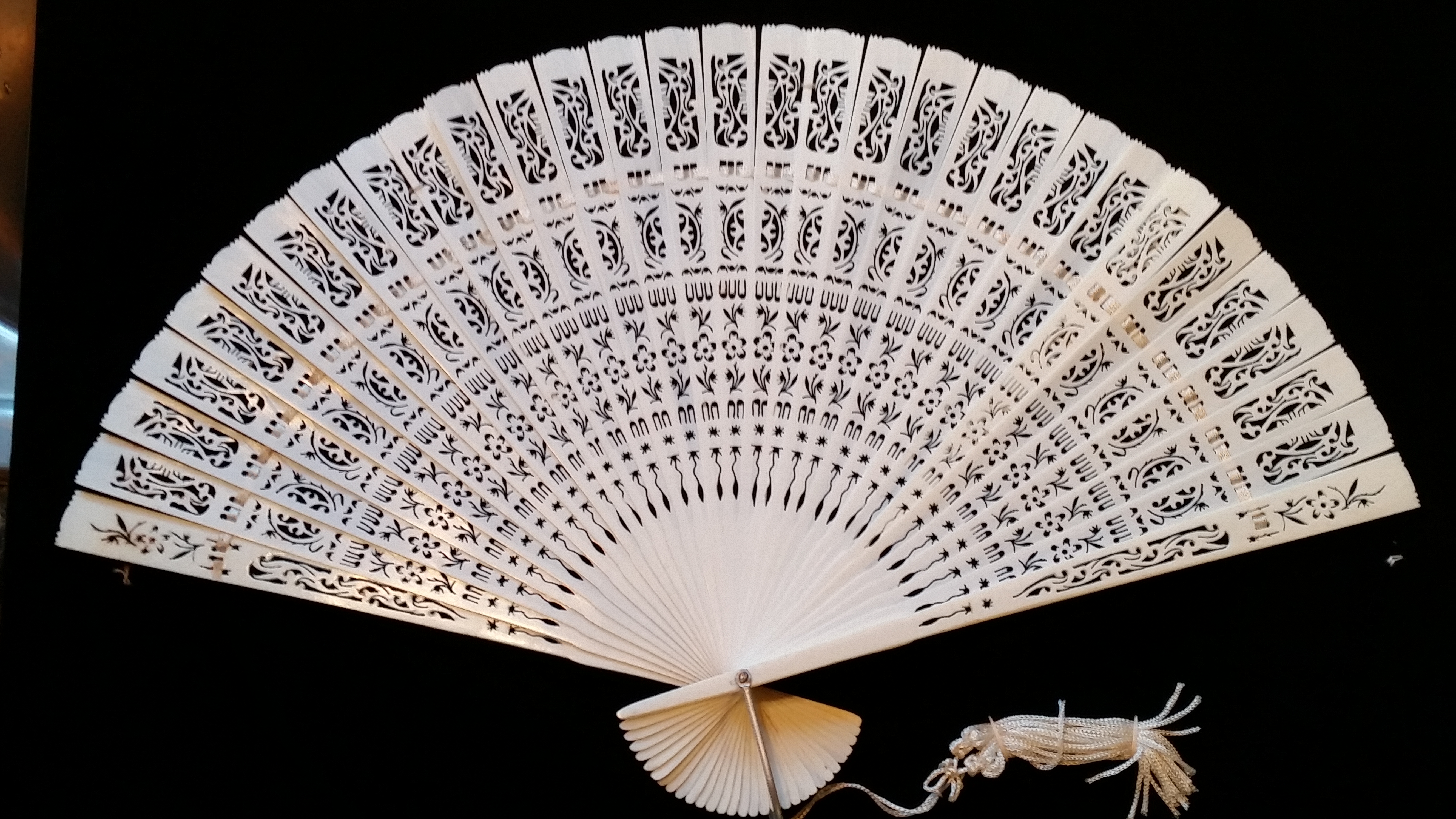 I think your's is on the low end of worth. The better fans would never leave all the cutting fuzzys in-side the cuts... look at your close up. not the high end cuts. some of these are called wedding fans.. some are plastic.ox bone.bamboo.ivory.Resin.. with the fuzzys I see I am thinking resin