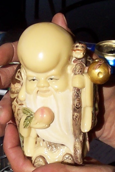 Possible ivory statue of Chinese god of longevity. Has detailed painting of robe, staff, etc. Holding a peach in hand. Special markings on bottom of statue written in chinese.