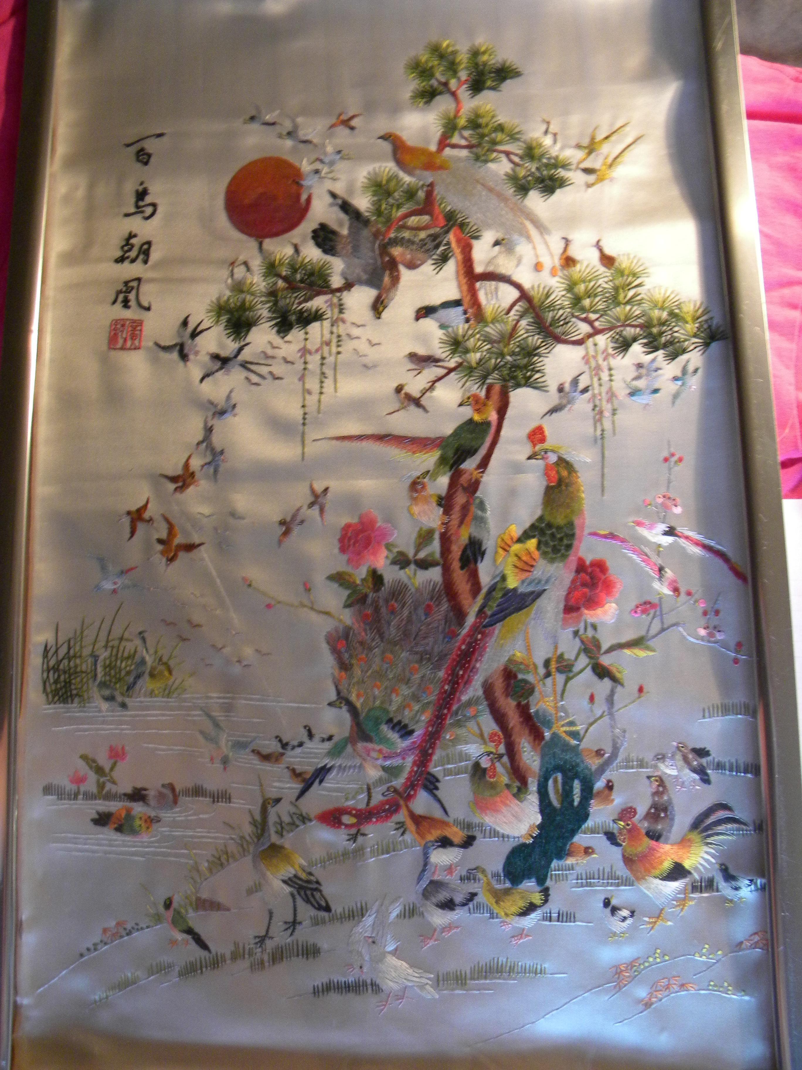 Two beautiful, hand embroidered silk, works of Art. They depict an amazing scene of dozens and dozens of birds. They both are 24x15.