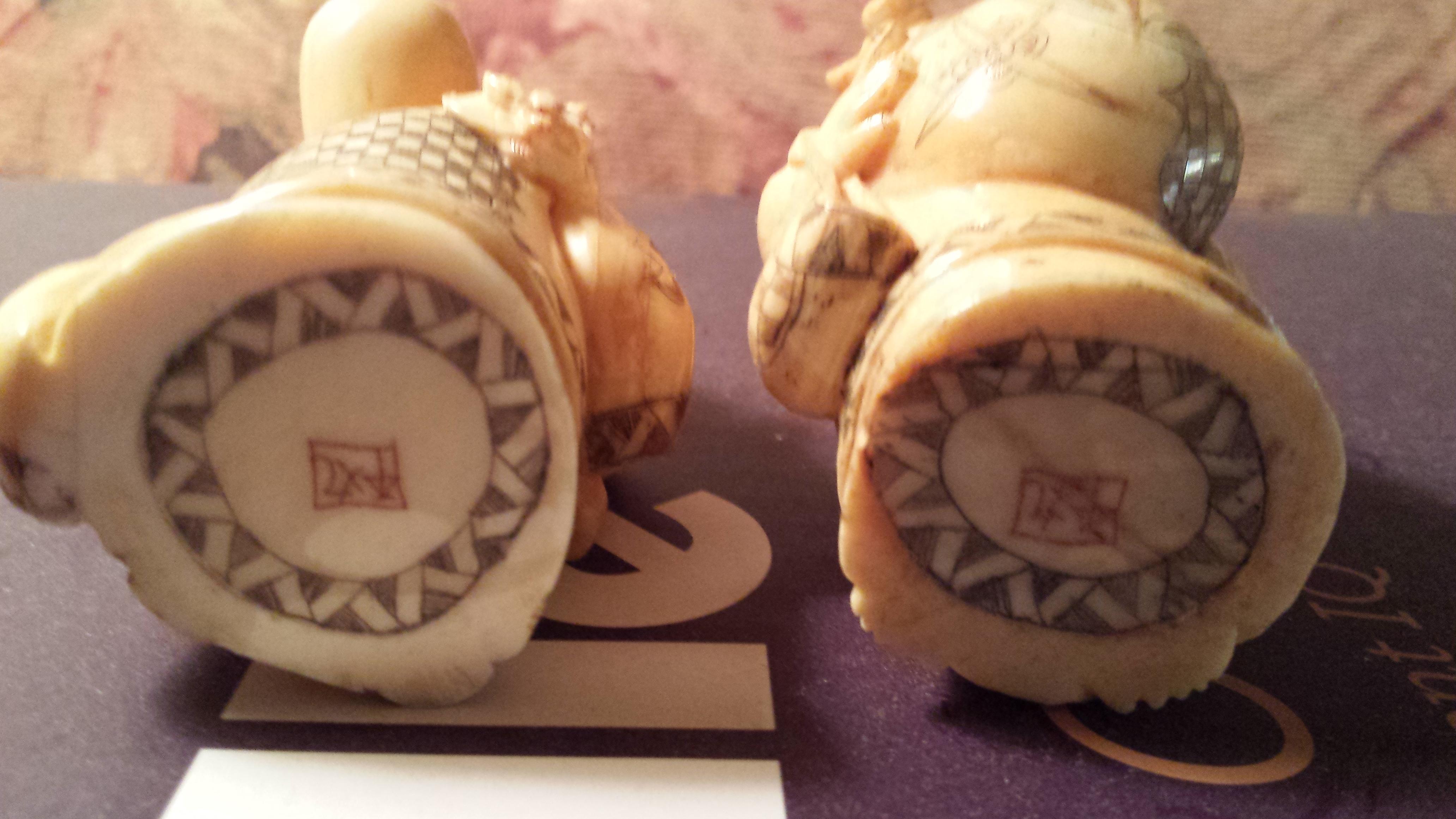 These 3 inch figures are Chinese and I think ivory, they both came from Thailand from 2006, they are part of a large ivory boat collection in a shopping mall display in Thailand, I was able to buy these two figures without buying the whole large expensive display set. There is a signature on the bottom of both figures...not sure what it says because it's in Chinese