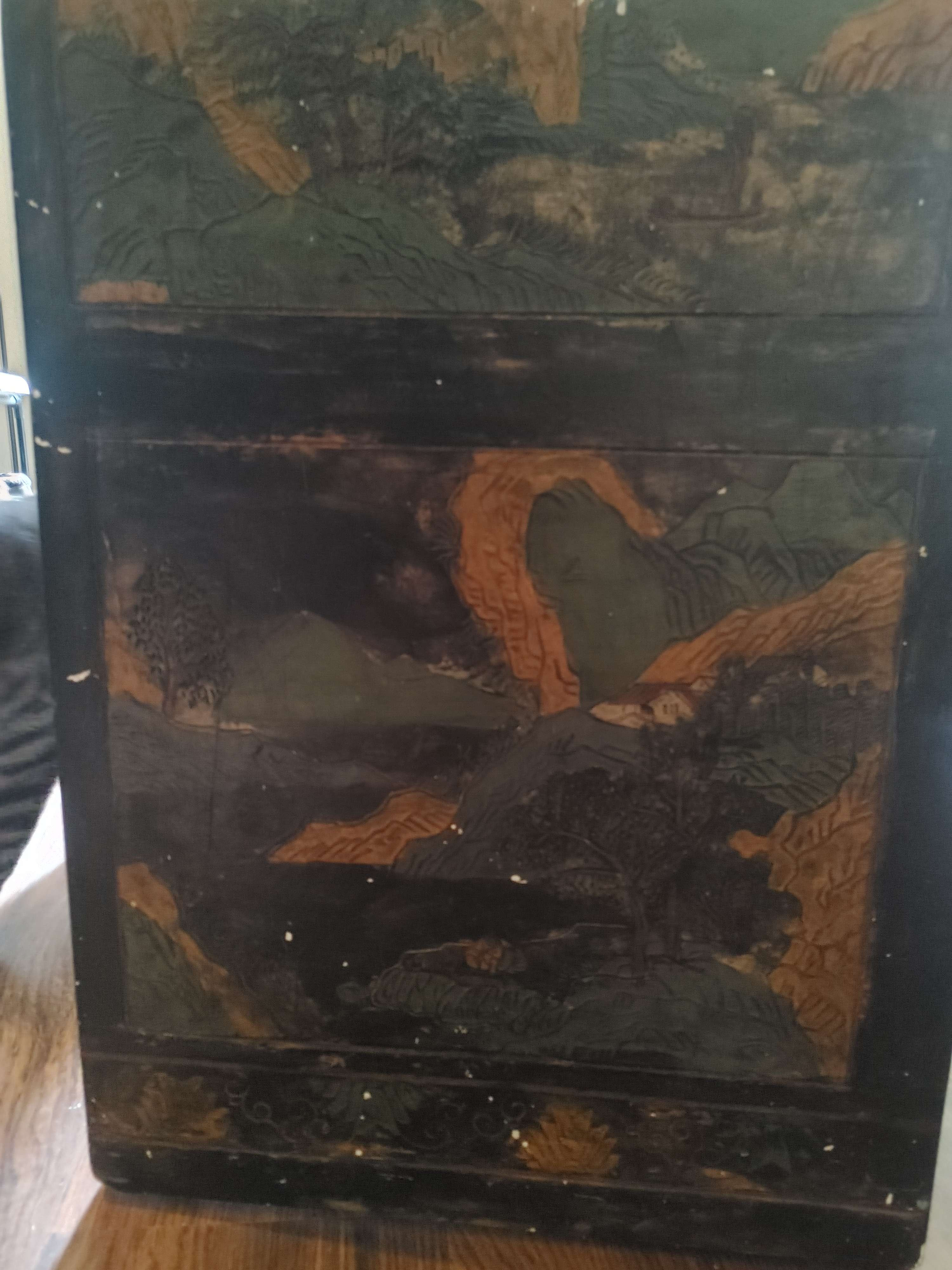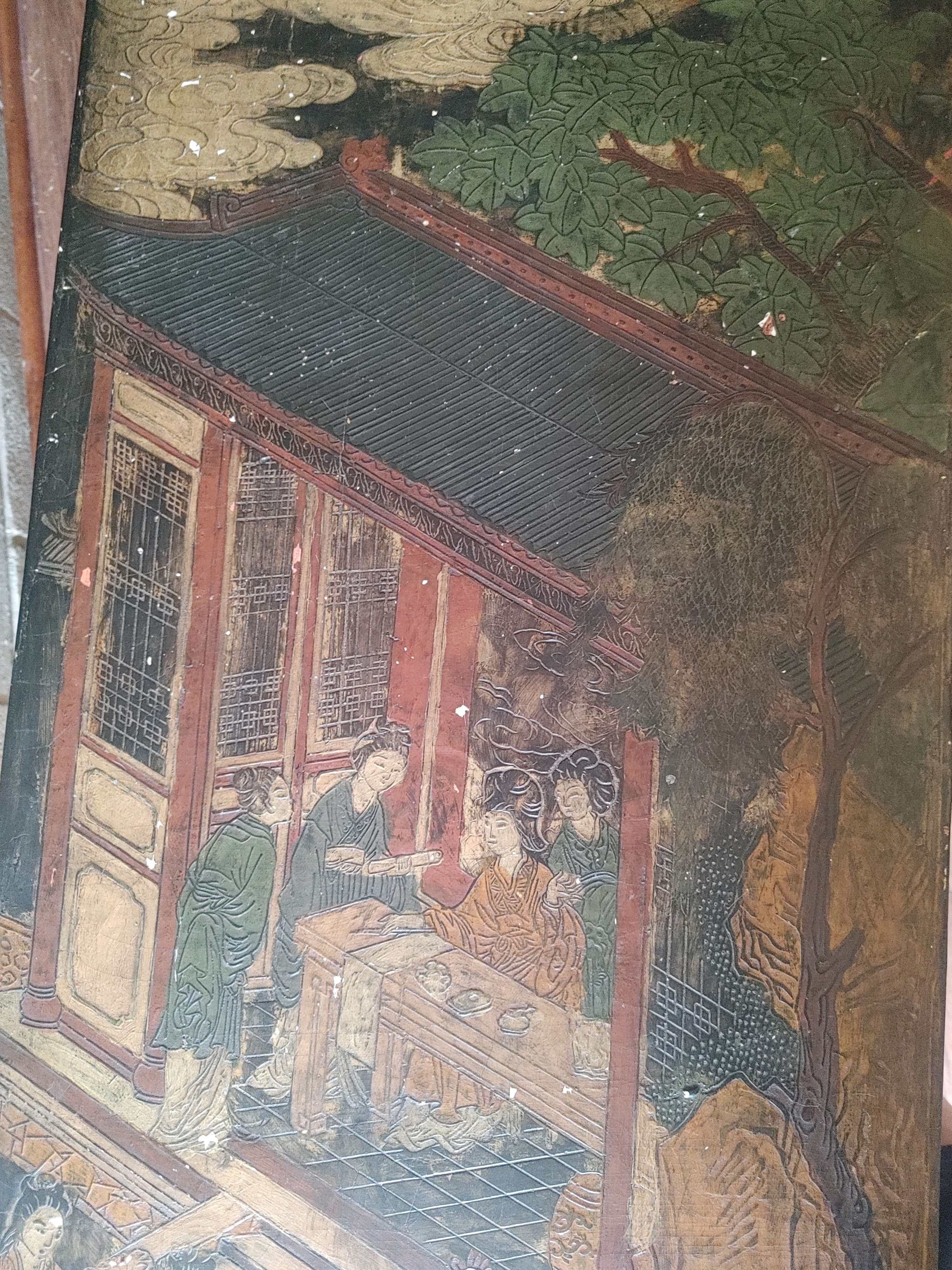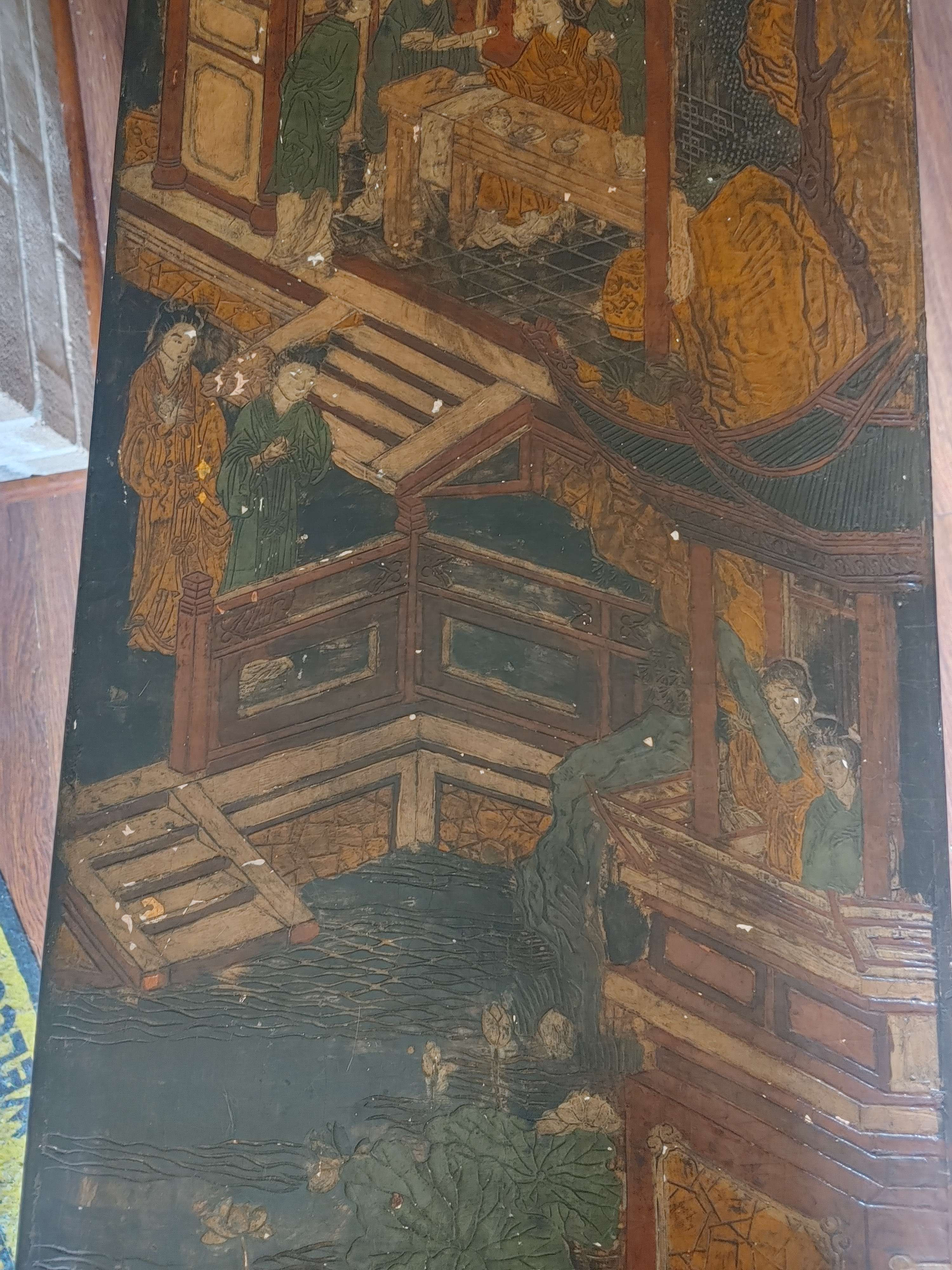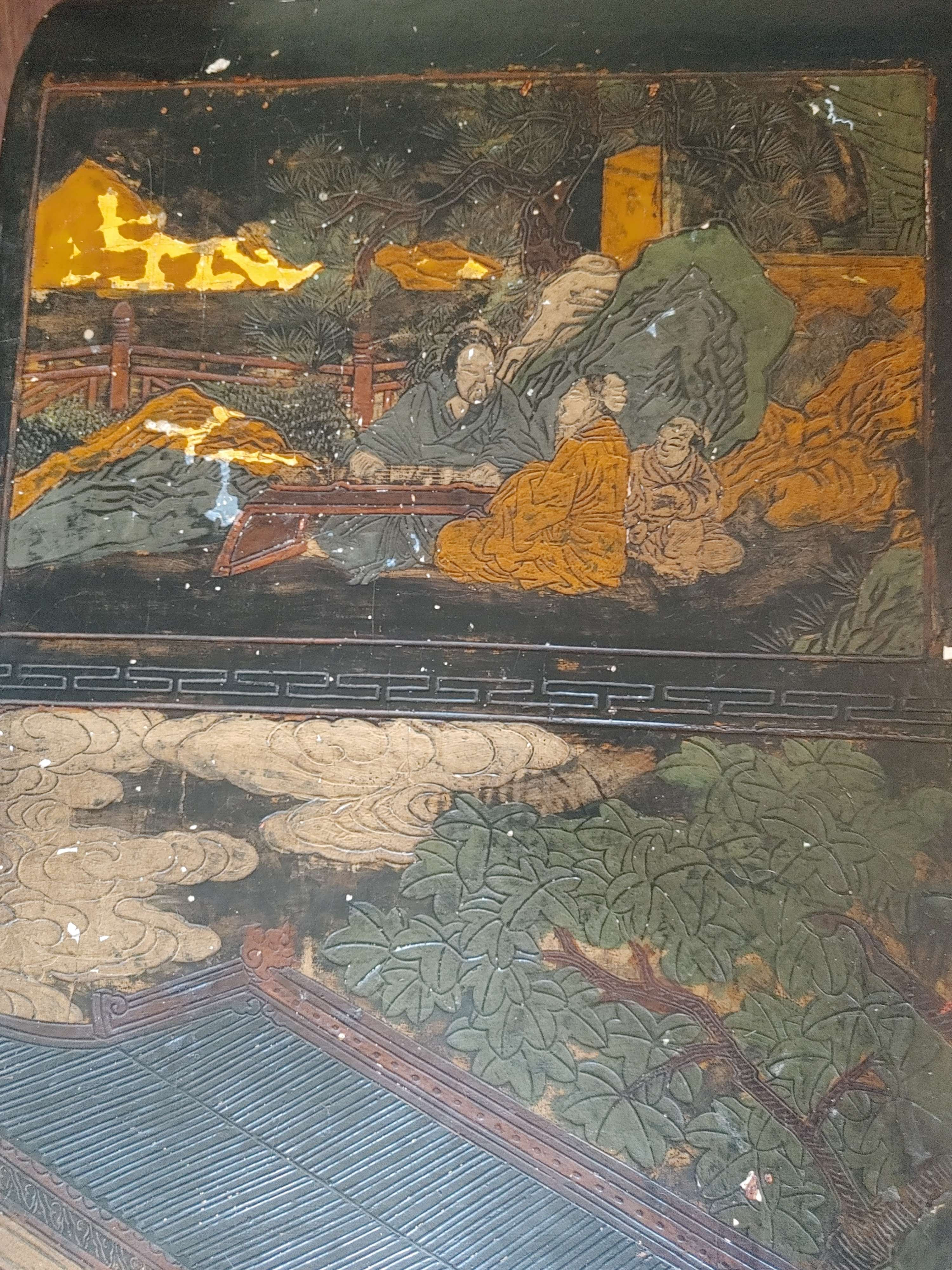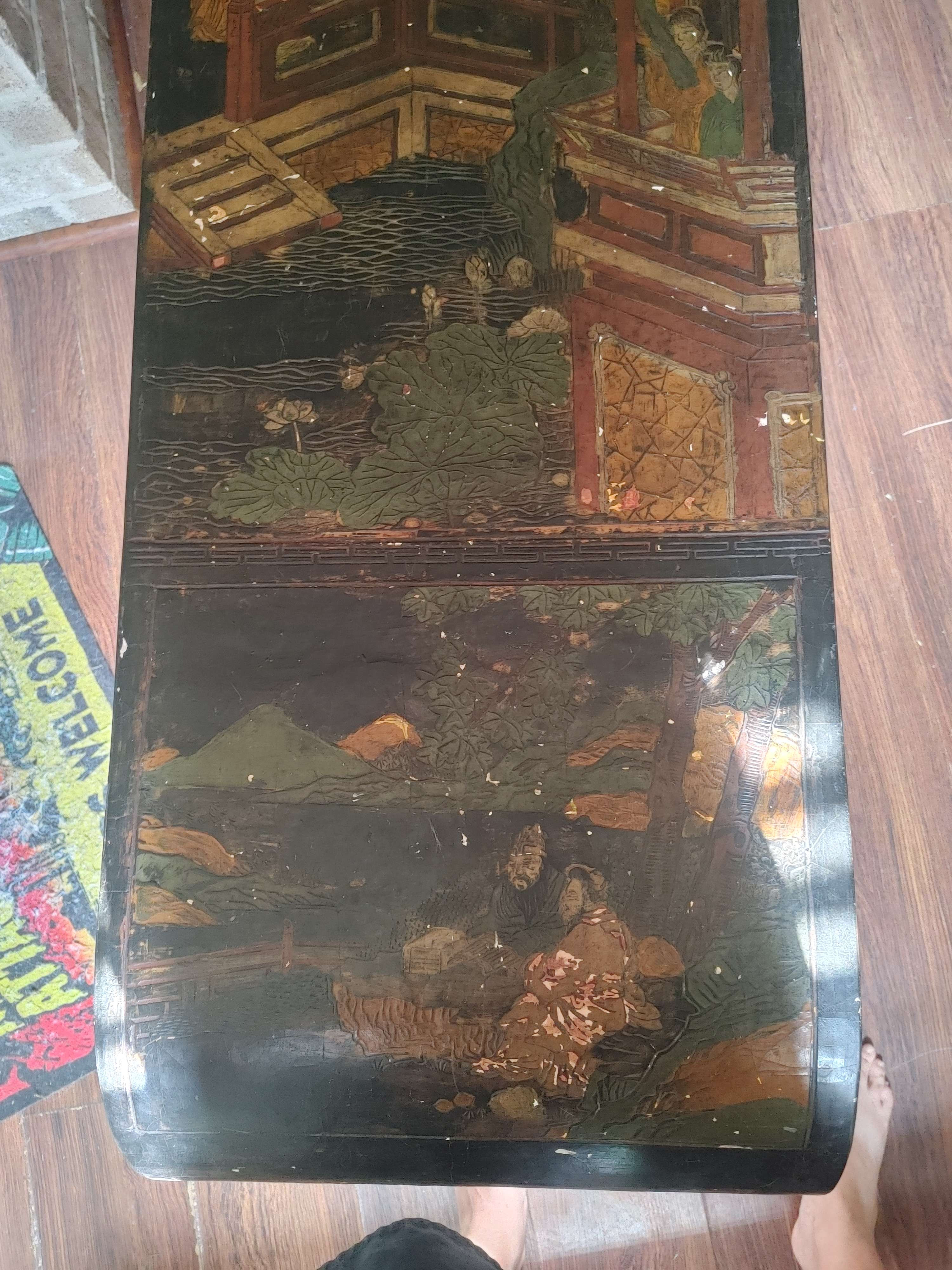 Thank you for sharing these detailed images of your piece. What you have appears to be a Chinese lacquer tea table or bench, decorated with hand-painted and incised scenes typical of Qing dynasty-inspired design, though your item may be a 20th-century revival piece. Here's a full appraisal overview: