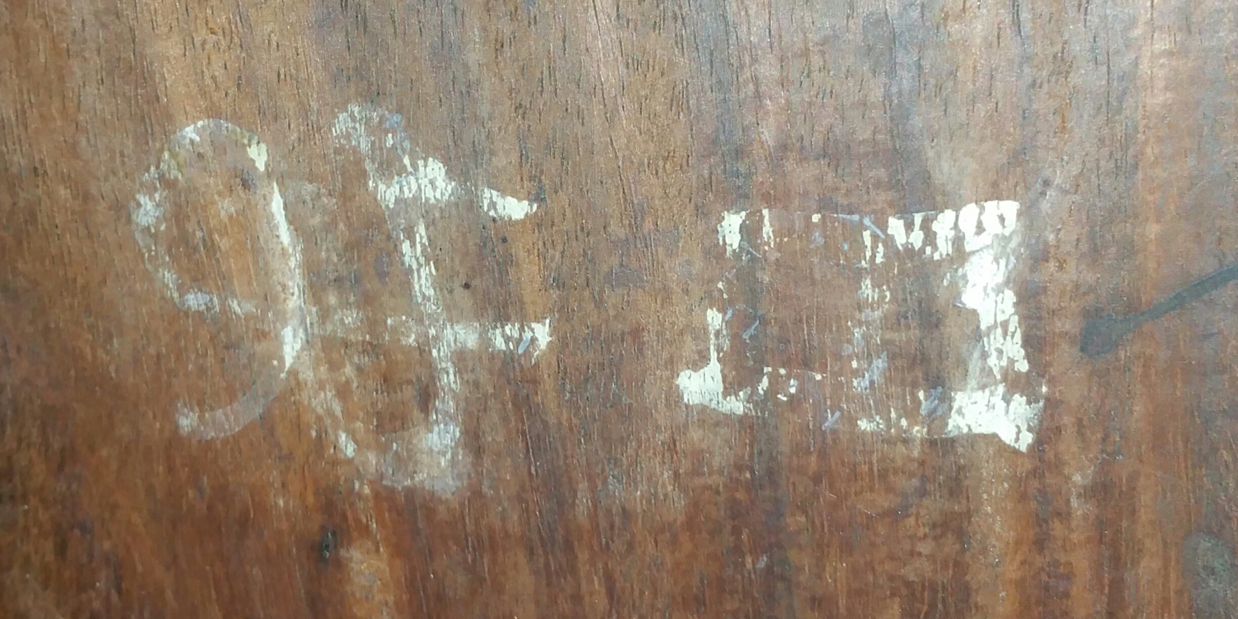 As mentioned, on the bottom of each table; using handset metal reverse type, there are two words... I say words because there are no spaces between the actual words... I. E. "CHINAMADEIN" is one marking... & the other is noted in the description. Both are "burned.. Or branded" into the wood.