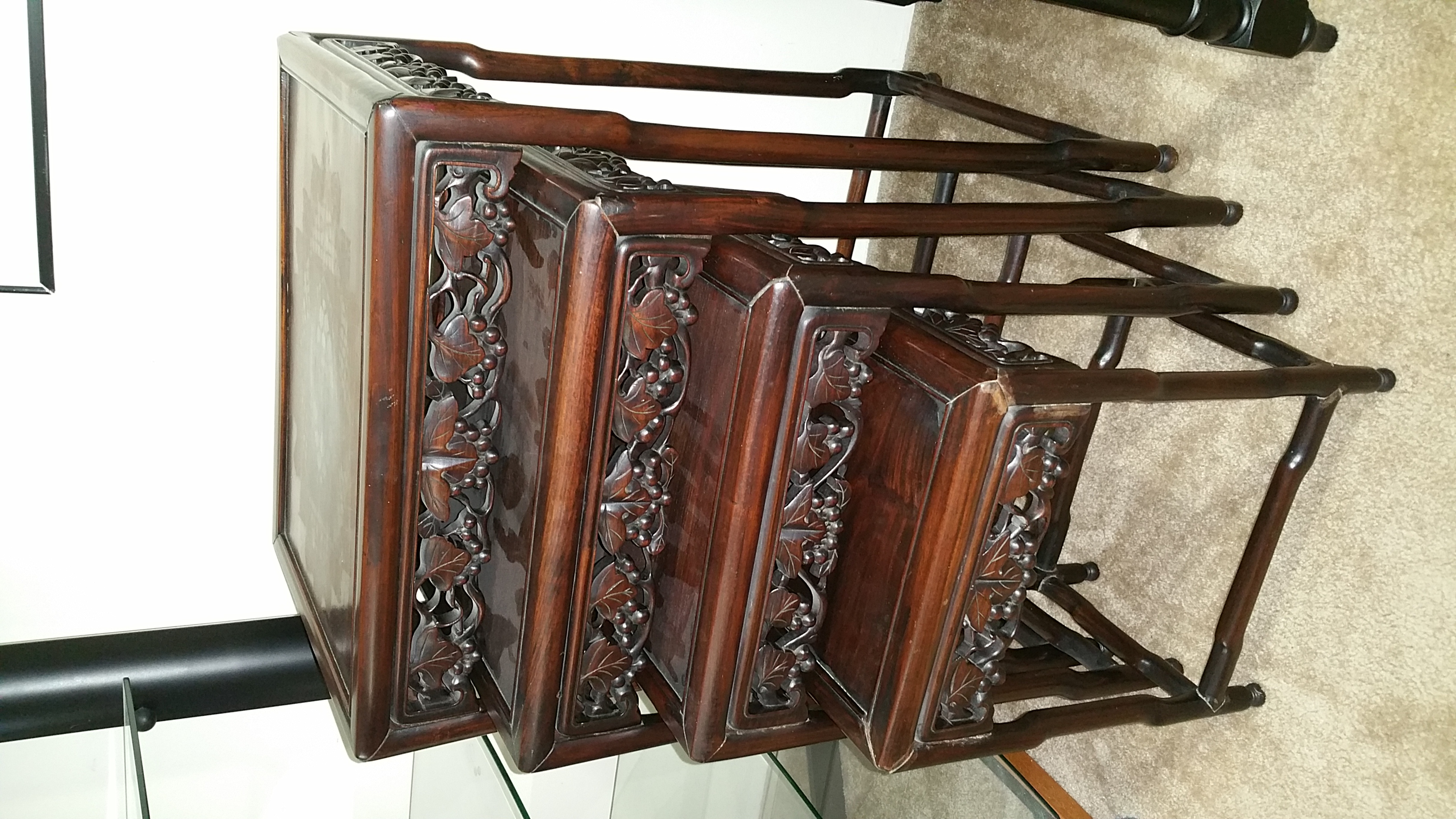 I recently inherited these Chinese Nesting Tables. On the bottom of each, the letters "CHINAMADEIN" & "KWONGTUNGPUNCHEONG" are burned into the wood, along with handwritten Chinese writing. I cannot find ANY matches or information on them. My aunt who had them collected VERY expensive, rare, and unique treasures.. So I wouldn't rule out these being either amazingly rare/valuable/old.... Or something she, her mother, or her mother actually bought in person themselves.