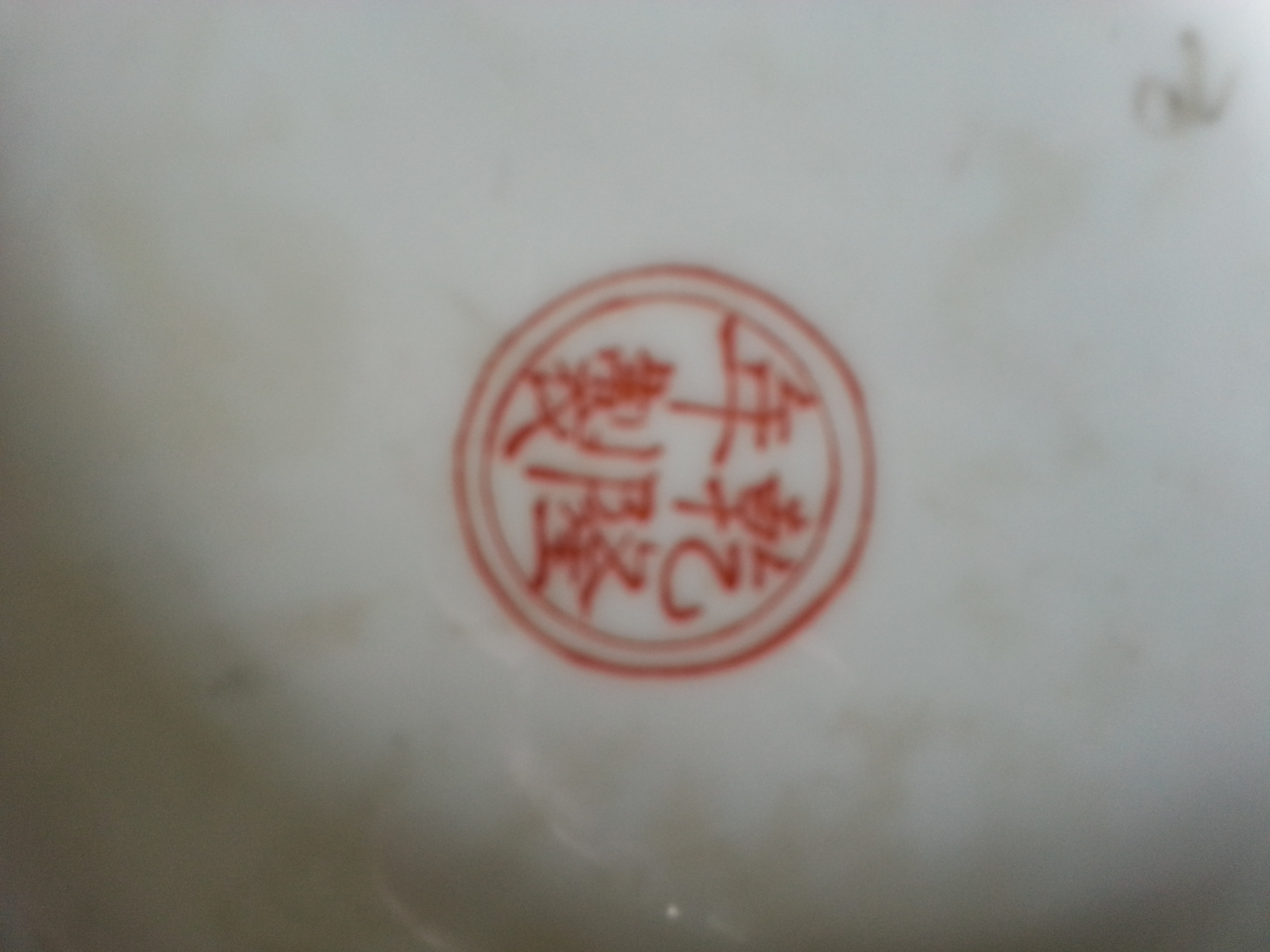 large heavy bowl with gold edge around top. patterned with Chinese or Japanese with marking on bottom