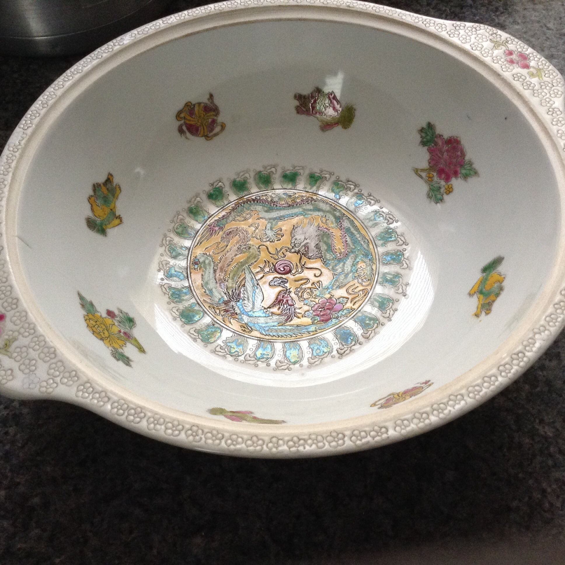 The doglike figures on top of the bowl are foo dogs ( the same thing you can spot at the entrace to chinese restaurants and temples back in China)