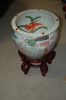 11 3/4” x 14” Asian, I feel sure it’s Chinese, a fisbowl. It seems to me it’s hand thrown. It also seems to be hand painted and with some gilding.