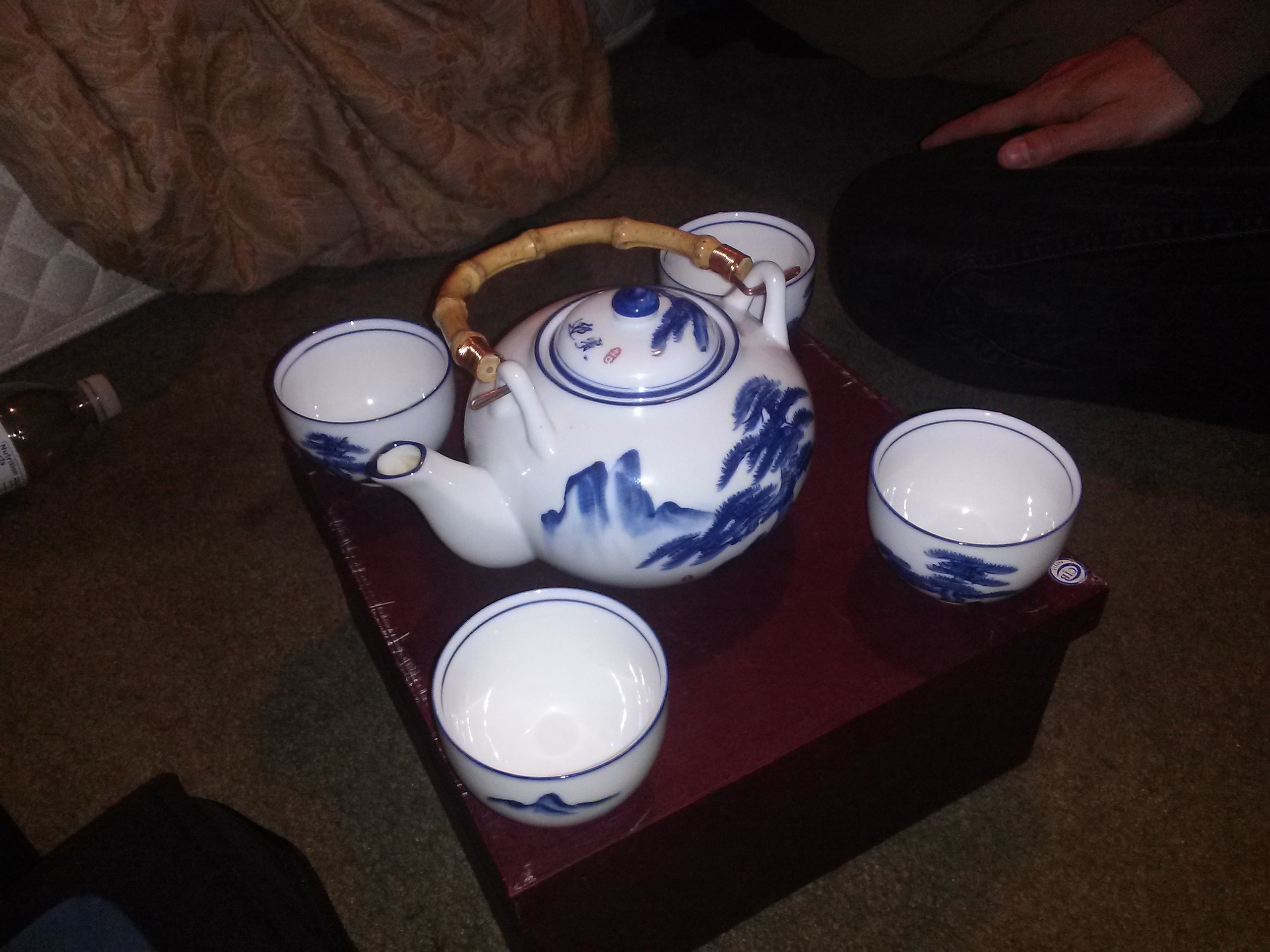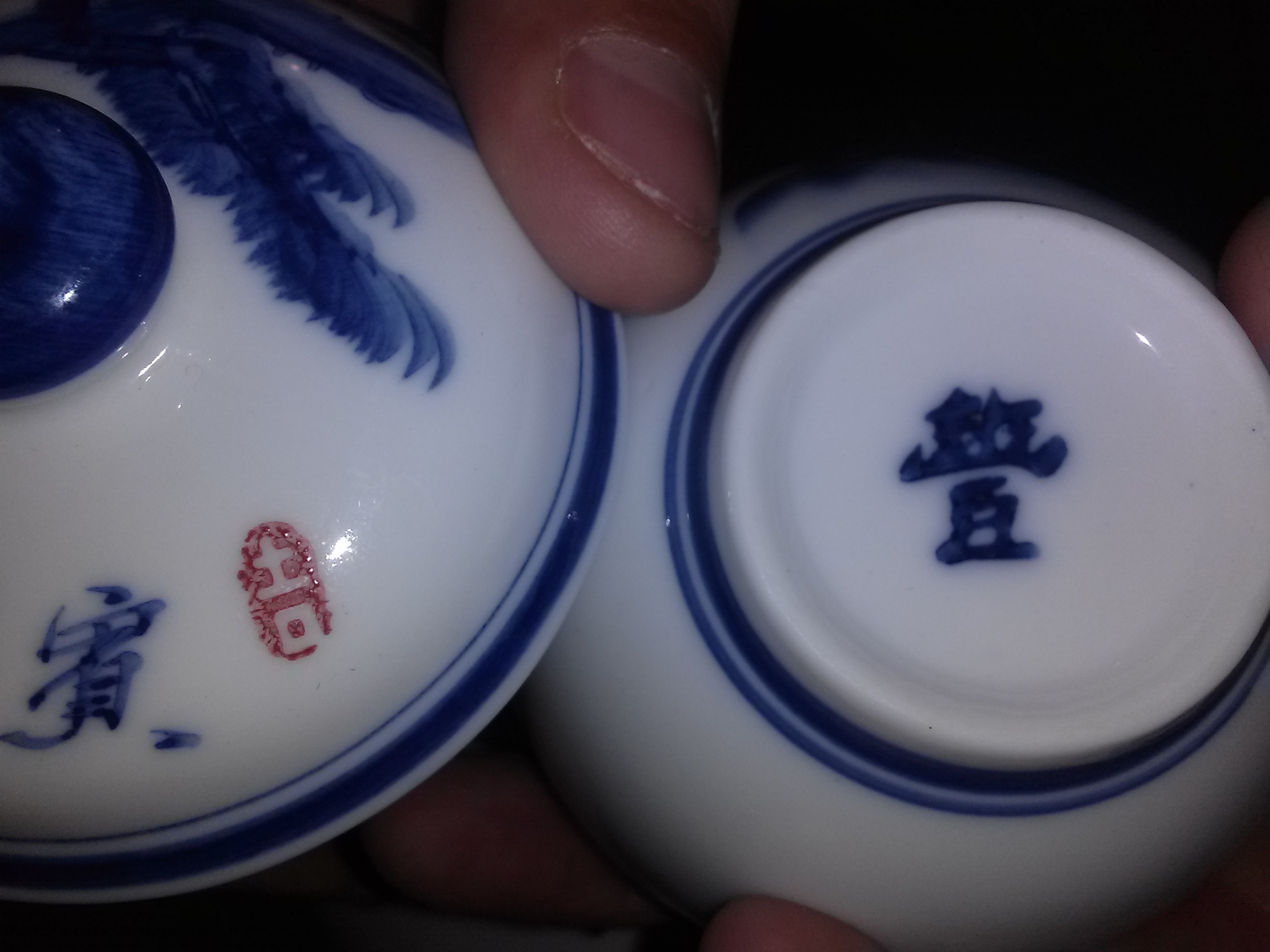 I have a chinese or japanese teapot with teacups and can't find the makers marks online anywhere. The pictures include the two makers marks and a picture of the teapot with cups.