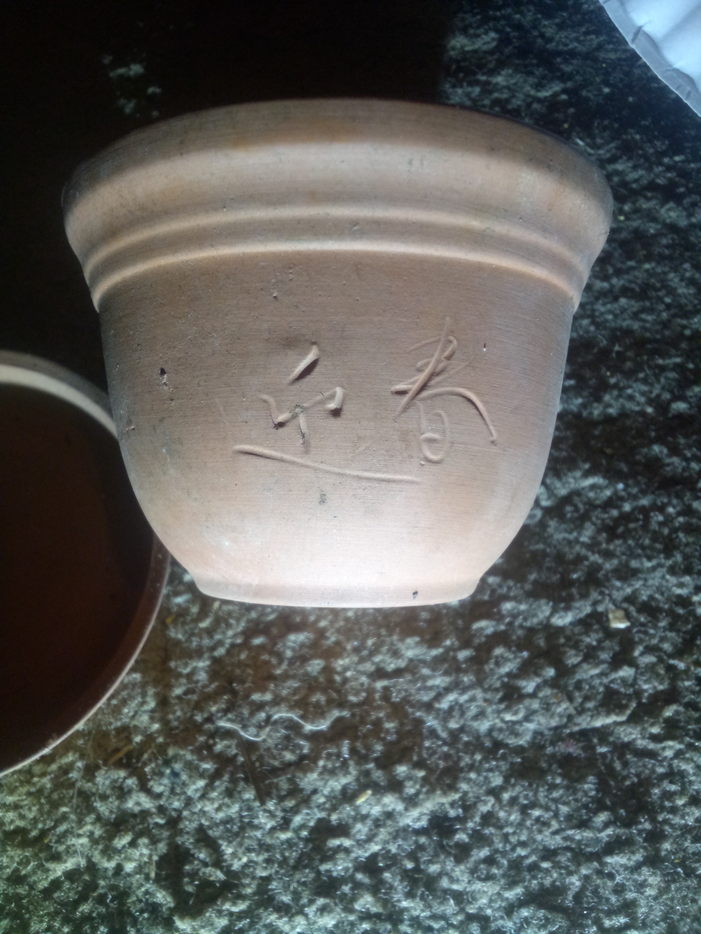 It's got two Chinese Characters on the side and a small crack in the pot.
