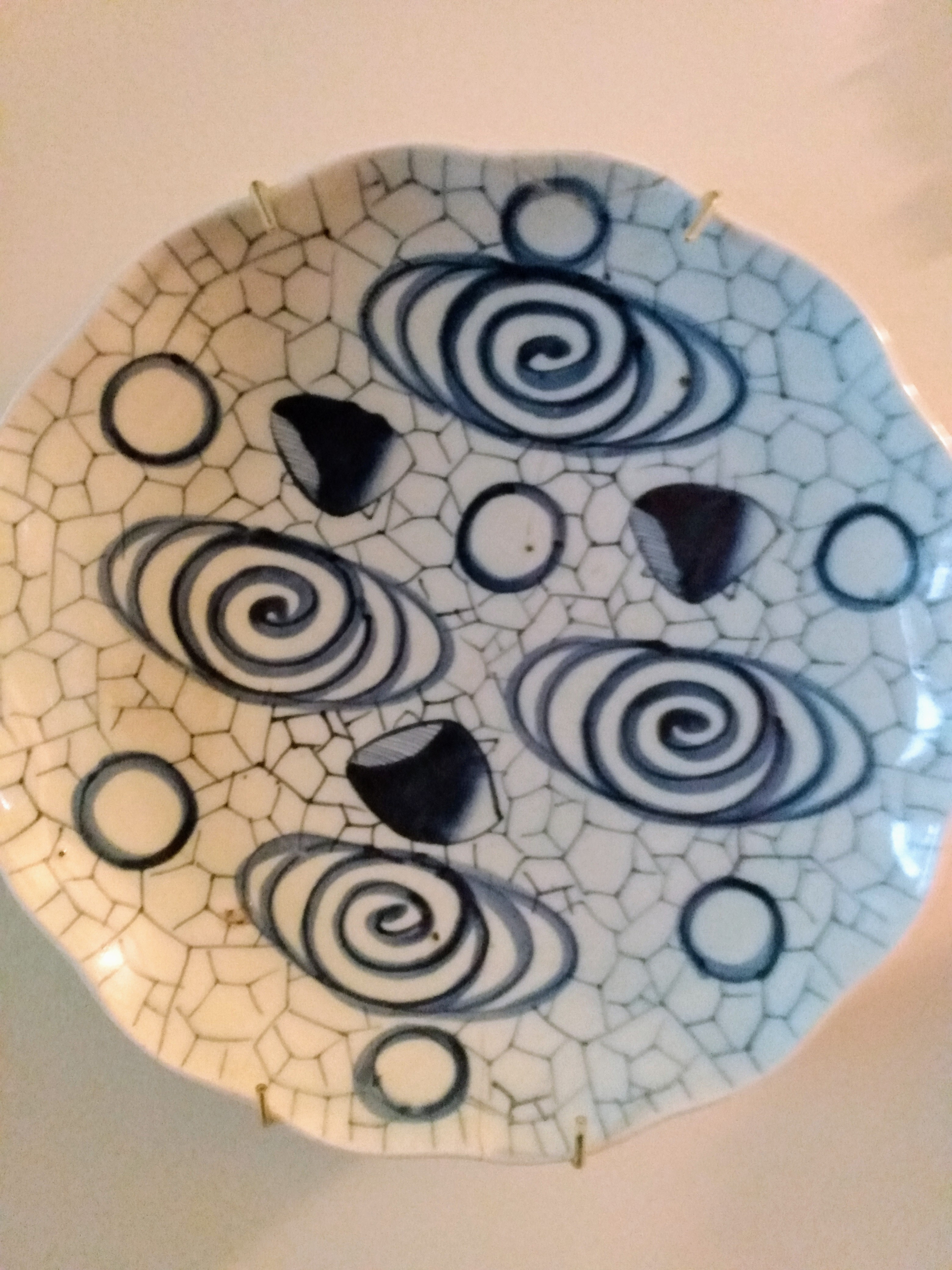 The plate features a blue-and-white motif with concentric swirl patterns (resembling stylized whirlpools or clouds) interspersed with darker brush-painted segments. The rim is scalloped, and the surface displays a fine crackle glazepattern, also known as Ge ware or craquelure—a technique with deep historical roots in Chinese ceramics, especially imitated from Song dynasty forms.