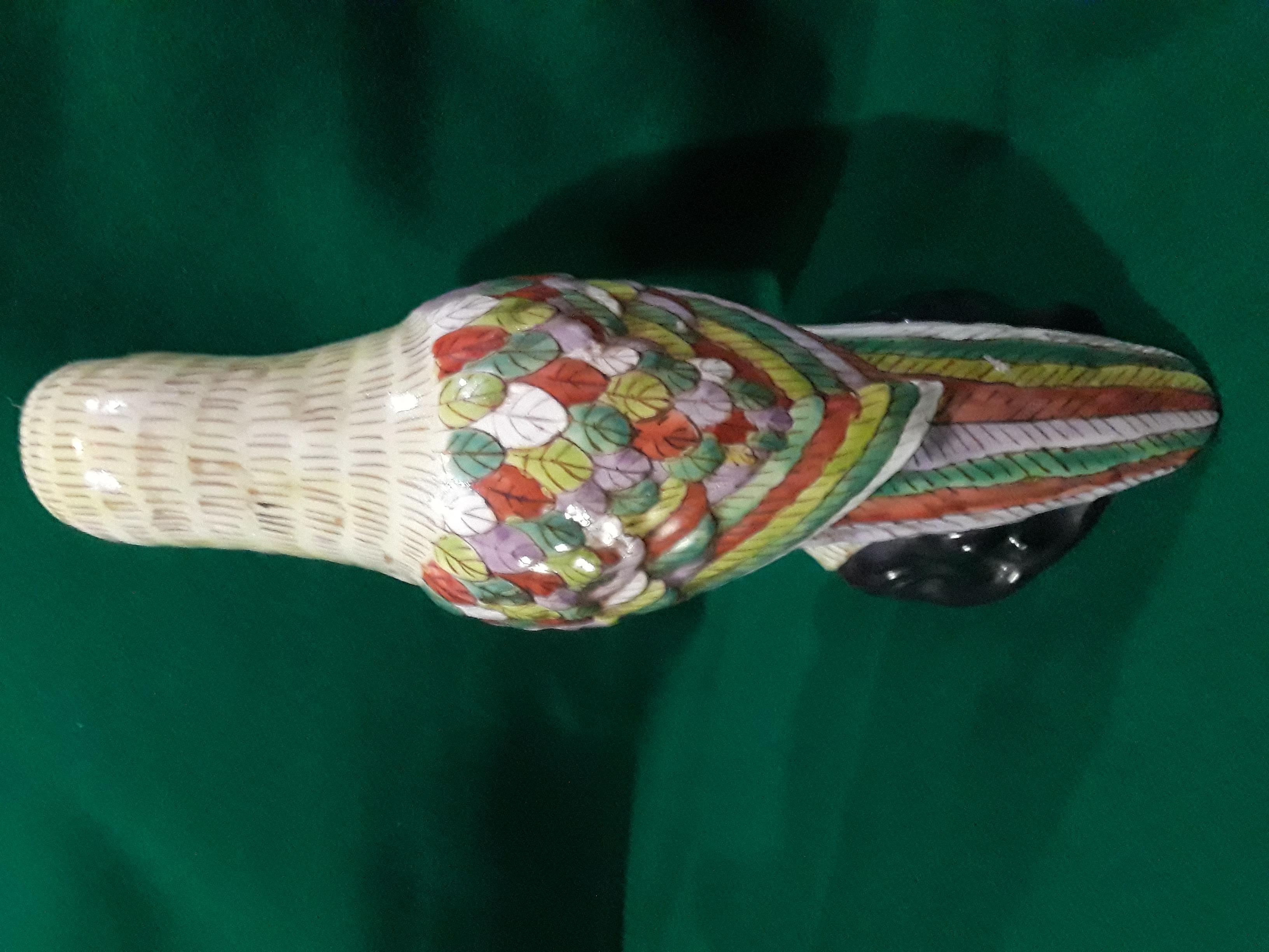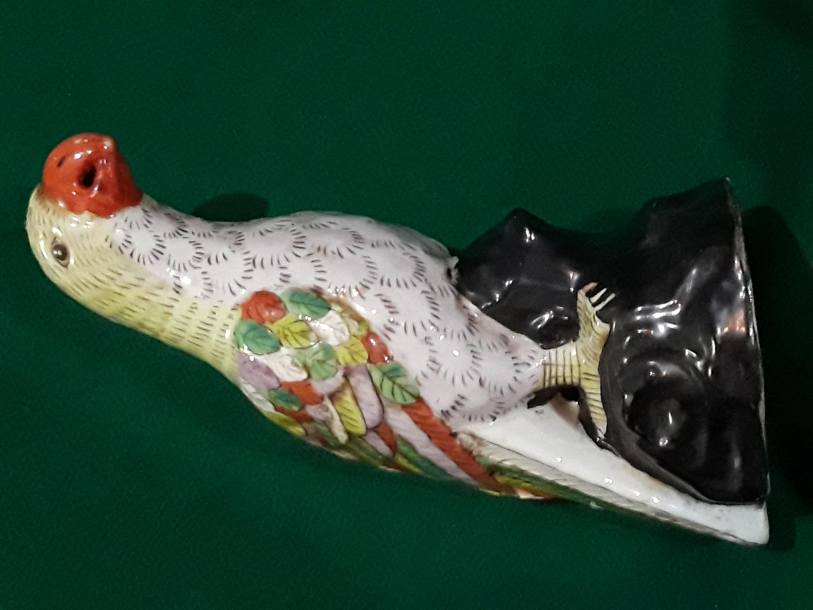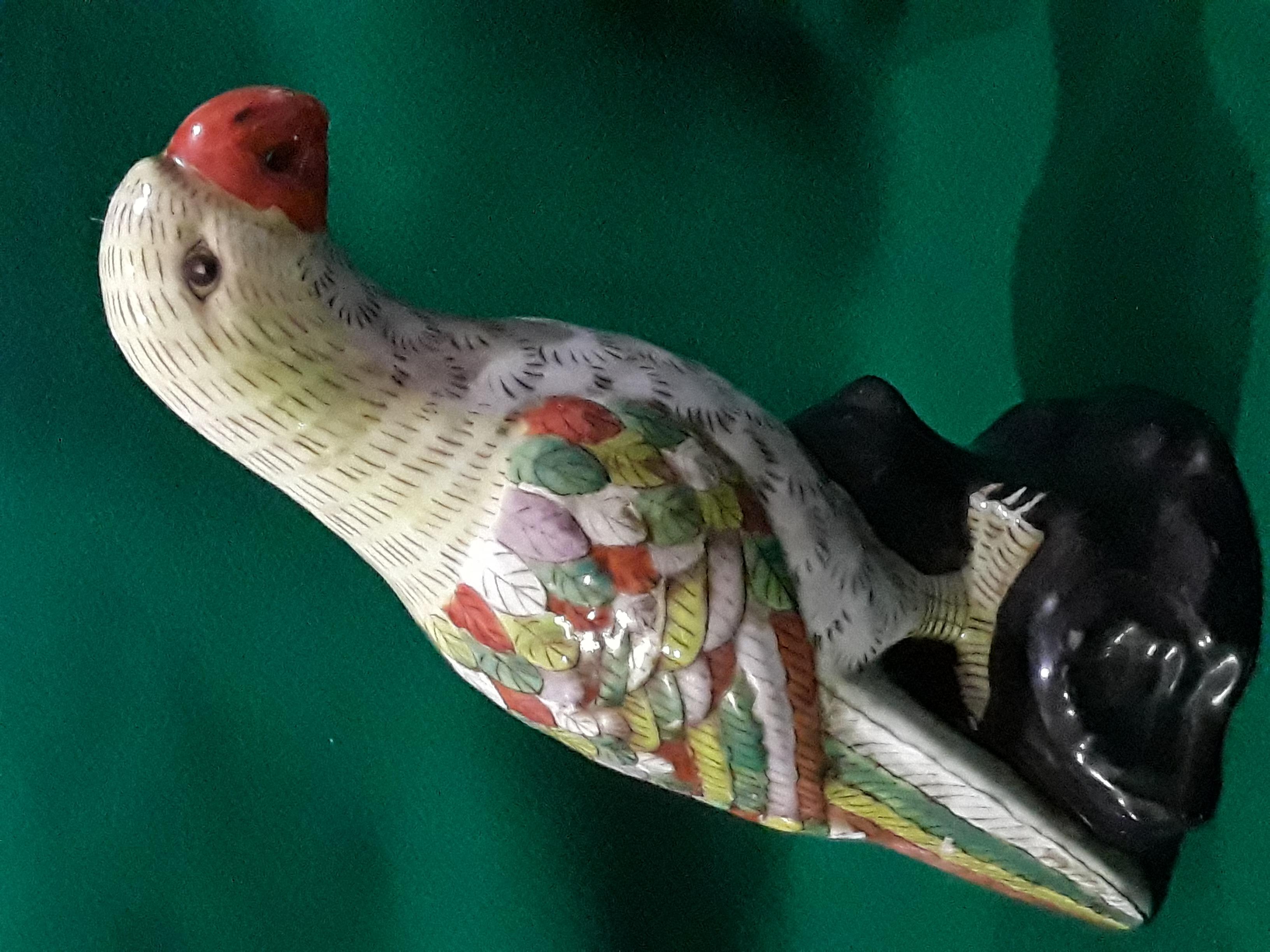 Chinese porcelain parrot, hand painted parrot on black rock base, multi colored wings and tail, opened beak. The dynasty mark on the bottom appears to be from JaiGing 1796 - 1820.