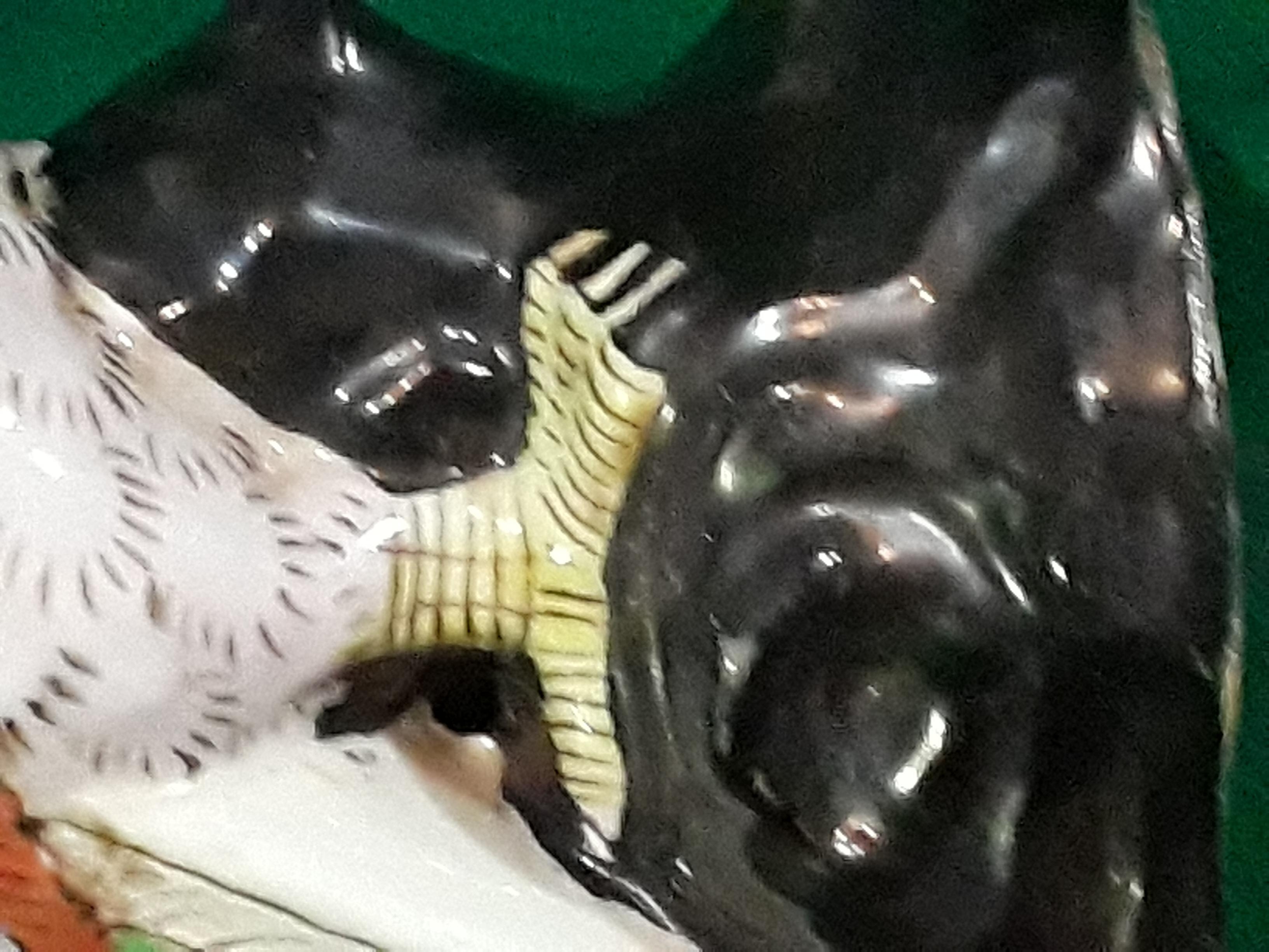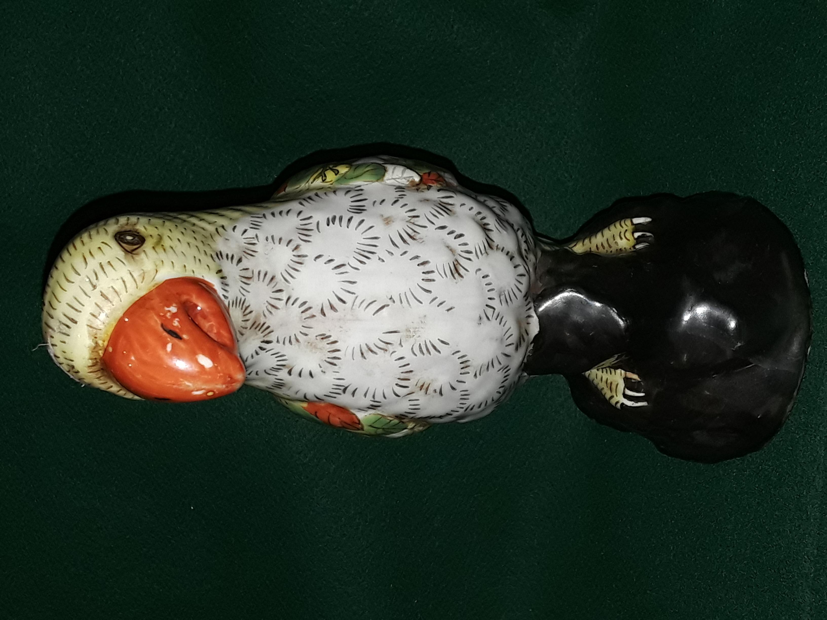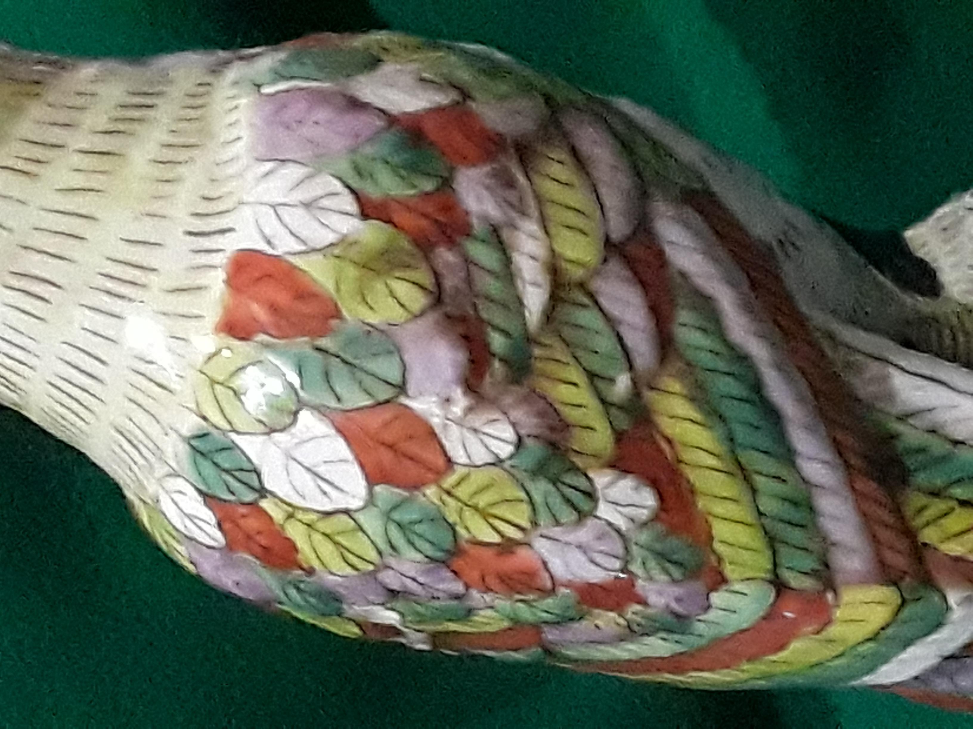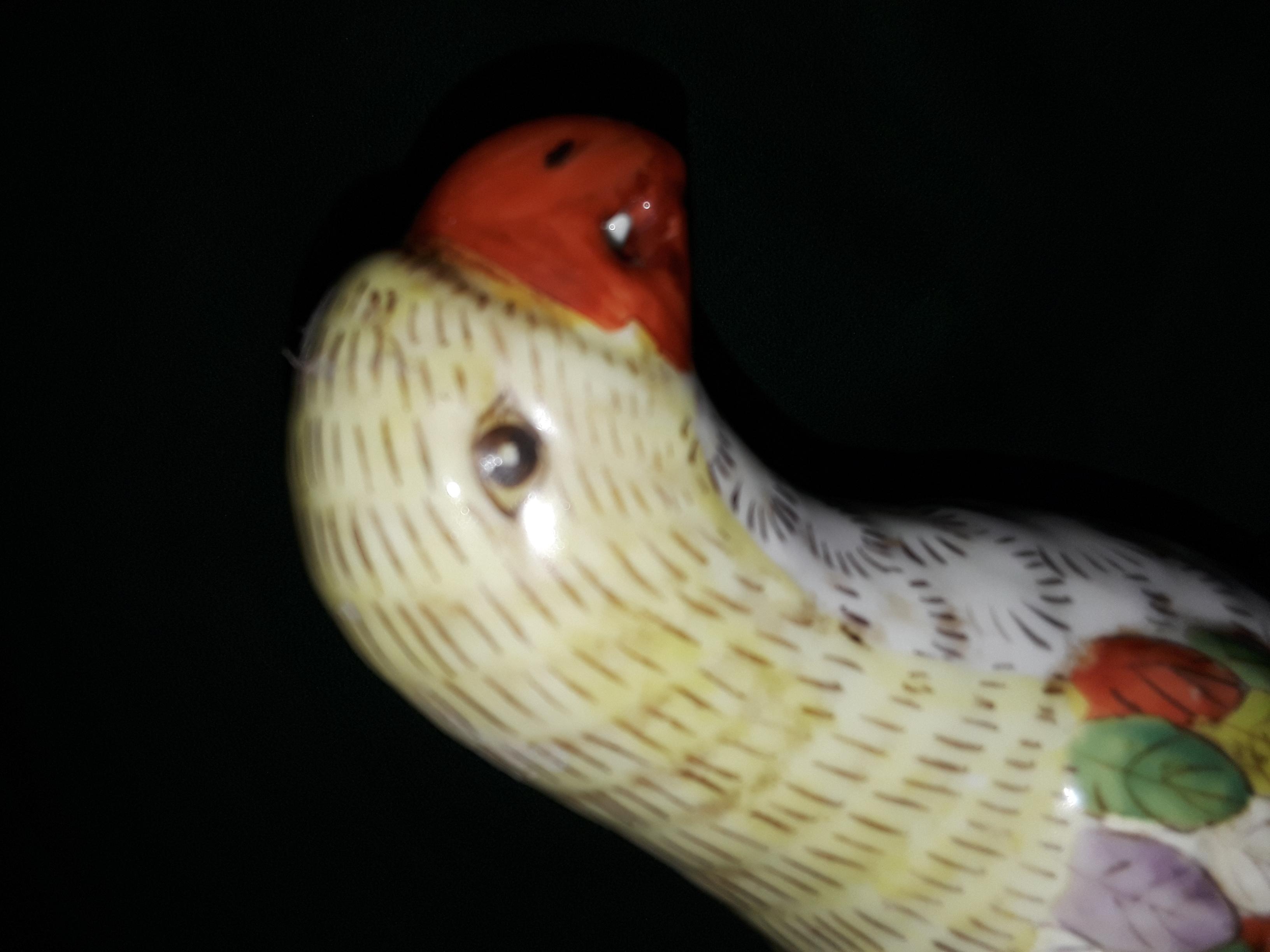 Chinese porcelain parrot, hand painted parrot on black rock base, multi colored wings and tail, opened beak. The dynasty mark on the bottom appears to be from JaiGing 1796 - 1820.