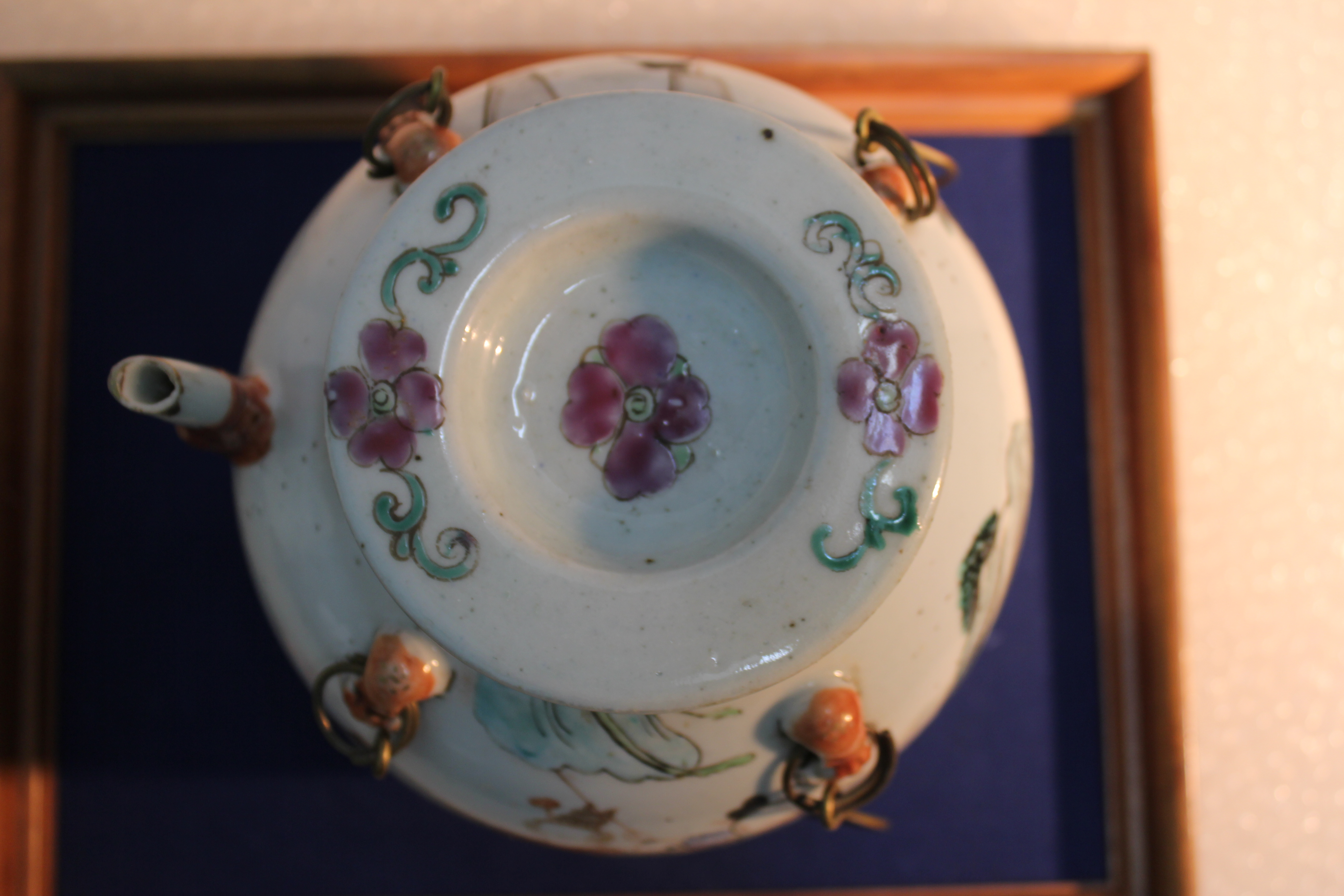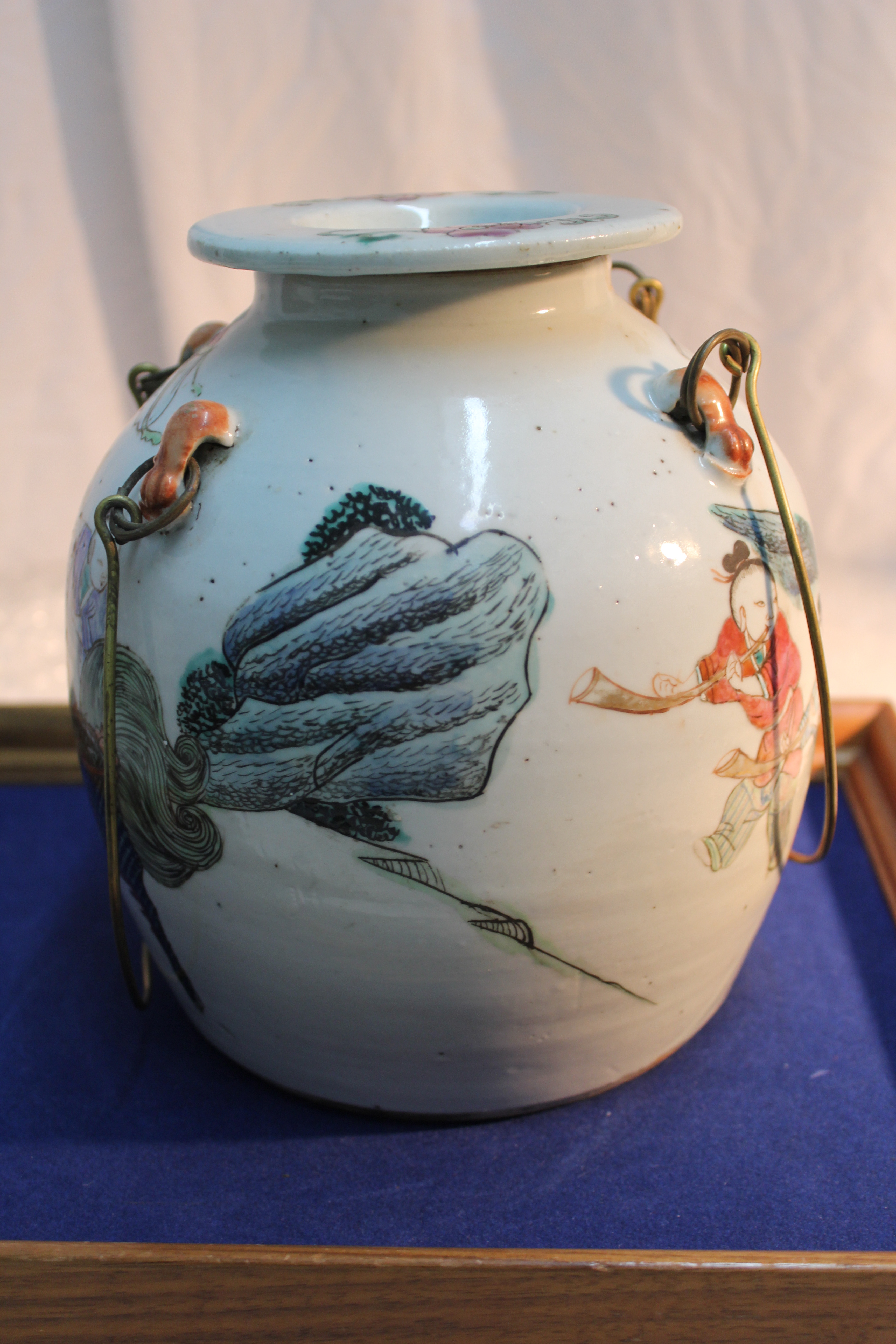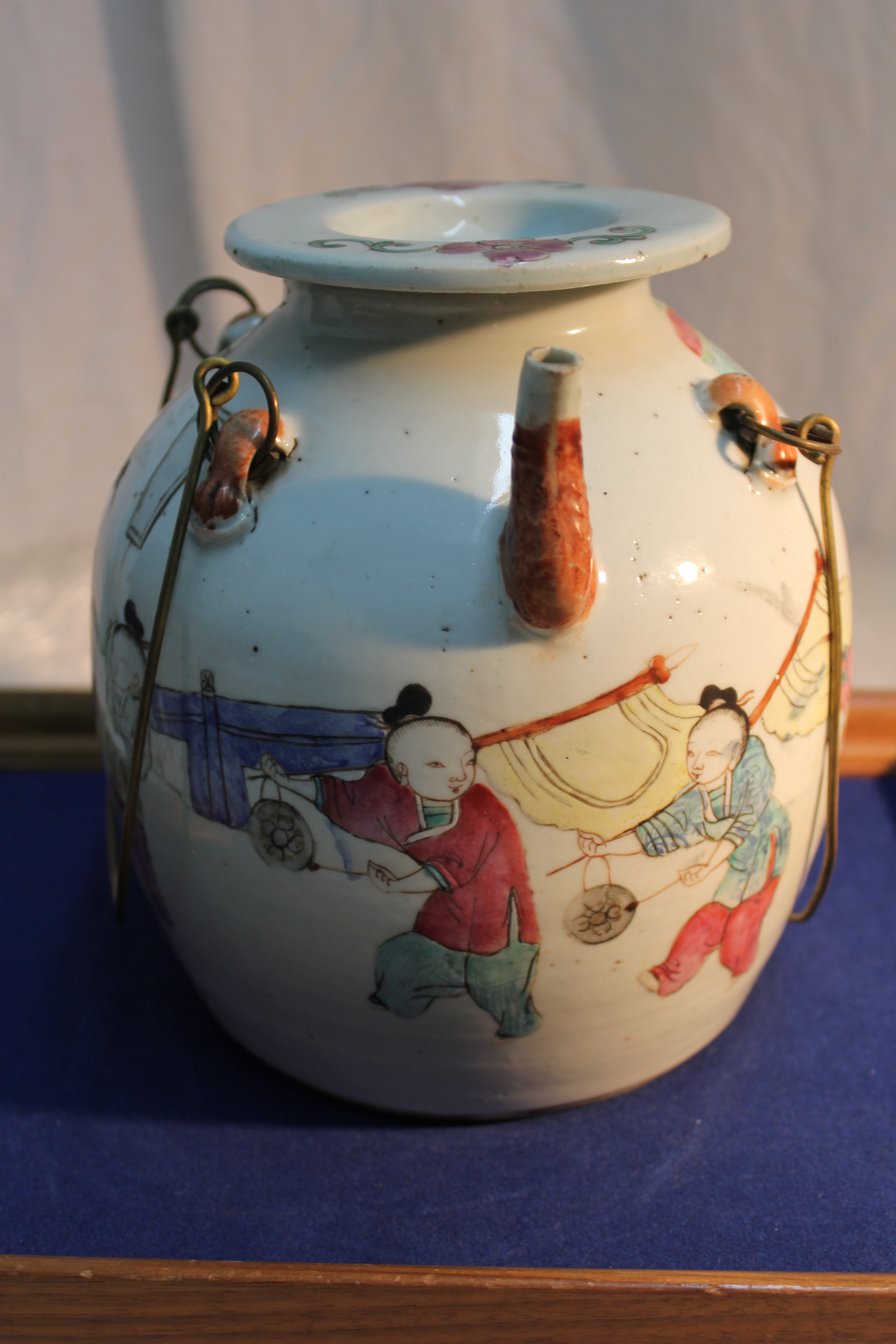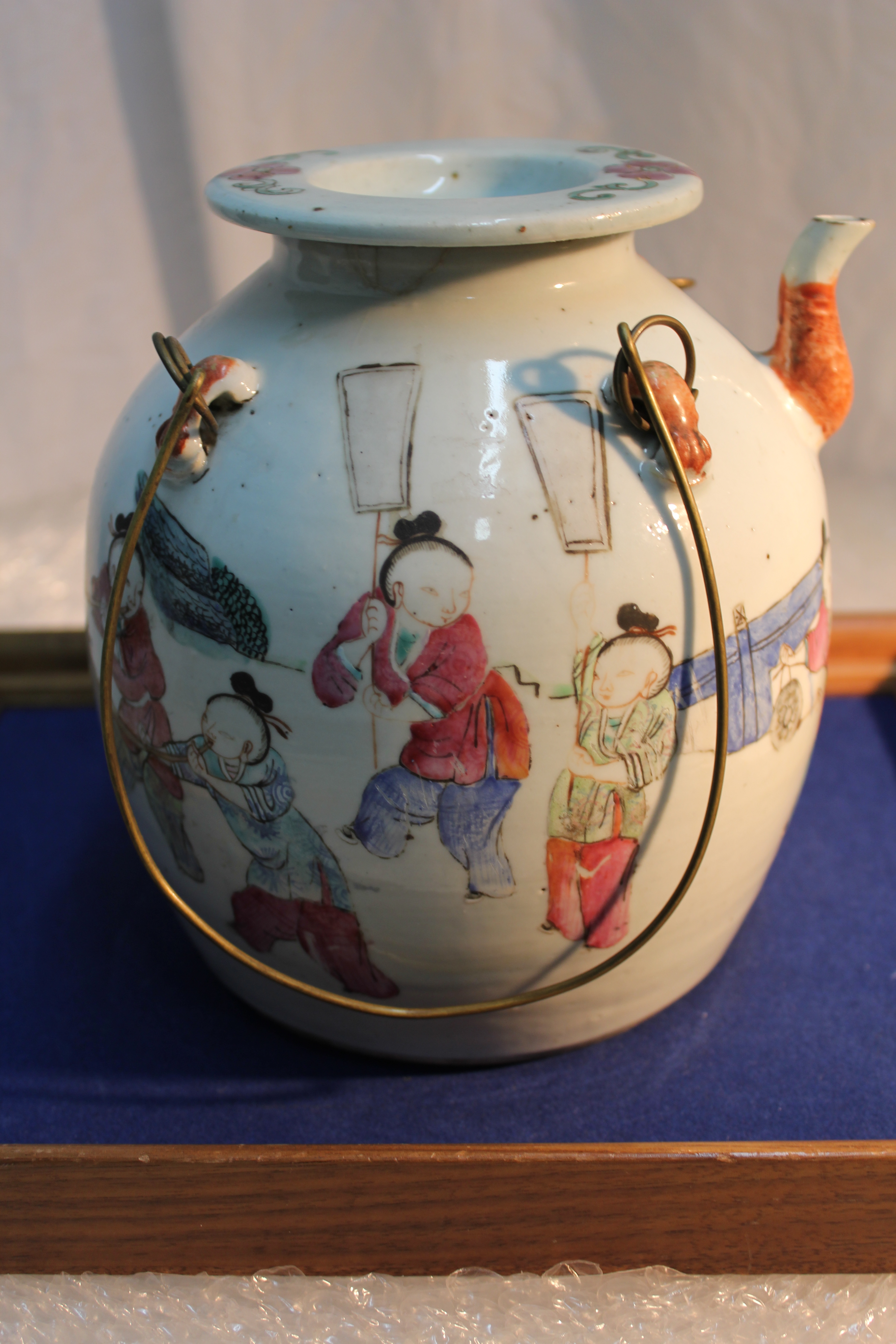 Chinese porcelain teapot with pictures of colorful people and keling on it.