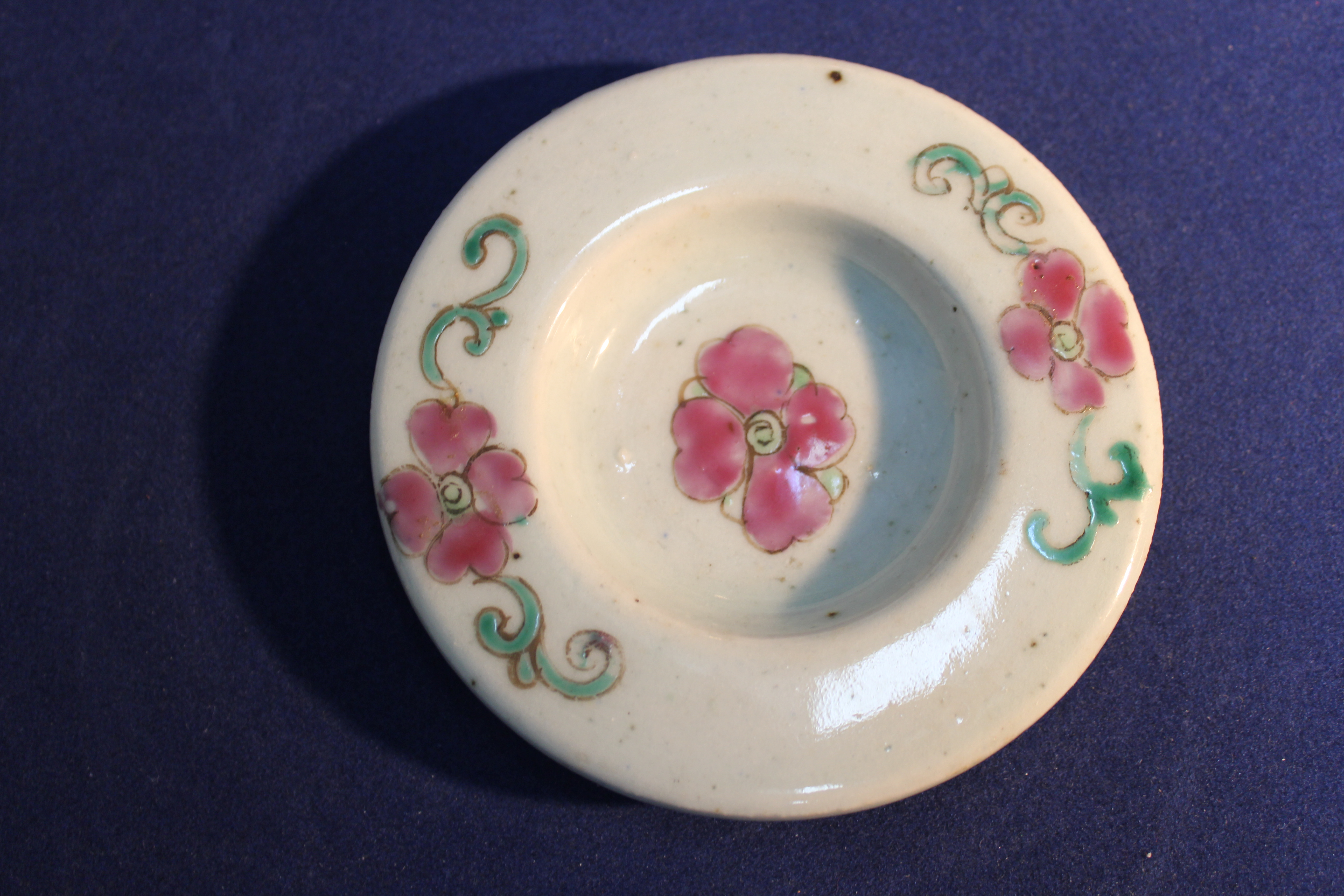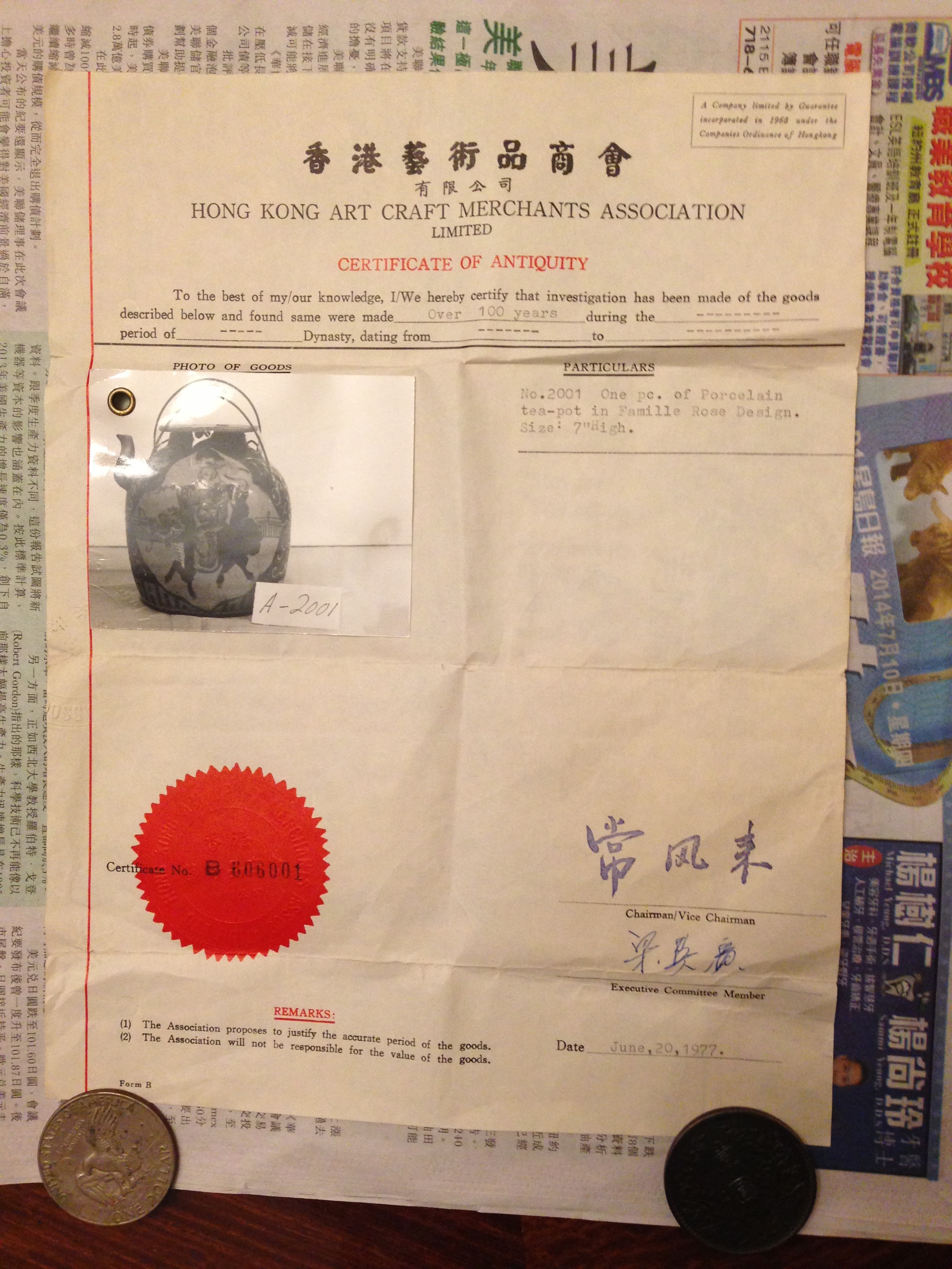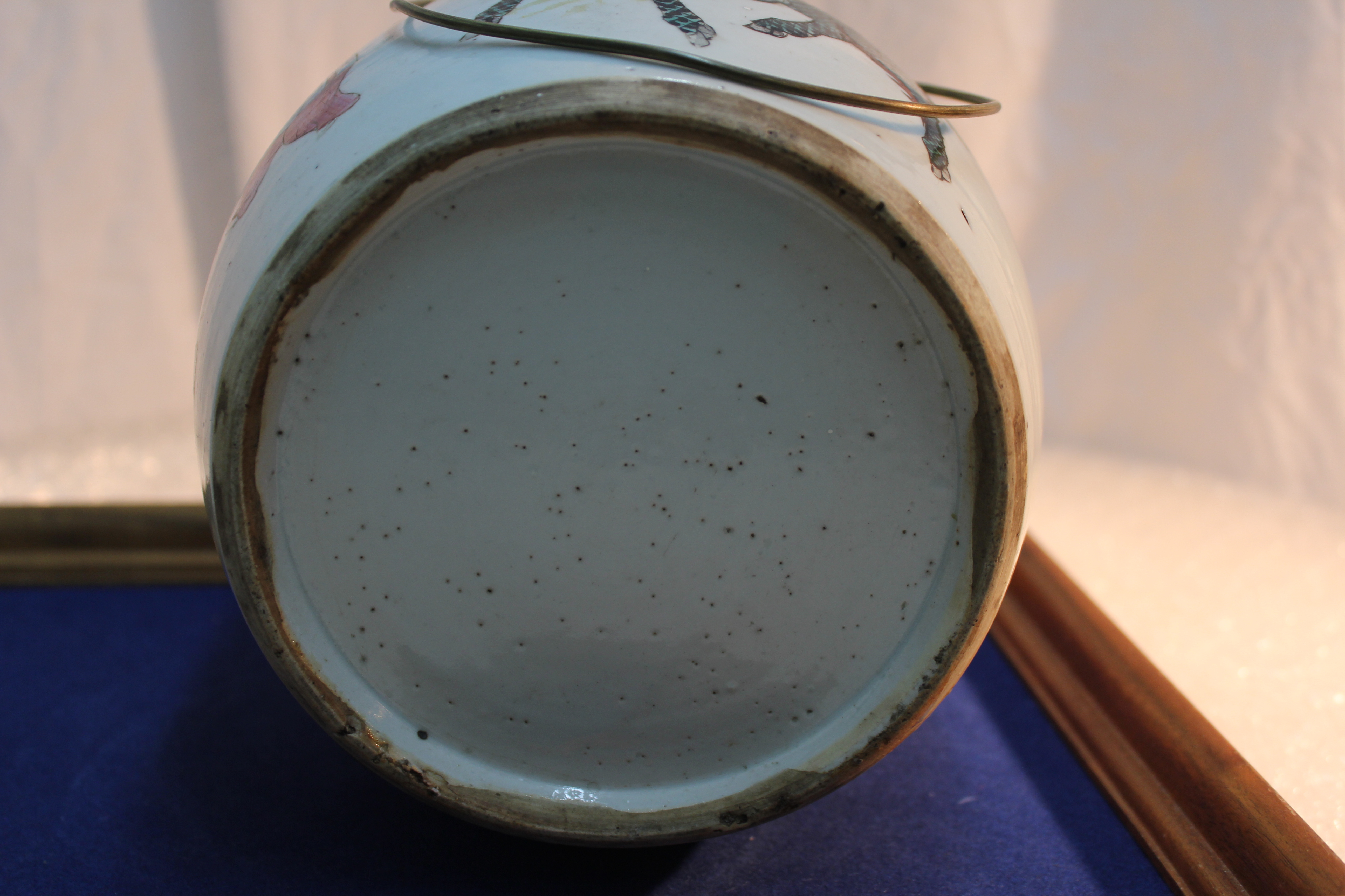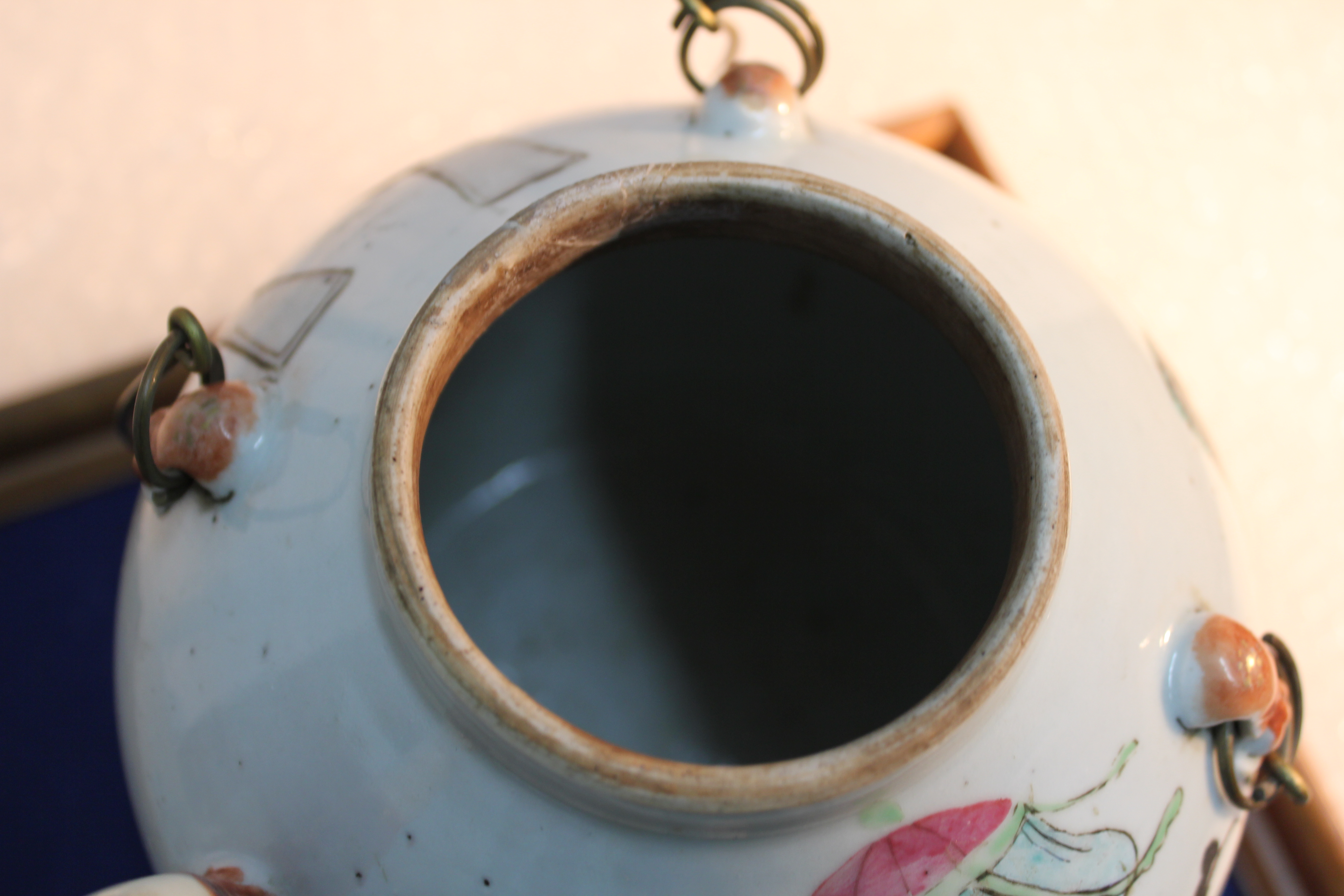 Chinese porcelain teapot with pictures of colorful people and keling on it.