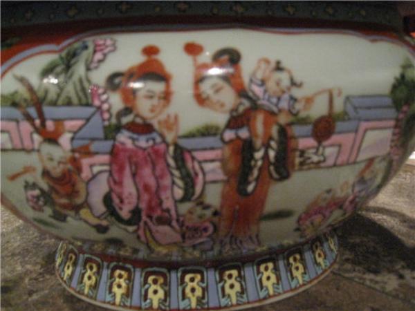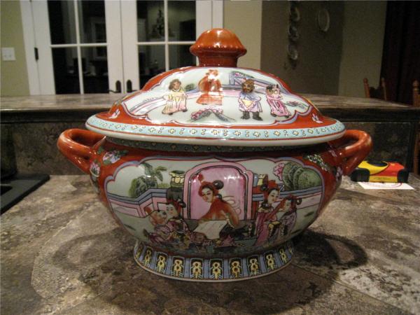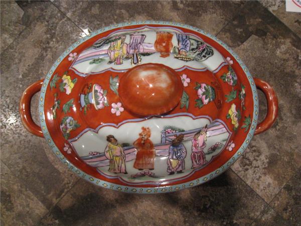 Beautiful vivid colors - mostly orange and most painted items are raised. There are no markings on it and I have no history... sorry. The only wear seems to be the lid "handle" and the handles themselves.