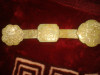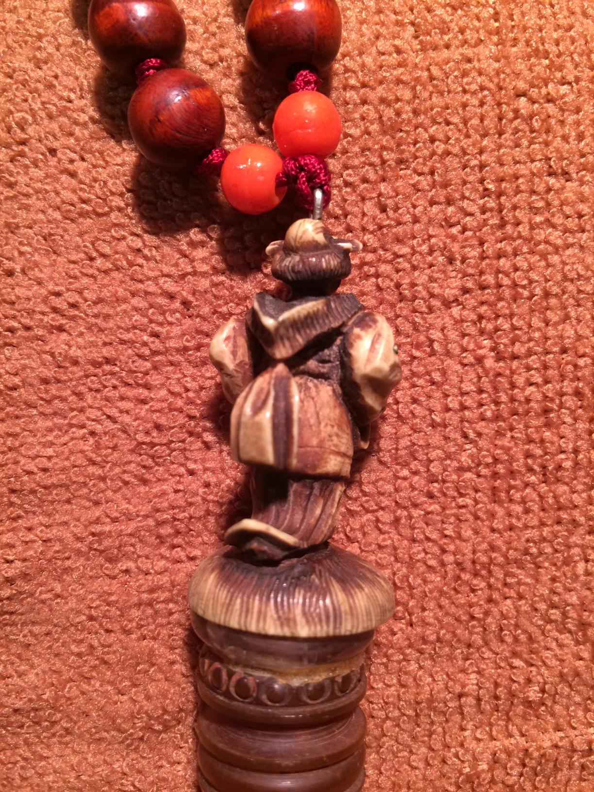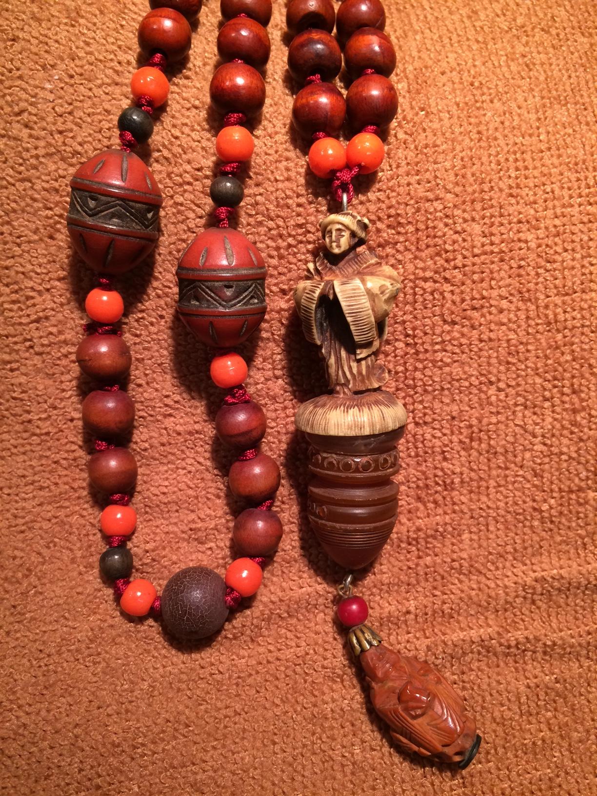 I am assuming that these are prayer beads. There are small polished orange, brown and black beads with larger carved beads at intervals like station beads of a rosery. Looks like the cord is red silk with a knot between each bead. The Geshia is carved ivory standing on an carved opaque brown stone. The final is a little man carved in a brown, maybe wooden bead.