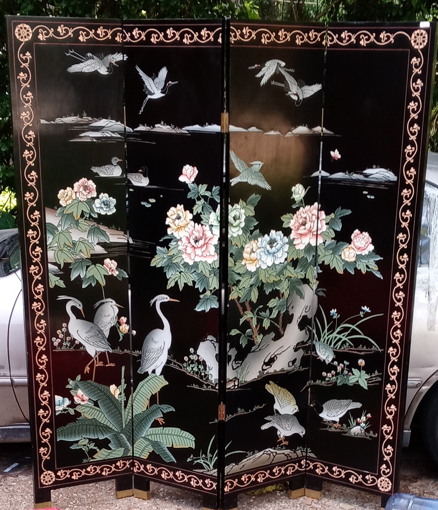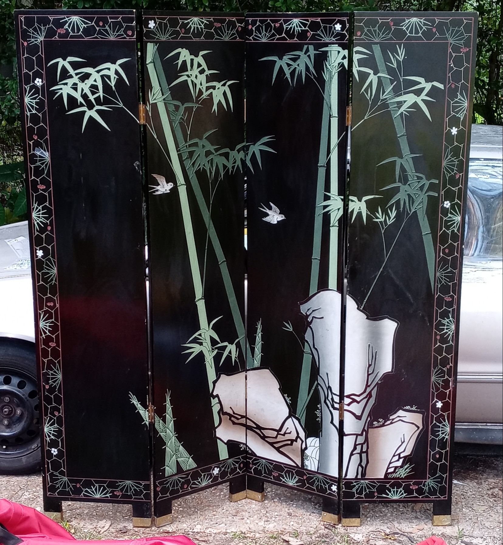 63" wide 72" tall 1" thick, solid wood fairly heavy, the designs were carved out before they were painted, different design on each side, has a sticker on the top corner thay says made in the peoples republic of China, and thats all I know about it .