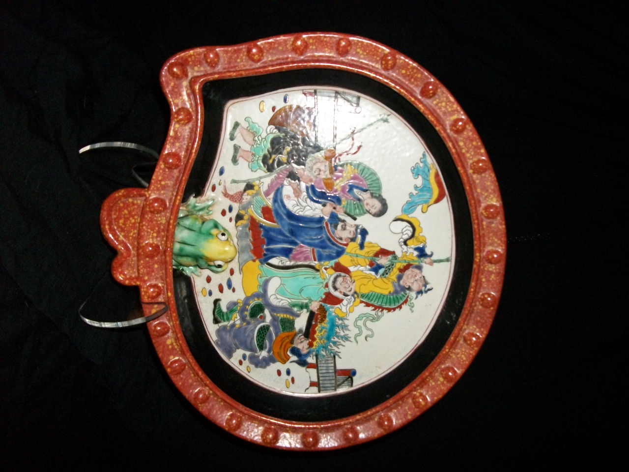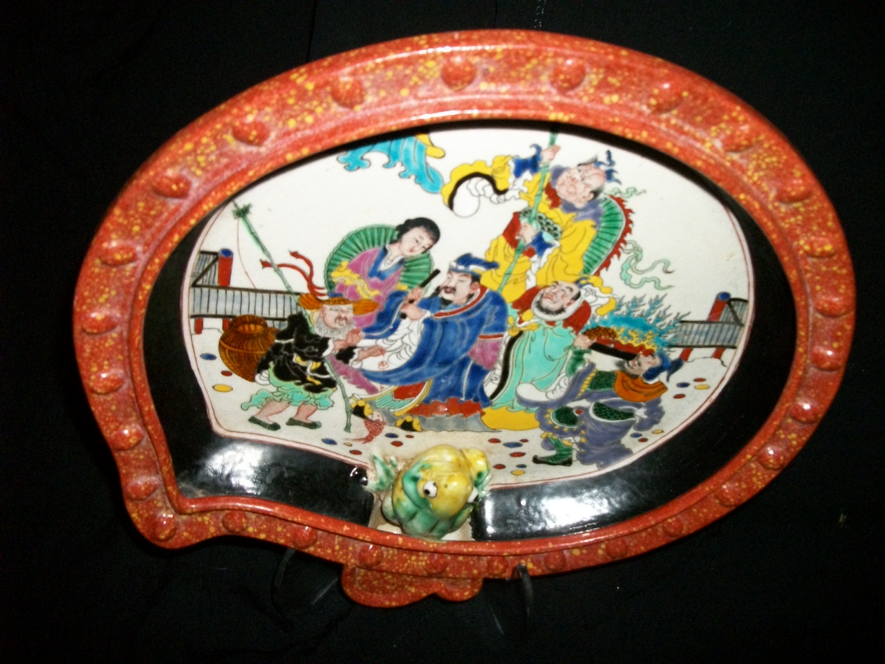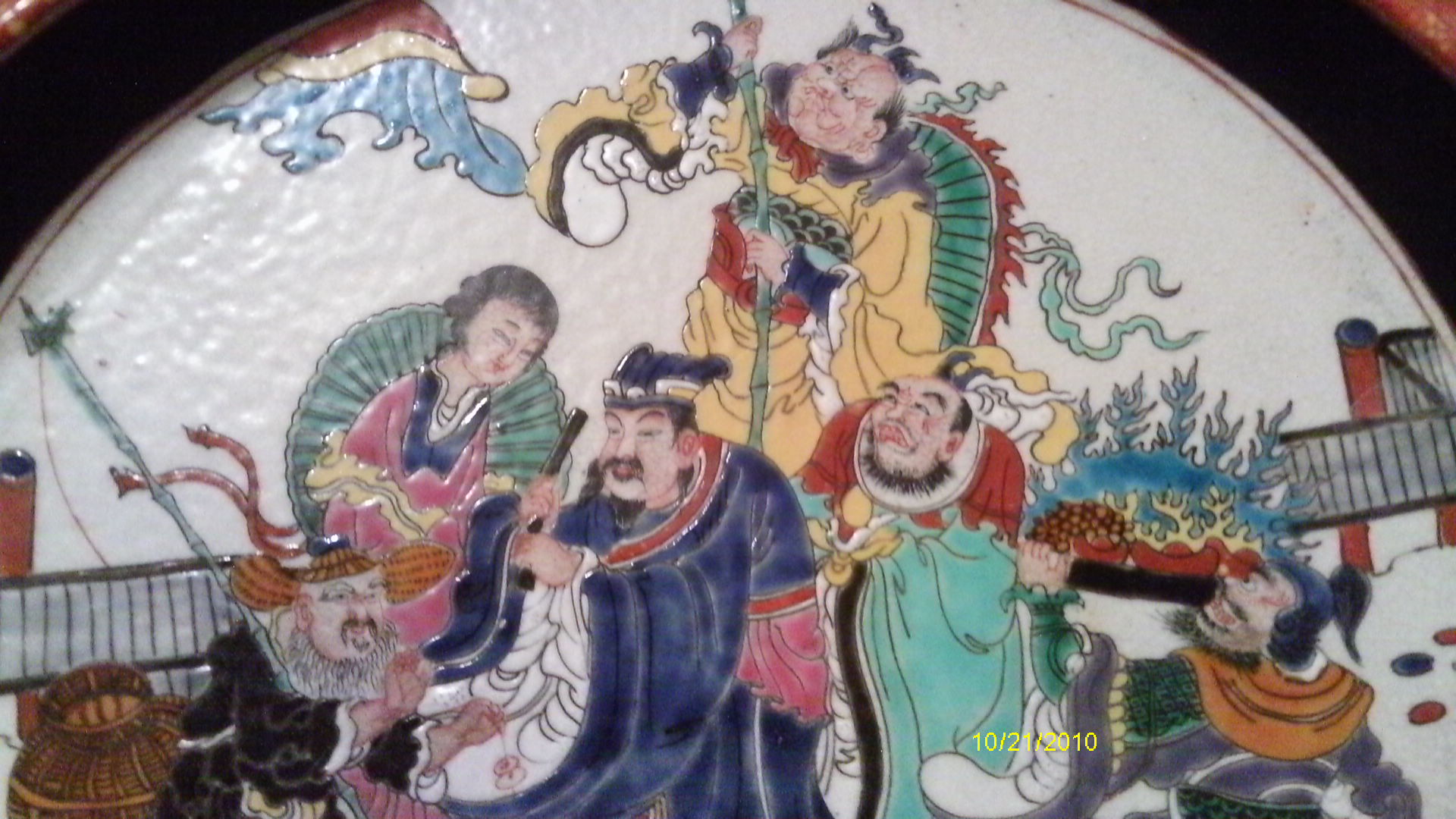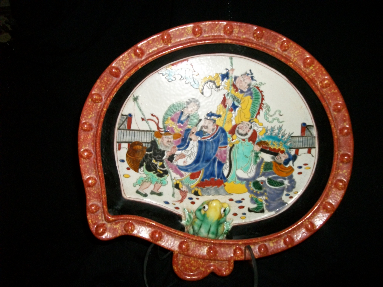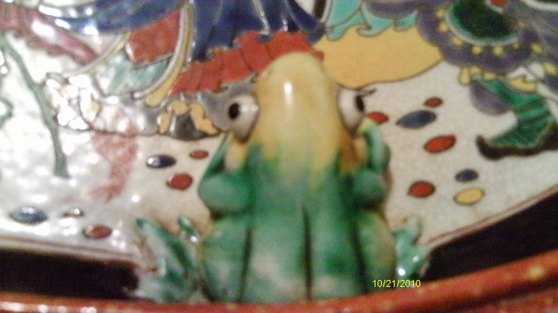 for over a year now-to no avail. It is an odd shaped heavy ceramic shallow bowl. It is Painted Bright Red with Yellowish spots (almost like spatter paint) on the outer rim which has a line of raised bumps along the middle of the top edge. As you can see, there is a frog perched on the edge of the bowl in full relief which appears to be watching the scene painted in the inside of the bowl with rapt attention.The inside walls of the bowl are painted black. The inside bottom of the bowl is painted with a gloss white, it features a hand painted outdoor scene featuring a dragon going upward which entwines itself throughout the scene behind the 5 different people painted within the scene.The bottom of the bowl on the backside has a blue 6 character Chinese Mark in the middle. We have our own theories about story it tells, but we have no idea whether this is new, old, where it came from, or what purpose it was created to serve. It is beautiful-with Bold Bright Colors-Kutani Style? We would appreciate any help with identification, history, value, etc. Thank you