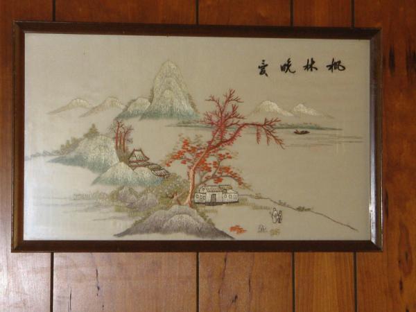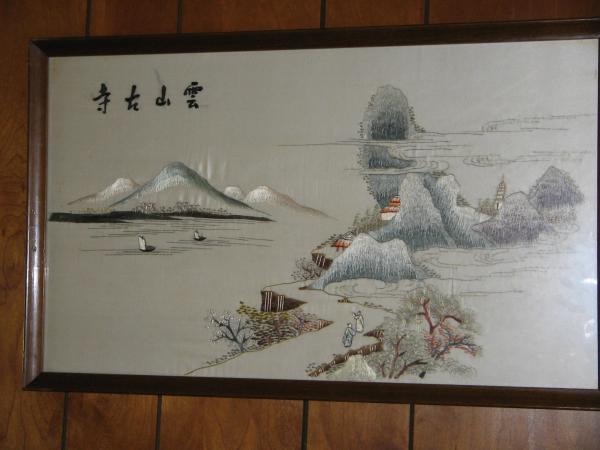 What I know about these silks is very limited (which is why I'm here). Both are water scenes, mountains and a country life type feeling to them. My grandmother sealed the frames with tape on the backs to keep them in good condition, so I have left them that way. I was told they're worth something, and to take care of them, that is about all I know. I know she had them for all the time that my mother or I can remember. She came from an affluent family, with travellers, and it was not unusual for their home to have valuable tems scattered throughout it. I just need a little help getting pointed in the right direction to find out what these are....thank you in advance!!
