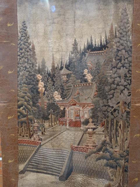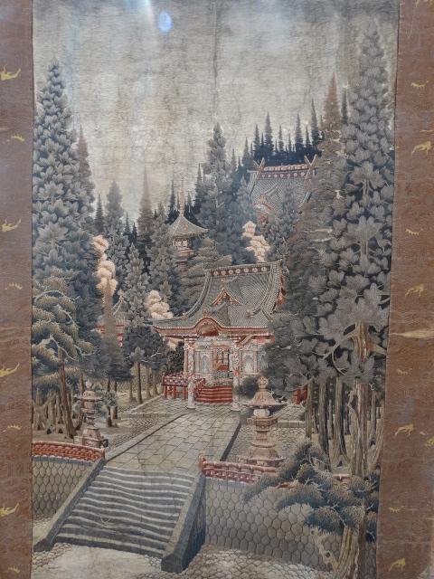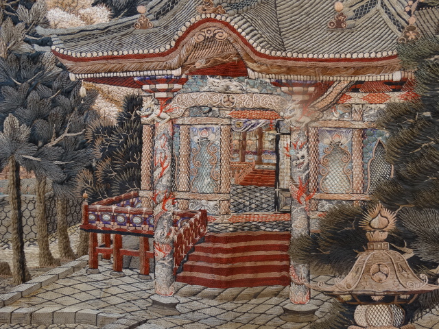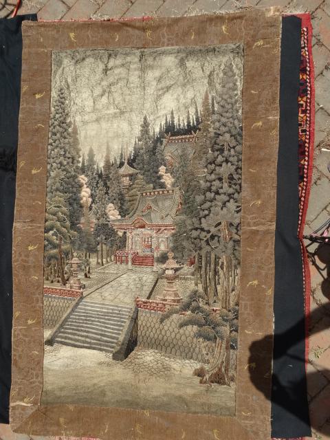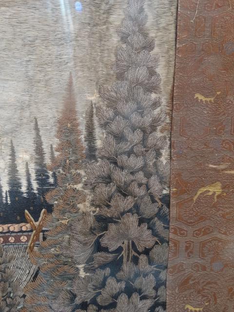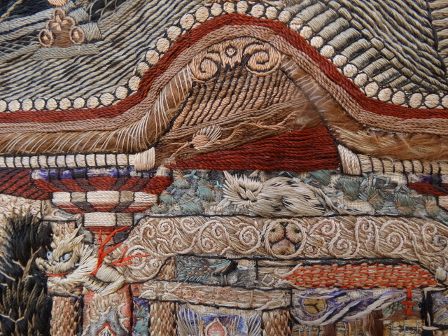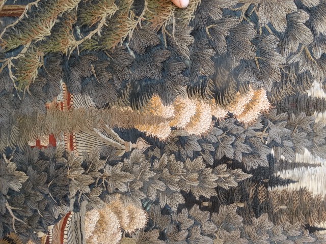 This is a silk embroidery measuring 74 x 48 inches that has a pattern in blue on back. It is made of twisted silk threads. We'd like to know the period and the type of embroidery we have. We may also like to pay for an appraisal. John