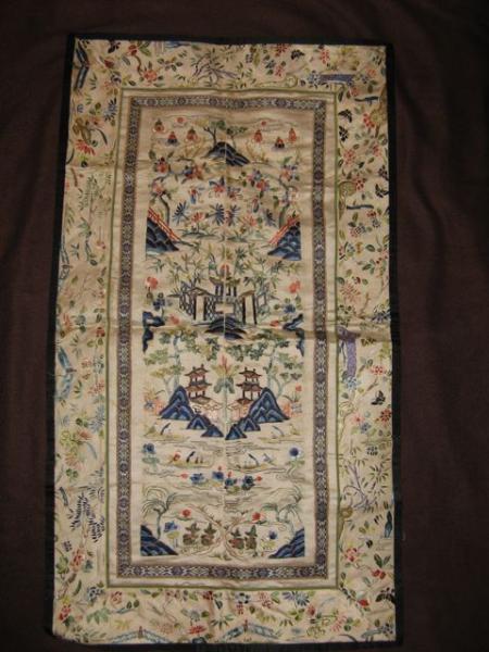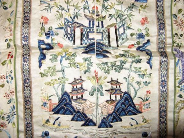 This was passed down to me in a collection of family heirloom textiles. The embroidery is in good shape and the ivory background is also fairly clean. There is one part of the border that needs to be sewn back down. The back is that typical Chinese green silk pattern and it says "Made in China". The colors are very vivid.