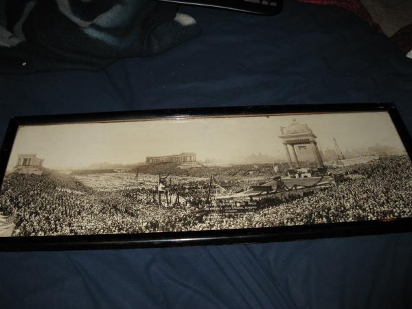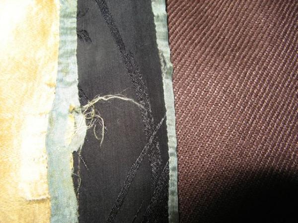 This piece has a vivid gold background. The embroidery is in good great shape but the border is in fair shape. The colors are vivid. There is one water stain on border edge. There is no sign as to where it was made. The back looks like cotton and is grey/blue.