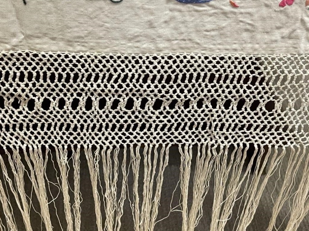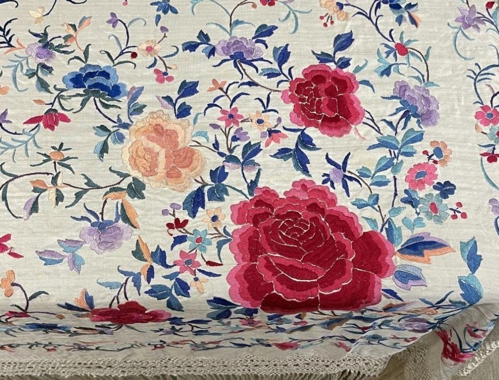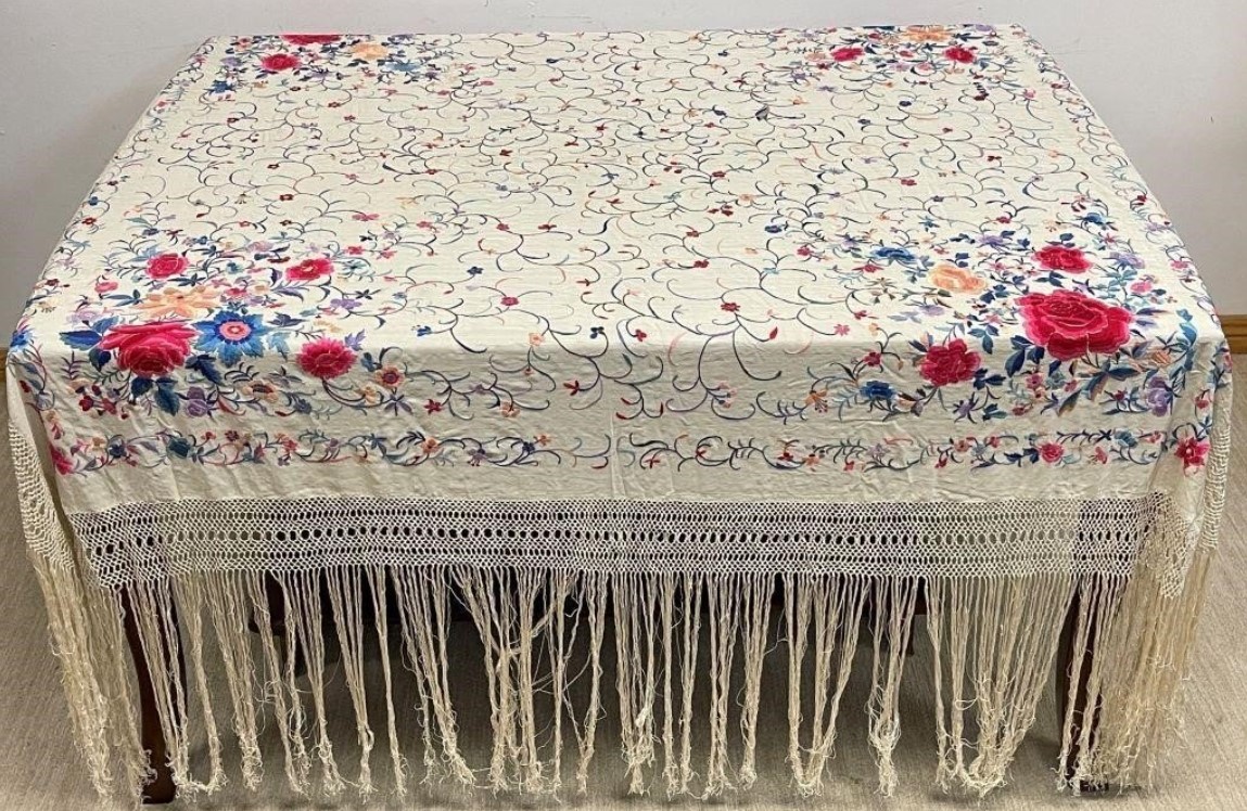 Very large signed Chinese silk embroidered piano shawl or Canton Manton De Manila. Excellent condition. No stains or holes. Minor fraying of fringe. Exquisite workmanship. Found in an attic in a Holt Renfrew box.