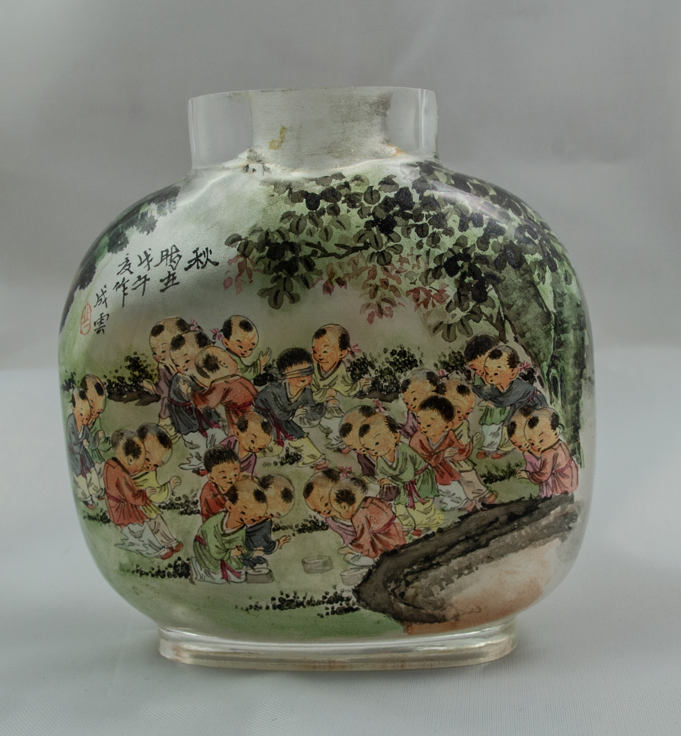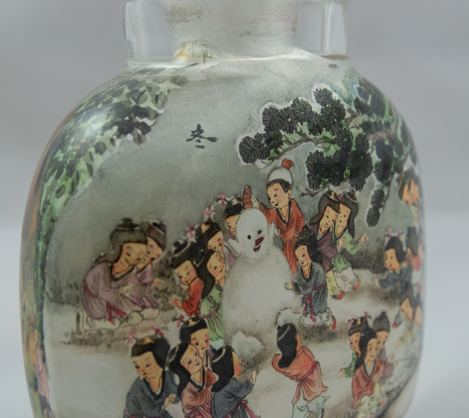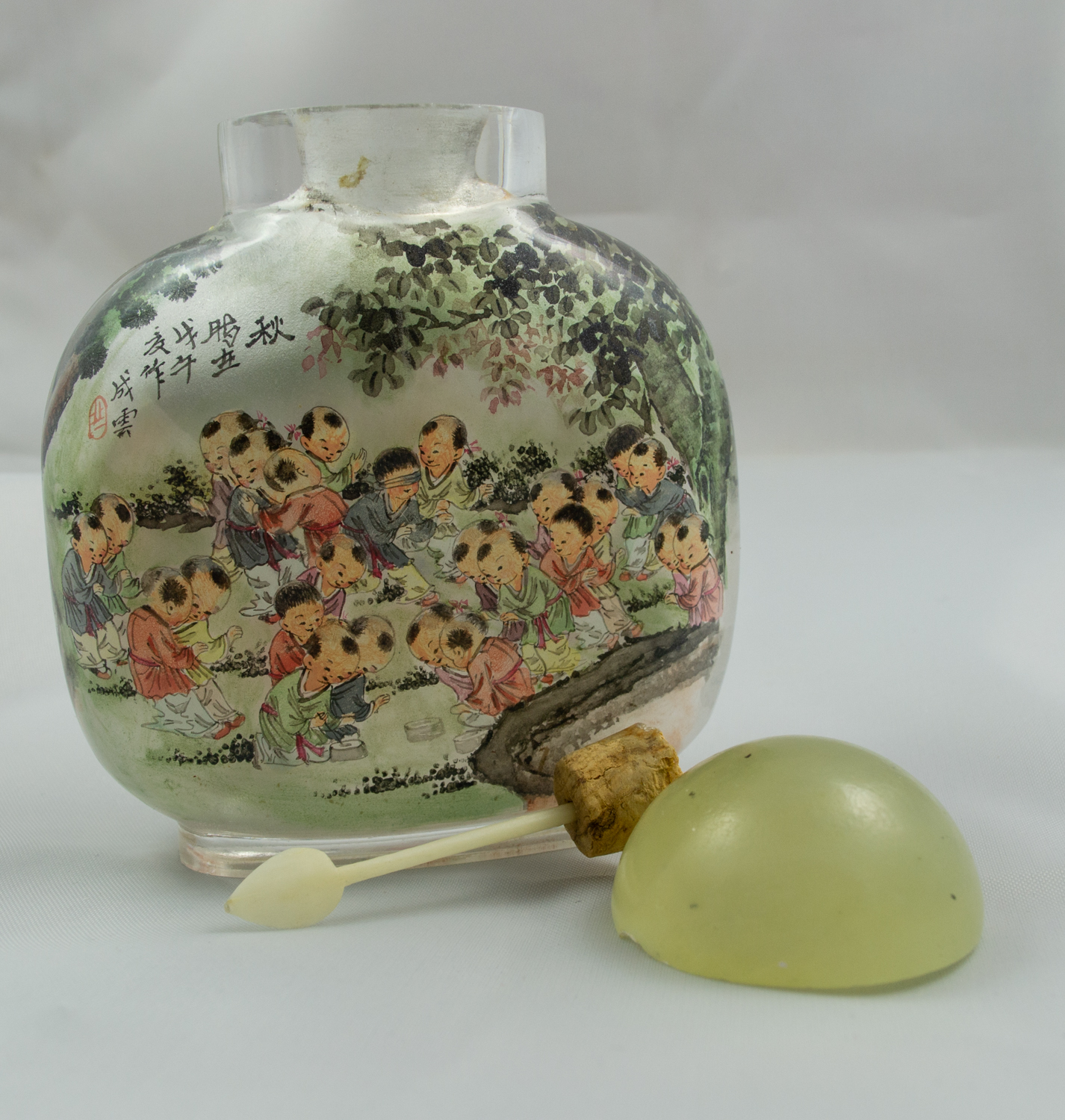 This Chinese snuff bottle is carved from one piece of rock crystal and features interior painted scenes. One side features a winter scene of children playing and Chinese Symbols, including one red symbol. The other side features a summer scene of children playing and one Chinese Symbol. Snuff bottle includes jade top and scoop, although the cork holding the scoop has separated from the top.