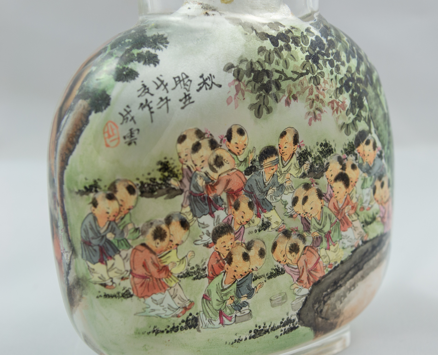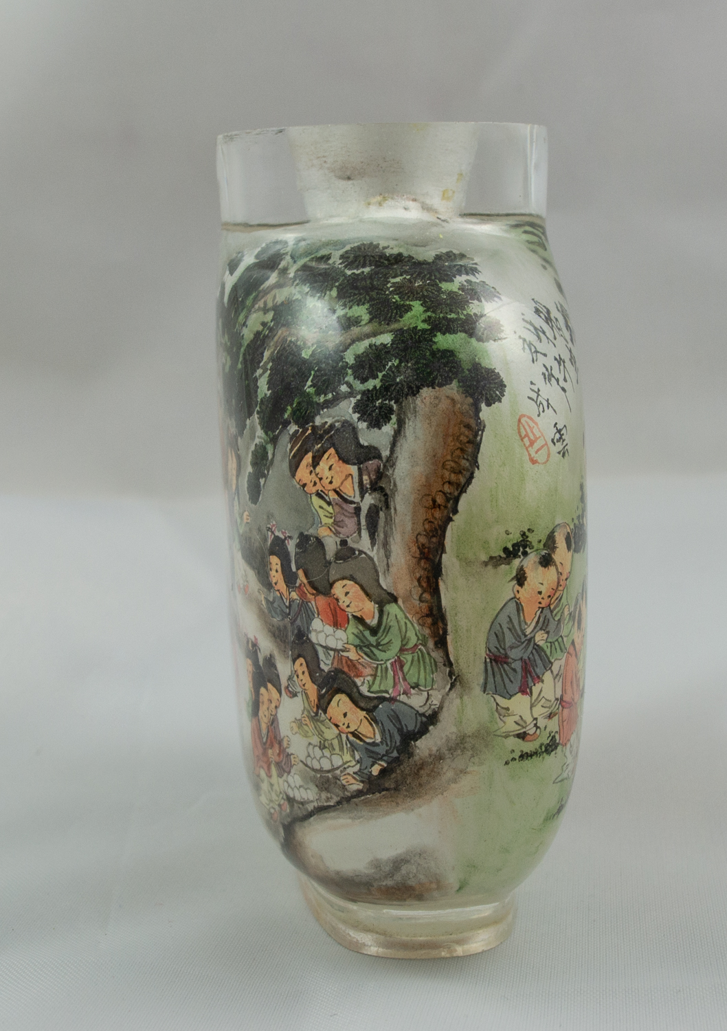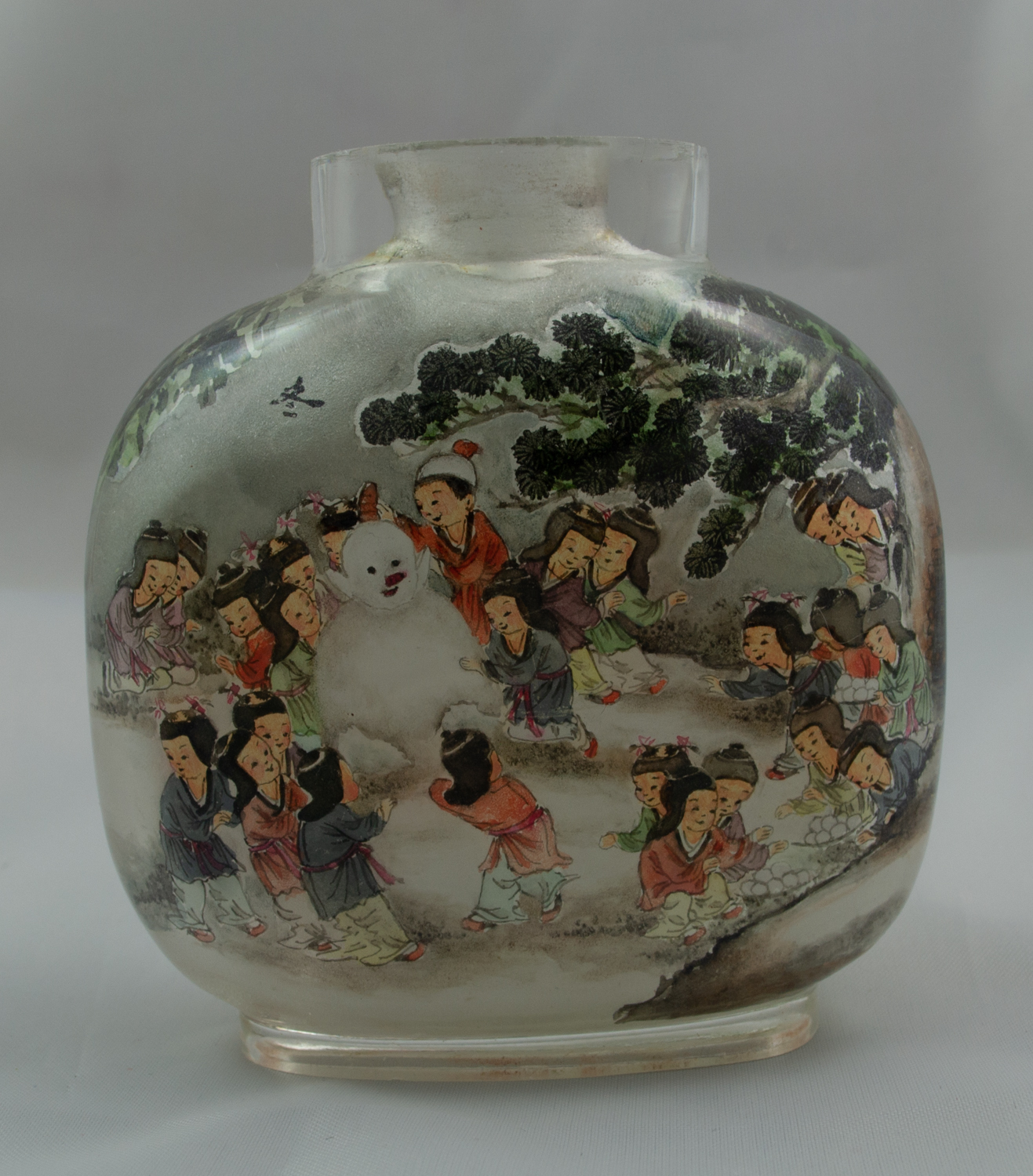 This Chinese snuff bottle is carved from one piece of rock crystal and features interior painted scenes. One side features a winter scene of children playing and Chinese Symbols, including one red symbol. The other side features a summer scene of children playing and one Chinese Symbol. Snuff bottle includes jade top and scoop, although the cork holding the scoop has separated from the top.